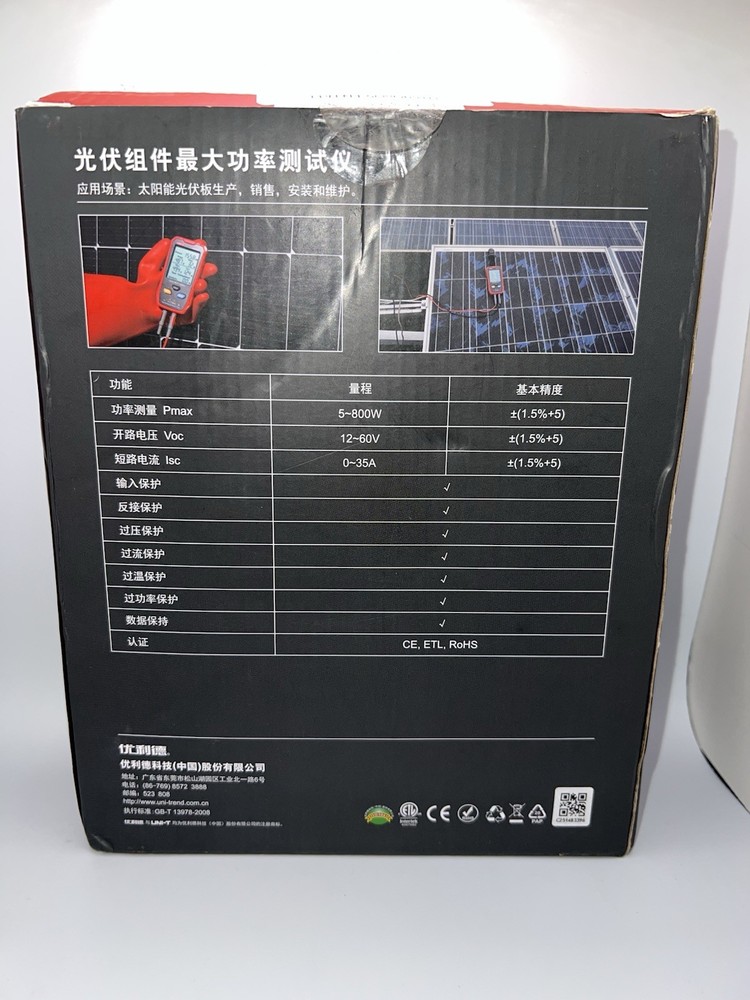 Weight: 1.19 Pounds Type: Solar MPPT Tester Model Name: Ut673Pv Brand: UNI-T Material: Abs Item Package Quantity: 1 Power Source Type: Solar Powered Part Number: Ut673Pv24 Included Components: Ut673Pv , Paper Manual, Cloth Bag, Mc4 Wrench Tool, Mc4 Test Lead gtin13: 6935750567333 Color: Red, Grey ISBN: 6935750567333 Package Dimensions LxWxH: 9.21x7.4x2.56 Inches EAN: 6935750567333 Model: UT673PV UPC: 6935750567333 Model Number: Ut673Pv