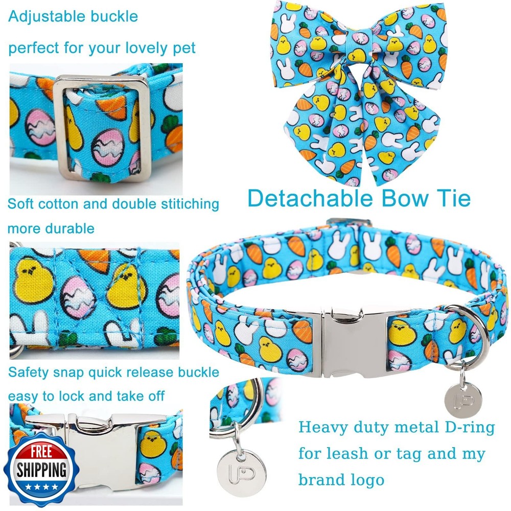 UP URARA PUP Easter Dog Collar with Bowtie, Easter Bowtie Collar for Puppy Girl Boy Dog or Cat, Cute Carrot and Rabbit and Egg Pet Collar with Metal Buckle, Easter Gift Dog Collar, XS Features ADJUSTABLE SIZE: UP URARA PUP Dog Collar-XS=5/8"(1.5cm) x 8.66"~11.81"(22cm~30cm). We strongly recommend that you measure your pet’s neck to ensure buy the right pet collar according the size chart. EASTER BOW TIE COLLAR: Classic carrot & rabbit & egg collar is especially suitable for Easter Day. Easter dog collar better shows your dog’s charm. Easter bowtie is detachable and well-made with elastic loops that let you take the bow tie off and on with ease. HIGH QUALITY MATERIAL: Premium cotton fabric doesn’t harm your dog’s skin. It’s safe, soft, durable, thick. Sturdy metal buckle/clasp is easy take on and off. NOT cheap plastic. Metal D-ring for adding dog tags,leash and ID tag. UNIQUE CRAFTSMANSHIP DESIGN: Carrots & Rabbits craftsmanship collar suitable for Easter Day. Pretty collar is great gift for dressing up your dog. ATTENTION: Don't let your dog bite the collar and bow. You may not receive exactly the same pattern as the picture, because the fabric used to make the collar is cut randomly. If you have any questions, please feel free to contact me. I will be at your service 24 hours a day. Shipping Free & Fast Shipping: We offer free shipping to most of the USA with a normal delivery time of 3-7 days. However, due to the current situation, additional delivery time (up to 3 weeks) may be required for some items. Alternative Carriers: We may use alternative carriers (e.g., USPS, FedEx, UPS) to ensure your package arrives safely and on time. Due to the use of multiple carriers, we are unable to provide a tracking number automatically. Handling Time: Orders are processed and shipped within 1-2 business days of receiving cleared payment. Shipping Restrictions: Shipping to Alaska, Hawaii, Puerto Rico, Guam, and other US territories may incur shipping charges or delivery restrictions. Please contact us before ordering, or your order can be refunded/cancelled. State Restrictions: Certain items may not be shipped to California due to state regulations. Contact for Tracking Updates: If you require tracking updates or have any concerns about the delivery of your order, please feel free to contact us, and we will be happy to assist you. Return Policy 30-Day Hassle-Free Returns: If you are not completely satisfied with your purchase, you can return the item for free within 30 days of receiving it for a full refund or exchange. Easy Return Process: Contact us, and we will provide you with a prepaid return shipping label and detailed instructions. No Restocking Fee: There are no restocking fees for returns. However, the buyer is responsible for return shipping costs if the return is not due to a seller"s error. Refund Processing: Refunds will be processed within 1 business day of receiving the returned item in its original condition. Feedback Your feedback is extremely important to us. We strive to provide the best products and customer service possible. If you are satisfied with your purchase, please take a moment to leave us a positive review. If you have any concerns or issues with your order, please contact us before leaving negative feedback. We are committed to resolving any problems and ensuring your satisfaction. Contact Us If you have any questions or concerns, please feel free to reach out to our customer support team. You can contact us through the eBay messaging system. We are available Monday to Friday, 9:00 am to 5:00 pm EST, and we will do our best to respond to your inquiry within 24 hours. Thank you for supporting our small family business!