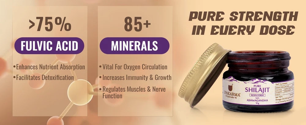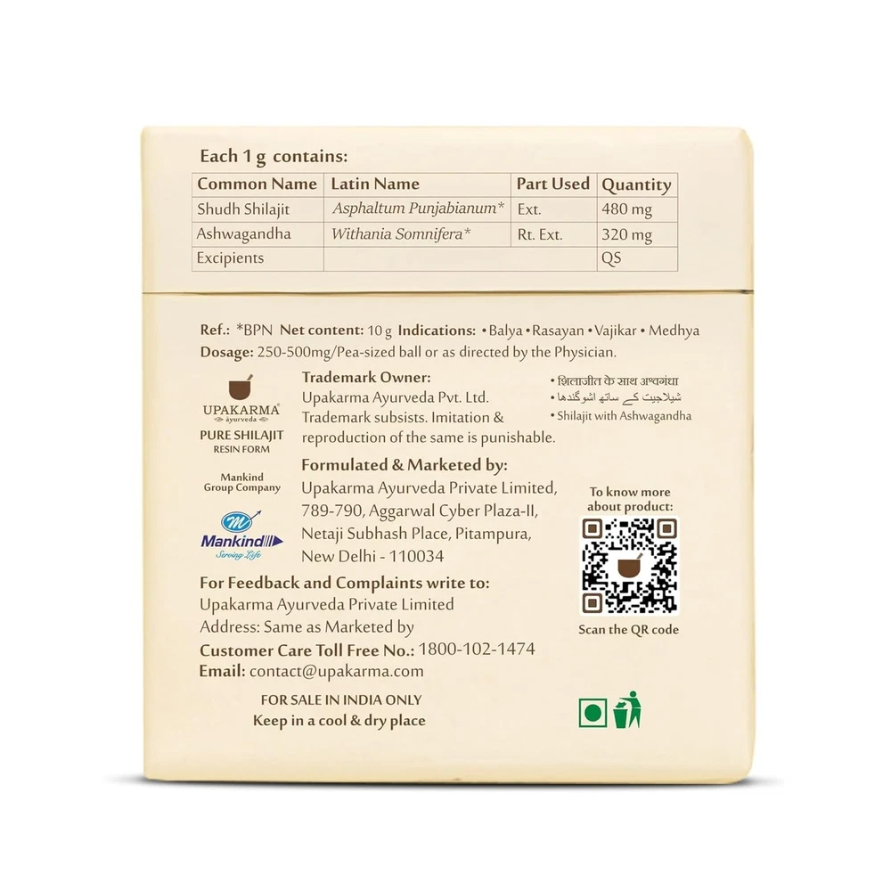 About this item Enhances Physical Strength - Shilajit with Ashwagandha helps in boosting strength by providing essential nutrients and promoting muscle growth, enabling the body to perform better to attain your physical goals. This powerful combination revitalizes the body, and helps in enhancing stamina and endurance Builds Muscle Mass - Shilajit contains more than 80 essential minerals that help in energy production and muscle recovery, while Ashwagandha helps in enhancing muscle growth & strength Improves Vigor & Vitality - Shilajit helps in enhancing nutrient absorption, detoxifying the body, and strengthening overall physical well-being, while Ashwagandha helps in reducing anxiety and maintaining hormonal balance. Together, they promote vigor, stamina, and overall well-being Boosts Immunity - Shilajit is well-known for boosting the immune system. It contains a potent blend of minerals that helps in enhancing the body's natural defense system, while Ashwagandha revitalizes the body and promotes mental calmness. Together, they increase energy levels and strengthen overall immunity Reduces Stress & Anxiety - Shilajit supports the nervous system, while Ashwagandha promotes relaxation by regulating cortisol levels. Together, they provide adaptogenic properties that help in managing stress and promoting overall well-being Improves Sleeping Pattern - Shilajit is rich in minerals and fulvic acid, which helps in enhancing overall health and vitality. Ashwagandha is an adaptogenic herb that helps in reducing stress & promoting a sense of calmness. Together they help in promoting sound sleep Assured Quality - With Upakarma, you get the best quality in the segment as all our products are 100% natural and go through 7+ levels of quality checks, which are also AYUSH approved and GMP Certified How To Use - Take a pea-sized amount of Upakarma Shilajit Resin with Ashwagandha and dissolve it in 100 - 200 ml of lukewarm milk or water. Stir it thoroughly and drink. For best results, it is advisable to consume twice a day or as directed by the physician