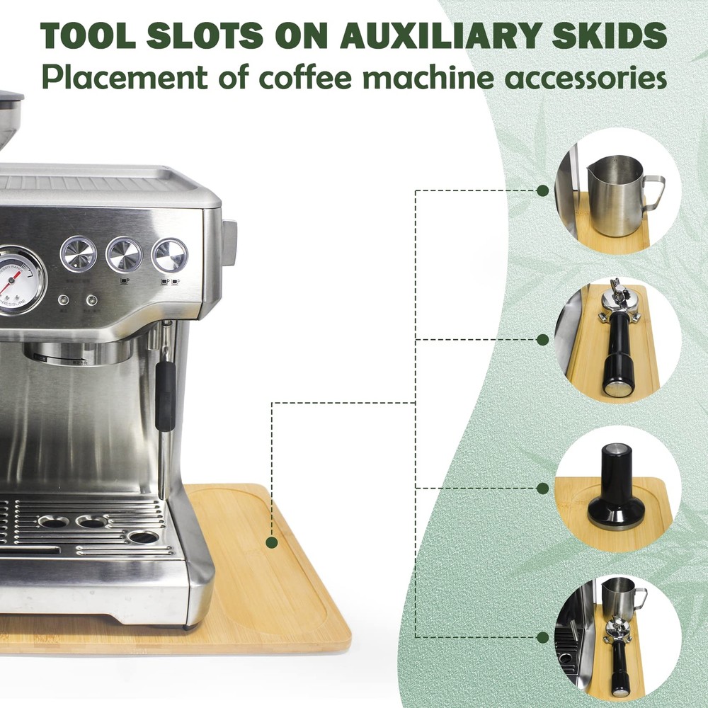 【Compatible with】 This Bamboo Appliance Slider is specially design fit for Espresso Machine size less than 12.8in*17in 【Protective function】 This coffee maker slider for counter not only protects the machine, but also your kitchen countertop 【Sliding Function】With this accessory for espresso machine, you can easily move the machine, you just need to push or pull the Mixer 【With Accessories Organizer】There is a storage slot on the side of the slider, where the Espresso tools can be stored. Keep the Countertop Clean and Tidy 【High Quality Material】This sliding tray for coffee maker is made of high quality bamboo, pure nature, smooth surface, no damage to the machine