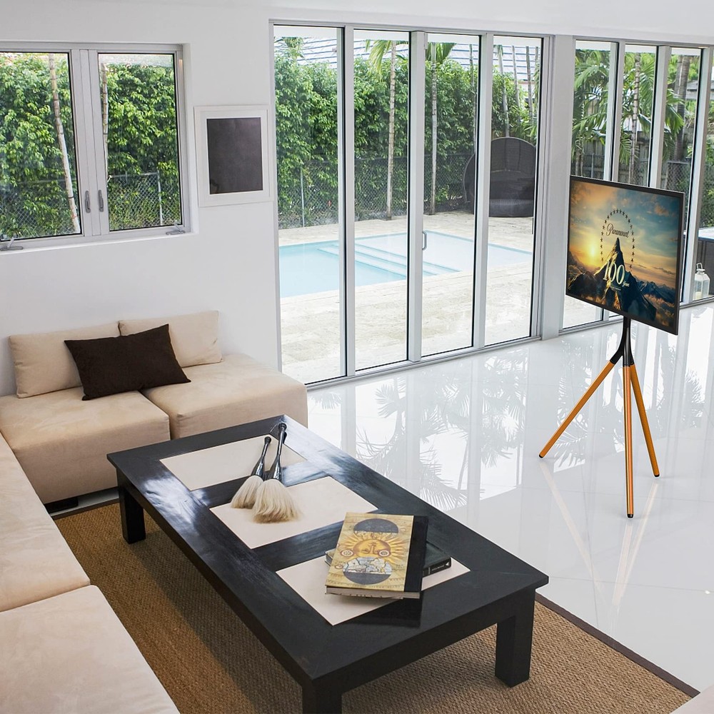 📝 Product Description Wide TV Compatibility: UPGRAVITY easel TV stand fits most 45" 50" 55" 60" 65" LCD LED flat screens weighing up to 77 lbs with VESA patterns 200x200mm, 300x200mm, 300x300mm, 400x200mm, 400x300mm, 400x400mm and 600x400mm. Please confirm the VESA, weight, size specification of your TV before purchasing,Swivel & Height Adjustable: The TV tripod stand features 180°swivel left and right to help you find the optimal viewing angle for all types of TV screen panels. Height adjustment is also provided along the 23.8" center pole by locking the height collar at your desired position,Secure & Stable: Constructed of high quality beechwood with solid tripod legs, this modern TV stand is quite steady and durable. It also comes with anti-tip strap kit to avoid toppling in case of unexpected bump. Anti-scratch rubber feet are designed to protect your carpet and floor,Minimalist, Sleek Design: The low profile TV stand tripod blends well in any room for a cool minimalistic look. Thanks to its chic, slim design, this TV display stand is portable and space-saving, perfect for small apartments, bedroom, living room, patio, office, studio, exhibition hall and more,Easy to Install: Assembly is easy with all the necessary hardware and fixings included in delivery. Cable straps are provided to help organize all the messy wires and cables behind the tripod leg for a neat appearance 📋 Specifications color Black model cg-1964 style modern material Wood itemWeight 13.05 pounds partNumber cg-1964 manufacturer UPGRAVITY productDimensions 10.0 x 5.2 x 35.0 inches ✓ Fast Shipping | ✓ Quality Guaranteed | ✓ Customer Support 30-Day Returns • 100% Satisfaction