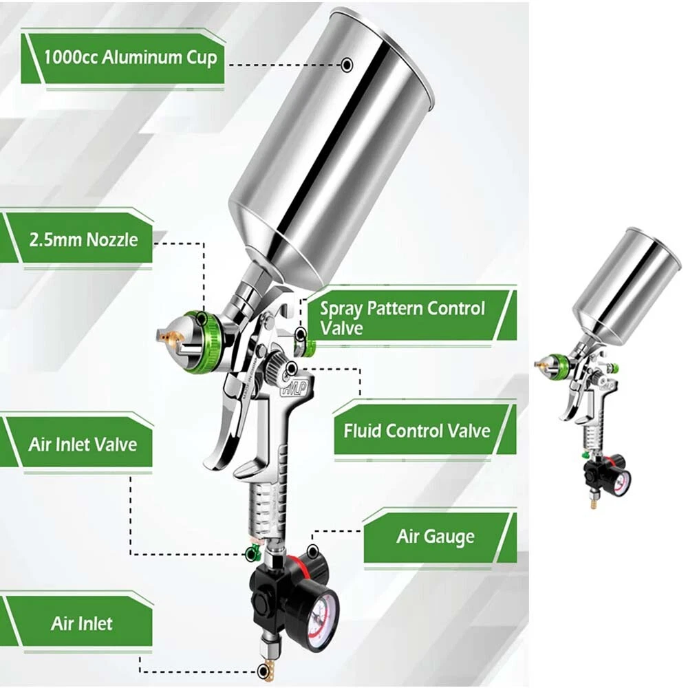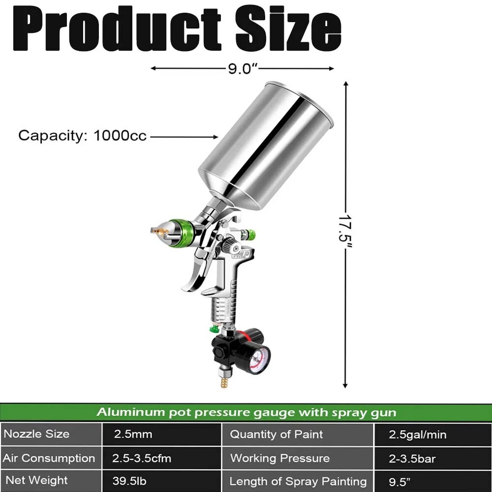 SAFE & SECURE SHOPPING 100% SATISFACTION GUARANTEED FAST SHIPPING 2.5mm HVLP Gravity Feed SPRAY GUN Kit W/ Regulator Auto Paint Primer Metal Flake Product Description If there are any problems after you purchased, please feel free to message us firstly, we will definitely give you a satisfying solution. Please don't leave neutral or negative feedback or open a return request without any communication. Features: HVLP Spray Gun with 2.5mm Nozzle Size 1000 cc Aluminum Cup 3-Level adjustment with air gauge improve the accuracy of painting 2.5mm nozzle provides even and atomized spray patterns. 1000cc aluminum cup allows you to spray thicker material The HVLP spray gun has wide application not only on household, but also auto jobs Specification: 100% BrandNew Material:stainless steel Nozzle Size: 2.5mm Capacity of Aluminum Cup:1000cc Paint Quantity: 2.5gal/min Air Consumption: 2.5-3.5cfm Air Pressure:2.5-3.5bar Package included: 1 x Spray Gun 1 x Barometer 1 x Aluminum Cup 1000cc 1 x Oil Filter 1 x Extension Rod 1 x Spanner 1 x Cleaning Brush Shipping Returns Payment Contact US Shipping How long does it take to ship out of the USA warehouse? Orders ship out within 24-48 business hours on average. Normally same day if before 1PM EST. How long does delivery to my address take? Delivery is determined by the type of shipping you go with. Normally, all orders from US warehouse are delivered within 3-7 business days. Many things can play a factor such as Location, Weather, and the items in the order. Hope you can understand it,If you have any questions, please email us , we will help,thanks. International package usually takes about 7-20 days to reach you. We only ship to confirmed Ebay addresses. Your Ebay address MUST MATCH your Shipping address. Returns ▲▲▲ Please contact us first before you sent a return request ▲▲▲ Any problems you meet, we will help to solve it,We will ensure that customers do not suffer losses, please don't worry.Trust us!!! 1) No NEED TO RETURN . If you received an incorrect, damaged, defective, or item not as described, Just Contact us directly by ebay messages,send us the photos, videos, we will give you the partial or full refund or replacement on our cost. 2) If you sent a return request ,please selete the reason for return: Changed my mind/Just didn't like it/Order by mistake .Thanks for your cooperation. Return products must also be in its original condition: including box, packaging and all other accessories. Please email us your return tracking number too,thanks. Payment We accept PayPal, MasterCard, Visa, American Express, Discover and etc payment. Immediate payment needs to be processed for items with Add to Cart option so that any promotional discounts can be applied to your order immediately. Please Note:The buyer is responsible for any applicable import duties and local taxes. Contact US Our Working Time: (GMT+8)Monday to Friday,9:00am-18:00pm. For inquires and customer support, please send your emails via ebay email system. All emails will be responded to within 24 hours during working days. Weekends Time will be responded to within 24-48 hours . Please be patient and give us some time, we will solve your problem ASAP. You can also send photos or videos for us to quickly answer your questions. Thank you very much,and thanks for your understanding. We appreciate your business and strived to improve our customer service and our commitment to quality. We will leave a 5-star positive feedback immediately after payment is received. We appreciate a 5-star positive feedback as much as you do.It is very important for us. Please DO NOT give us a neutral or negative review. We are a growing small store and we will do our best to improve every thing. Please give us a chance. Really!!! Appreciated!! NEED YOUR SUPPORT!!! Copyright © 2022 Tongtool