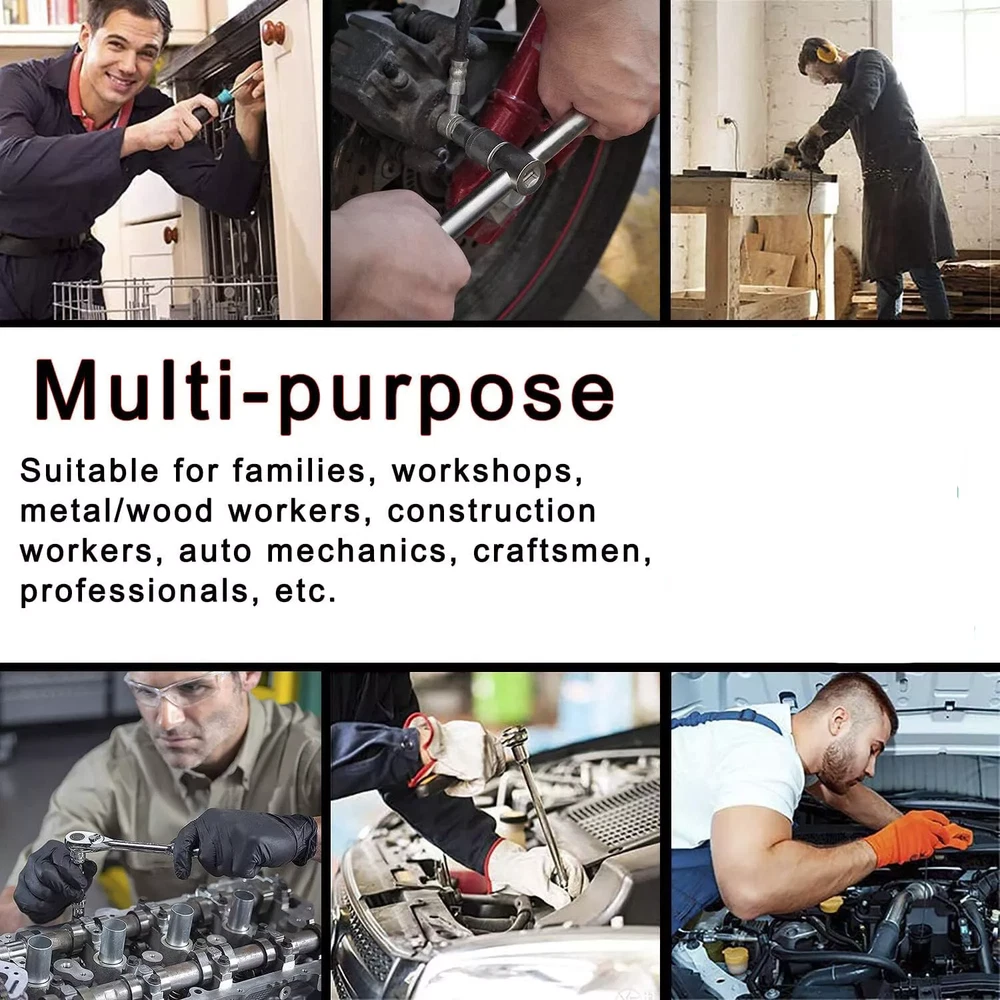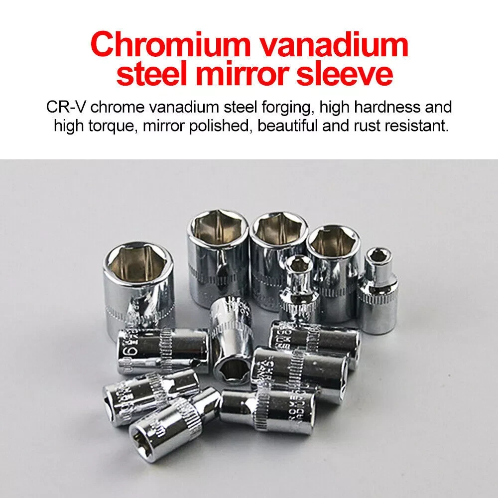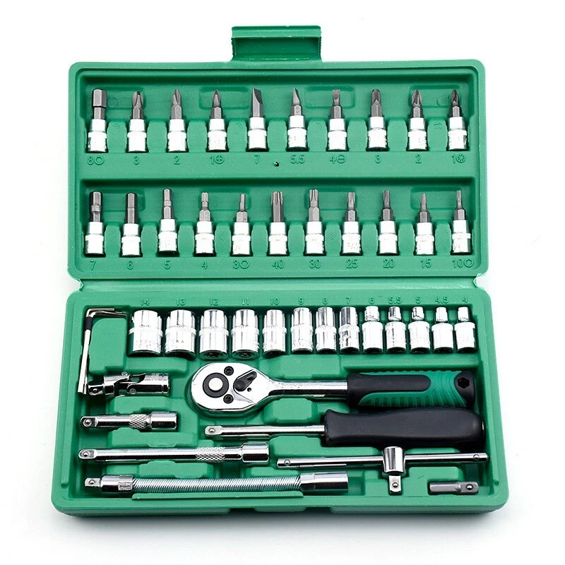 About this item HIGH QUALITY: The socket, screwdriver bit and wrench set are made of high-quality chrome vanadium steel for longer service life. All tools are highly polished and chrome plated. Durable Design: The locking ball design on the head of the extension can easily tighten and loosen the socket. Perfect for tradesmen, tradesmen, construction workers, mechanics, auto bike mechanics and more. Comprehensive Socket Kit: Comes with ratchet and extension rod, screw handle and socket converter. Switchable Ratchet Wrench: The included switchable ratchet has 72 fine teeth and a two-part handle provides more grip. You can quickly change the direction of the screw using the lever on your head. The ball lock ensures the nut is securely fastened. Specification: Number of tools: 52 pieces (46+6 pieces) Toolbox color: green 21-piece set of socket drill bits: -6 standard hex drill slots (#3, #4, #5, #6, #7, #8) -6 Allen key inserts (T10, T15, T20, T25, T30, T40) -3 slots for Pozidriver bits (#1, #2, #3) -3 slots for flat screwdriver bits (#4, #5.5, #7) -3 Phillips screwdriver slots (#1, #2, #3) 6-Piece Drill Bit Replacement Parts with Additional Socket: Allen key (T10) Standard hexagonal drill groove (#3, #8) Pozi screwdriver slot (#1) Slotted screwdriver bit (#4) Slot for Phillips screwdriver bit (#1) 13 1/4" hex socket: 4mm, 4.5mm, 5mm, 5.5mm, 6mm, 7mm, 8mm, 9mm, 10mm, 11mm, 12mm, 13mm, 14mm special function: - Push-button ball bearing quick release mechanism for quick and easy sleeve replacement. -Ideal for homes, garage workshops, metal/wood workers, construction workers, auto mechanics, hobbyists as well as DIY enthusiasts, professionals and more. -The axles are locked and equipped with two comfortable handles as well as forward and reverse switches and quick release buttons. -Black oxide protects drill bits from corrosion - Smooth, polished steel socket end allows for quick cleaning - With integrated push-button control, the ratchet is quickly ready for use -High tensile strength steel structure ensures strong torque - Precision cut screwdriver tip reduces chipping packing list: Socket wrench insert * 27 Hexagonal wrench*3 1/4 inch hex socket*13 1/4 inch quick release ratchet wrench*1 1/4" universal joint*1 1/4 inch flexible column*1 1/4" slider*1 1/4" short column*1 Extension column*1 Pop-up window*1 Interface small square rod*1 Toolbox*1