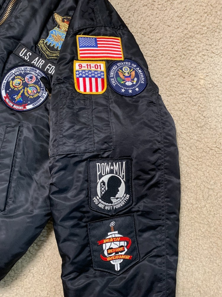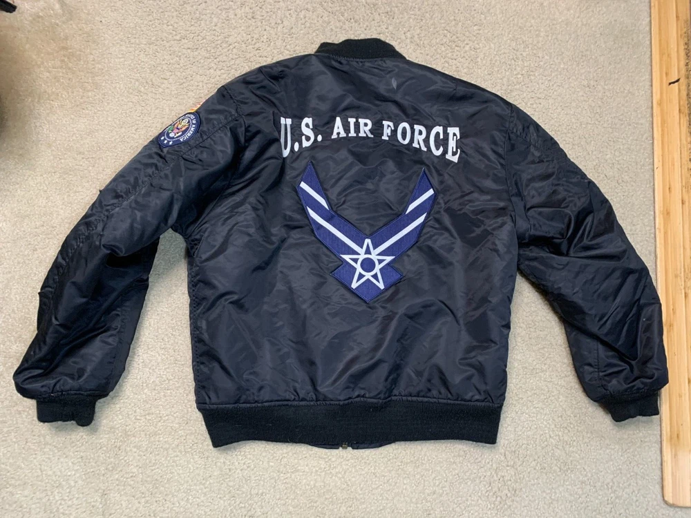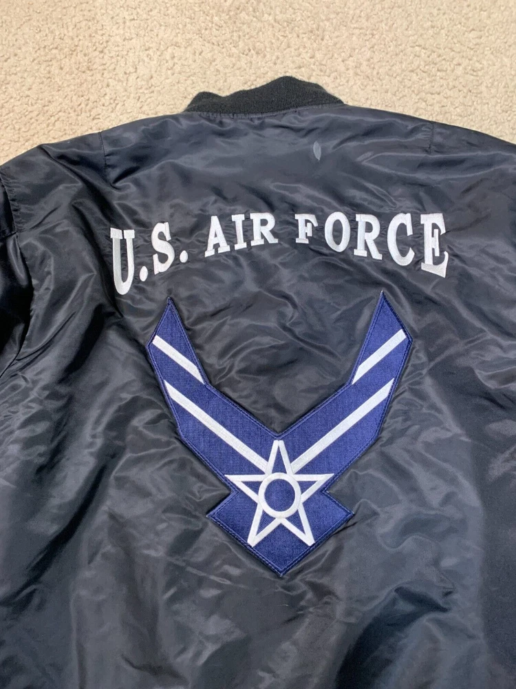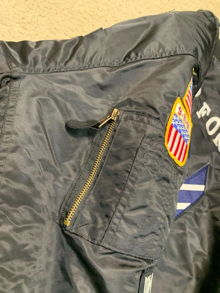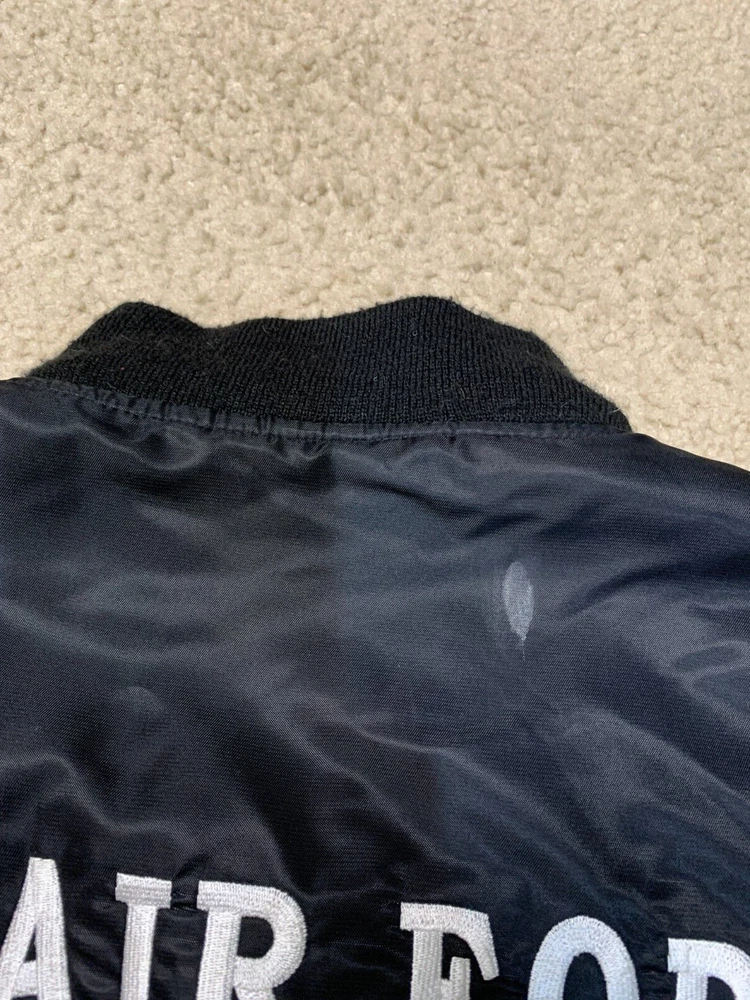 Type: Jacket Vintage: Yes Lining Material: Nylon Style: Bomber Jacket Department: Men Theme: USA Brand: Flight Model: My Force Country/Region of Manufacture: China Season: Fall, Spring, Winter Size Type: Regular Closure: Zip Accents: Embroidered, Logo, Zipper Outer Shell Material: Nylon Features: Full Zip Fit: Regular Color: Black Seller Notes: “White stain on back near collar, otherwise good used condition.” Size: L