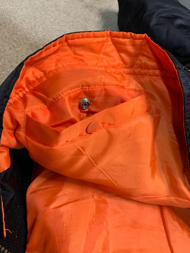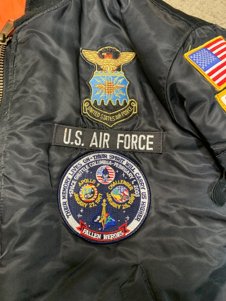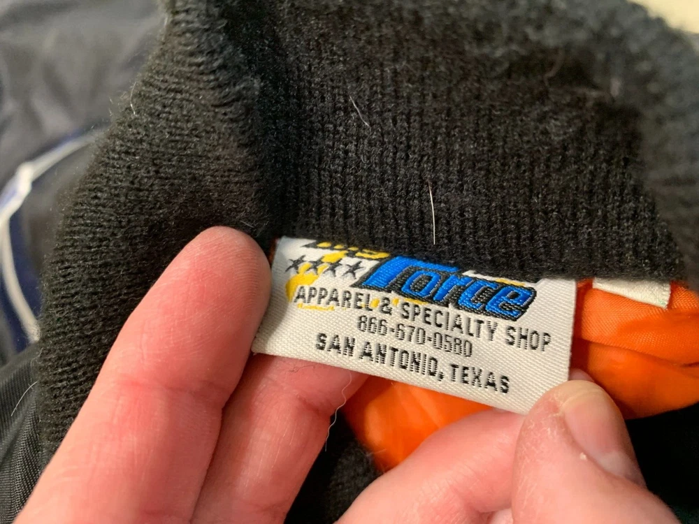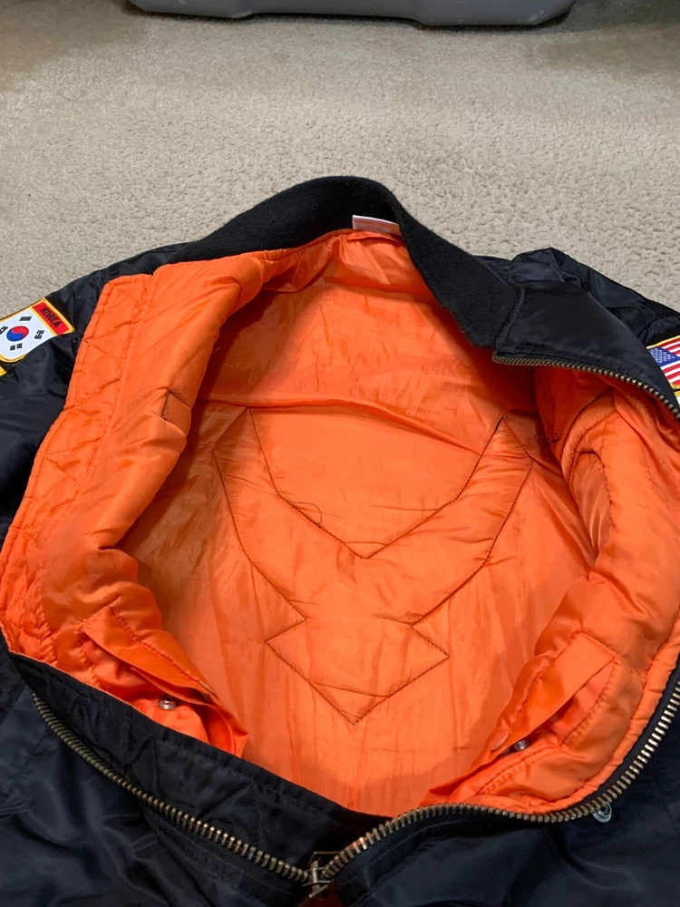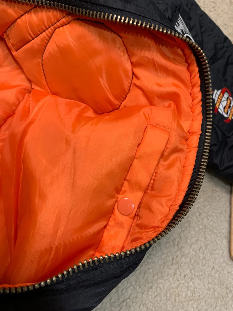 Type: Jacket Vintage: Yes Lining Material: Nylon Style: Bomber Jacket Department: Men Theme: USA Brand: Flight Model: My Force Country/Region of Manufacture: China Season: Fall, Spring, Winter Size Type: Regular Closure: Zip Accents: Embroidered, Logo, Zipper Outer Shell Material: Nylon Features: Full Zip Fit: Regular Color: Black Seller Notes: “White stain on back near collar, otherwise good used condition.” Size: L