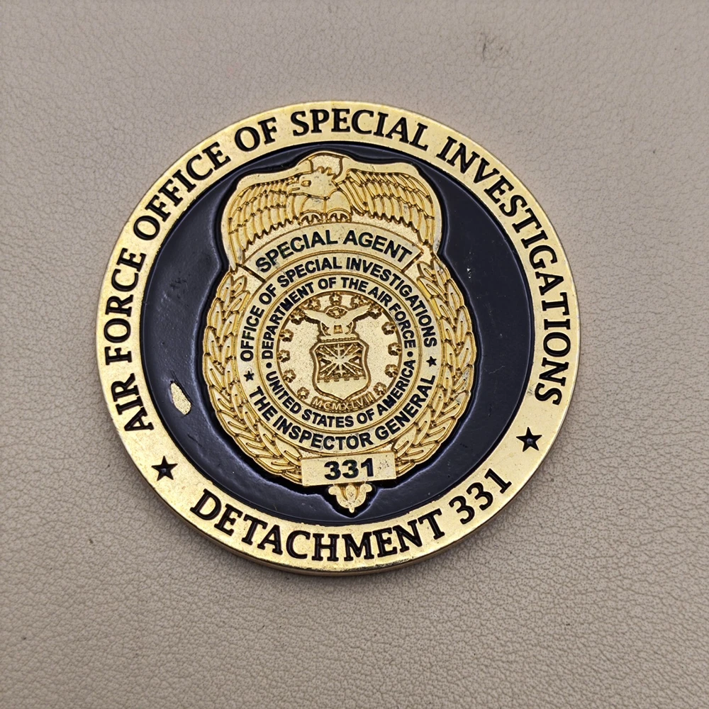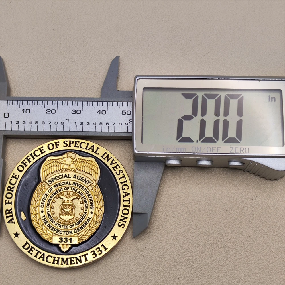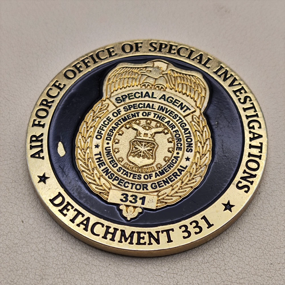 TITLE: US Air Force Office of Special Investigations Detachment 331 Challenge Coin SIZE : Measures Approx 2 " Used coins are inevitably flawed please see pictures PAYMENT : We support multiple payment methods and ship within 5 days of payment SHIPPING : We offer free shipping, and your purchase will be carefully packaged and sent to you with tracking information through eBay SERVICES : You can contact us at any time if you have any questions, We will get back to you as soon as possible to solve your problem If you are not satisfied with your purchase for any reason, Please contact us before leaving neutral or negative feedback and we will solve the problem properly for you