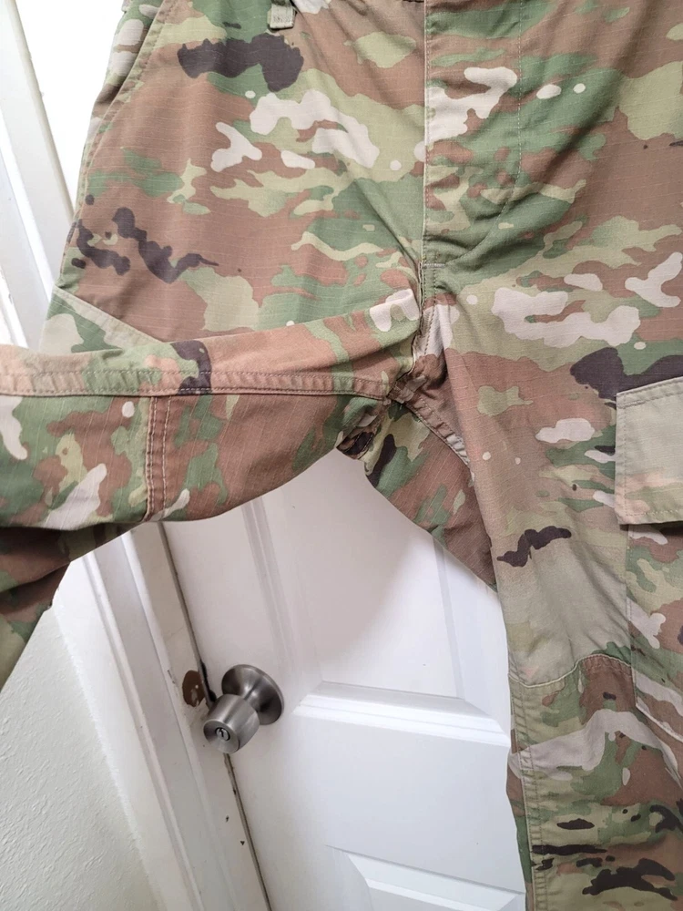 These tactical cargo pants offer durability and functionality for demanding environments. Designed with multiple pockets, they provide ample storage. Reinforced for strength, they are ideal for outdoor activities. • Camouflage pattern • Cargo pockets • Reinforced knees • Button fly • Adjustable waist • Drawstring ankles • Breathable fabric Waist = 34 inches Inseam = 30 inches CONDITIONS use, no visible flaws, good condition see photo for more details.