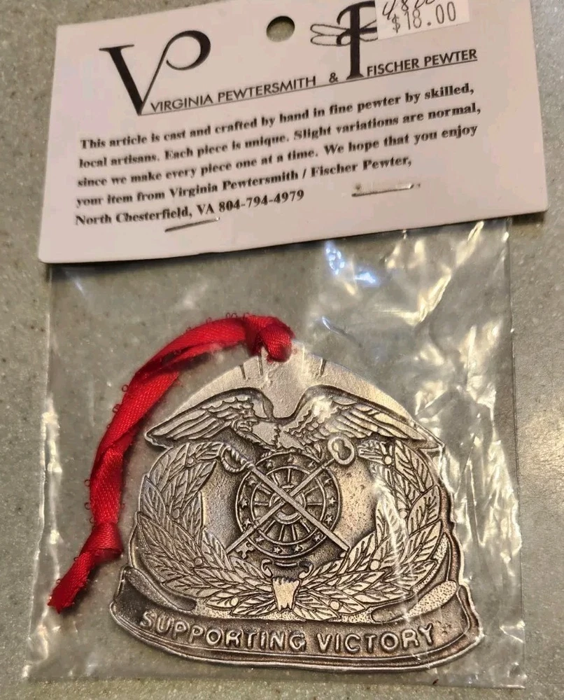 This US Army Quartermaster Corps Supporting Victory Crest Pewter Ornament is a perfect addition for collectors of militaria. Made in the United States (each piece crafted by hand by Virginia Pewtersmith/Fischer Pewter in Virginia) this crest ornament is a great representation of the Army's history and culture. The design features the Quartermaster Corps emblem and the words "Supporting Victory" inscribed below. The piece is made of high-quality pewter and is perfect for display. This item is a great way to show support for the Army while also adding a unique and informative piece to your collection. Fort Lee engraved on back.