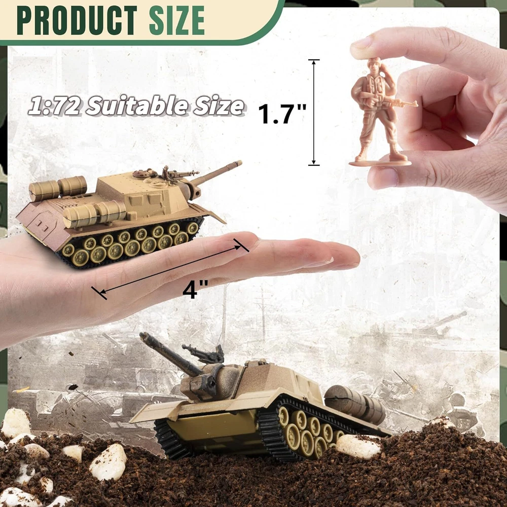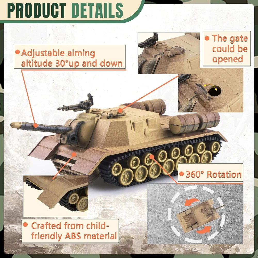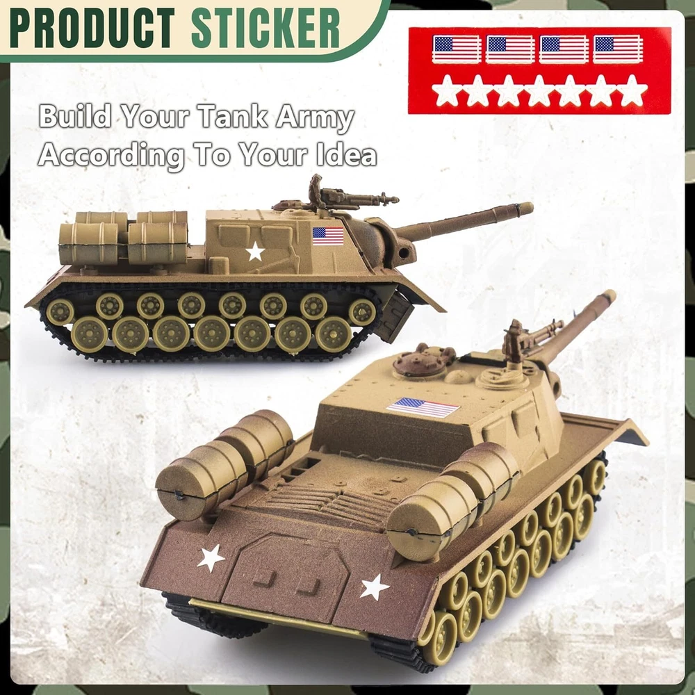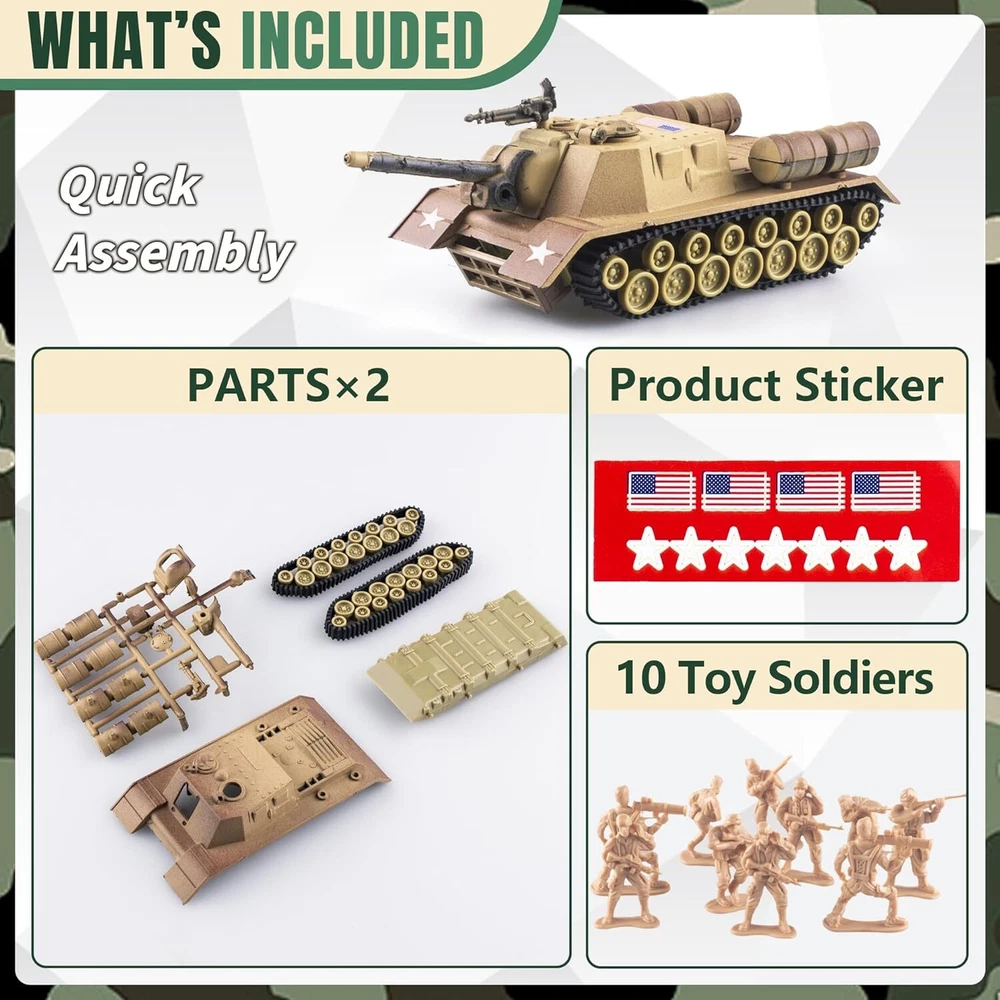 U.S Army Tank and Army Men Toys Playset, 2pc US Tank-1 Models with 10pc Toy Soldiers, Desert Tan 1:72 Military Vehicle, Ideal Military Toy Set for Kids Boys Product Details Product Dimensions: 7.84 x 6.25 x 1.51 inches Item Weight: 1.44 ounces Country of Origin: China Manufacturer recommended age: 3 years and up Department: boys Manufacturer: MaozyHomie Army Tanks Ready for Battle: Experience the excitement of commanding your own mini tank in thrilling battles! This set includes 2pc 1:72 US army battle tank-1 and 10pc tiny toy soldiers in dynamic battle stances. Each army toy tank measures 4" in length x 2" in width, making them easy for little hands to maneuver. Safe & Premium Army Tank: Made from child-friendly ABS material, MaozyHomie model tanks are thoughtfully designed with smooth edges and no sharp burrs to prioritise your children's safety. Constructed from durable ABS plastic, these tanks boast a sturdy texture, while the meticulous craftsmanship faithfully replicates every intricate detail of the tank prototype in the model. Realistic Tank Design Highlights: Featuring a manually adjustable barrel capable of tilting up to 30 degrees, our tank provides an immersive and dynamic gaming experience, empowering you to dominate the battlefield with accuracy. The turret hatch of the tank can be opened to unveil a meticulously crafted interior. And the tank includes 10 army soldier figures that can be strategically positioned to enhance the authenticity of your military scenarios. Enjoyable Assembly: MaozyHomie 1:72 scale Army Tank model is easy to assemble without glue and comes with assembly instructions. This enjoyable activity can be shared with friends and family while putting the tank together. You can also personalise and decorate the tank with stickers included according to your own ideas. We hope you enjoy the fun of assembling toy tanks! Perfect Gift Choice: The MaozyHomie military model is a versatile option perfect for display, collecting, customizing, or for use in tabletop gaming. Explore MaozyHomie collection of 7 distinct styles of American tanks - from sleek and modern to rugged and classic. Stop by MaozyHomie today and find the perfect one that matches your style.