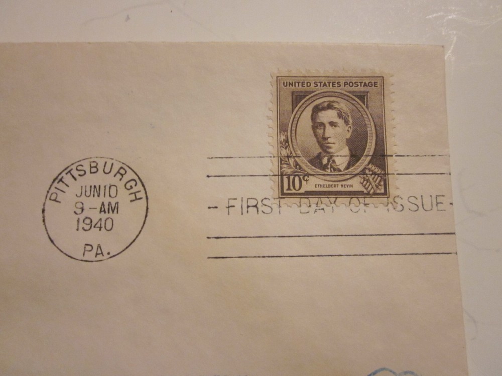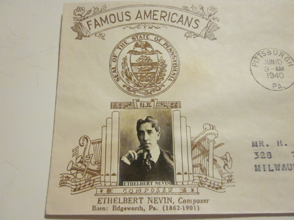 Delve into the rich tapestry of American musical history with this US Cover FDC #883, featuring the distinguished composer Ethelbert Nevin. The envelope showcases a vivid photograph cachet, commemorating the airmail service that connected people and places during the early 20th century. A piece of postal history from the period of 1931-1940, it captures the essence of a bygone era. This item, originating from the United States, bears the mark of its first day of issue, sealing its place in the chronicles of musical and philatelic enthusiasts. Without certification, it speaks to those who appreciate the ungraded quality of historical artifacts. The cover is a tribute to Nevin's contributions to music, offering a tangible connection to the musicians and composers who shaped American culture.