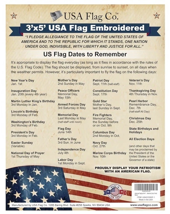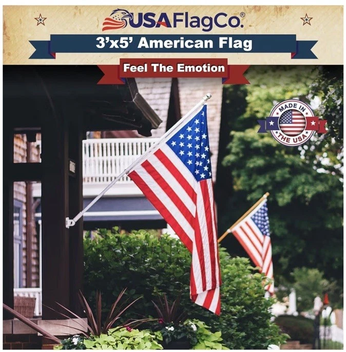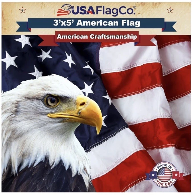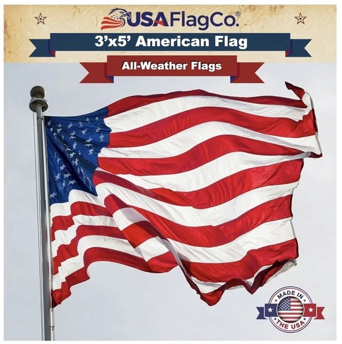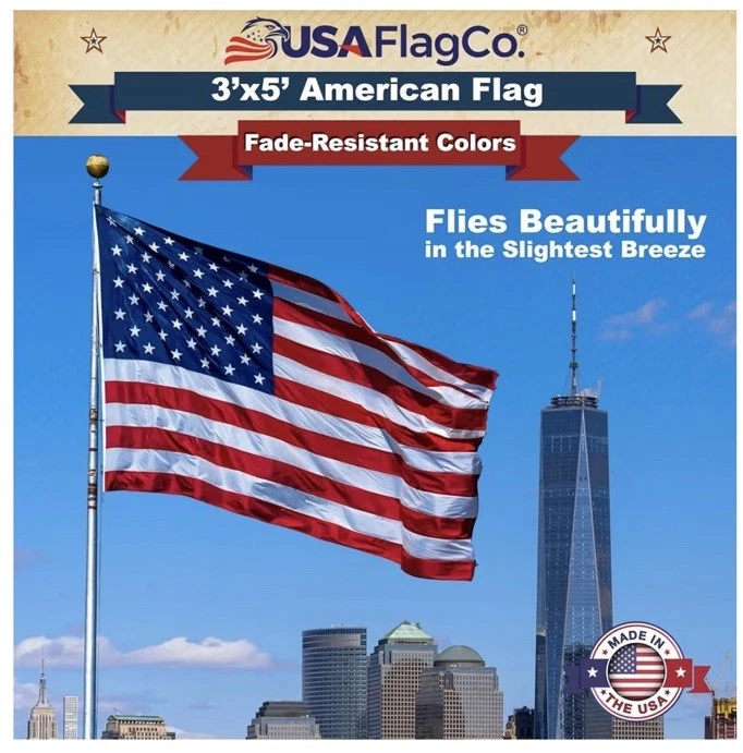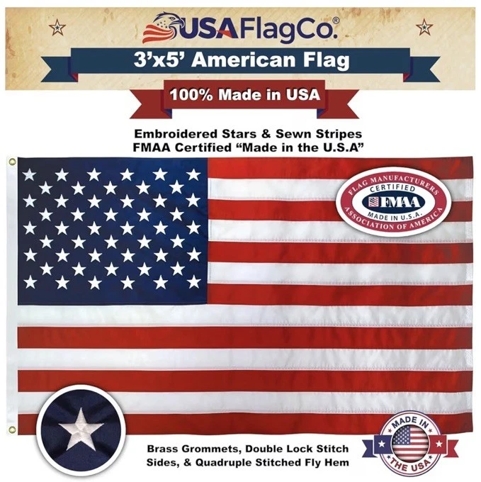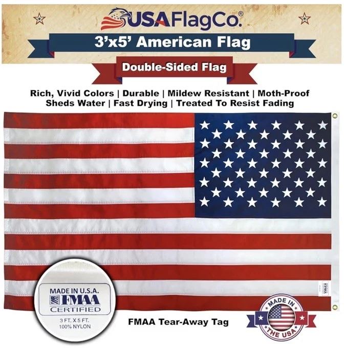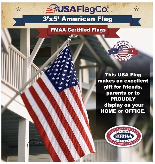 American Flags for Outside 3x5 - USA Flag Co. American Flag Made in USA: Embroidered Stars and Sewn Stripes New, Sealed AMERICAN FLAGS FOR OUTSIDE 3X5: Authentic FMAA Certified American Flags for outside 3x5, proudly crafted and 100% Made in USA by USA Flag Co. As you hoist this remarkable 3x5 American flag and witness the iconic Red, White, and Blue Stars and Stripes waving in the sky, a deep sense of pride will resonate within your soul - declaring, "I'm Proud to be an American." Fly your US Flag with unwavering pride, showcasing your genuine allegiance to the land of the free and the home of the brave. USA FLAGS 3X5 PREMIUM DURABILITY: Embrace the highest quality in our best-selling American Flag 3x5 designed for all weather heavy duty outdoors. Crafted from robust heavy duty outdoor Made in USA nylon, it stands strong against high winds. Your United States Flag features sturdy polyester canvas headings reinforced by spurred brass grommets and a 4-point needle fly hem for lasting integrity. The 100% nylon material boasts a rich, lustrous appearance and exceptional wearing strength thanks to its superior strength-to-weight ratio. Experience the pride of a 3 x 5 American Flag that effortlessly flies in the slightest breeze. US FLAGS EMBROIDERED STARS AND SEWN STRIPES: Upgrade your patriotic display with our premium American Flag, boasting meticulously embroidered stars and flawlessly sewn stripes. Crafted for long-lasting durability, this flag is a symbol of quality and pride for your home or business. Elevate your space with the timeless beauty of our expertly crafted emblem. 3X5 AMERICAN FLAG FMAA CERTIFIED: Our 3x5 American Flag, proudly crafted by USA Flag, bear the esteemed certification of the FMAA. Crafted exclusively from domestic materials, our USA flags undergo a meticulous manufacturing process within United States facilities, employing U.S. labor at every stage. Experience the assurance of quality and authenticity as you proudly display a US flag 3x5 that embodies the true spirit of American craftsmanship. AMERICAN MADE FLAG: This American flag Made in USA serves as an excellent gift for friends or parents and is ideal for proudly showcasing at your home or business. Enhance the decor of your house, porch, wall, or office with this symbol of patriotism. Proudly display it at your residence or commercial business.