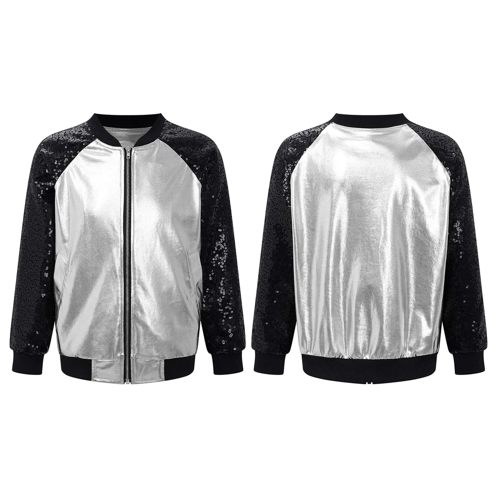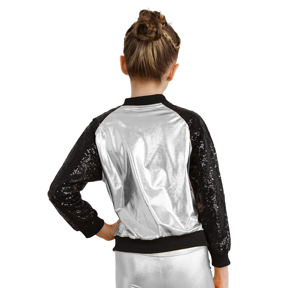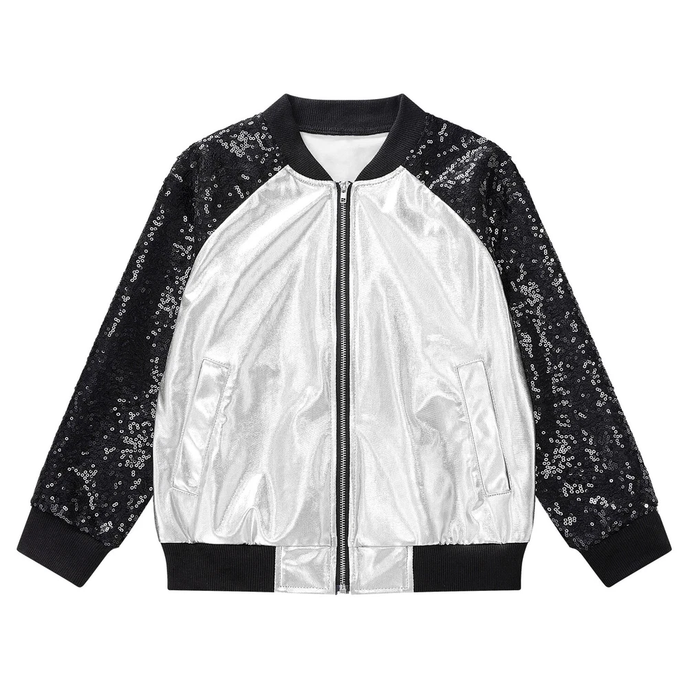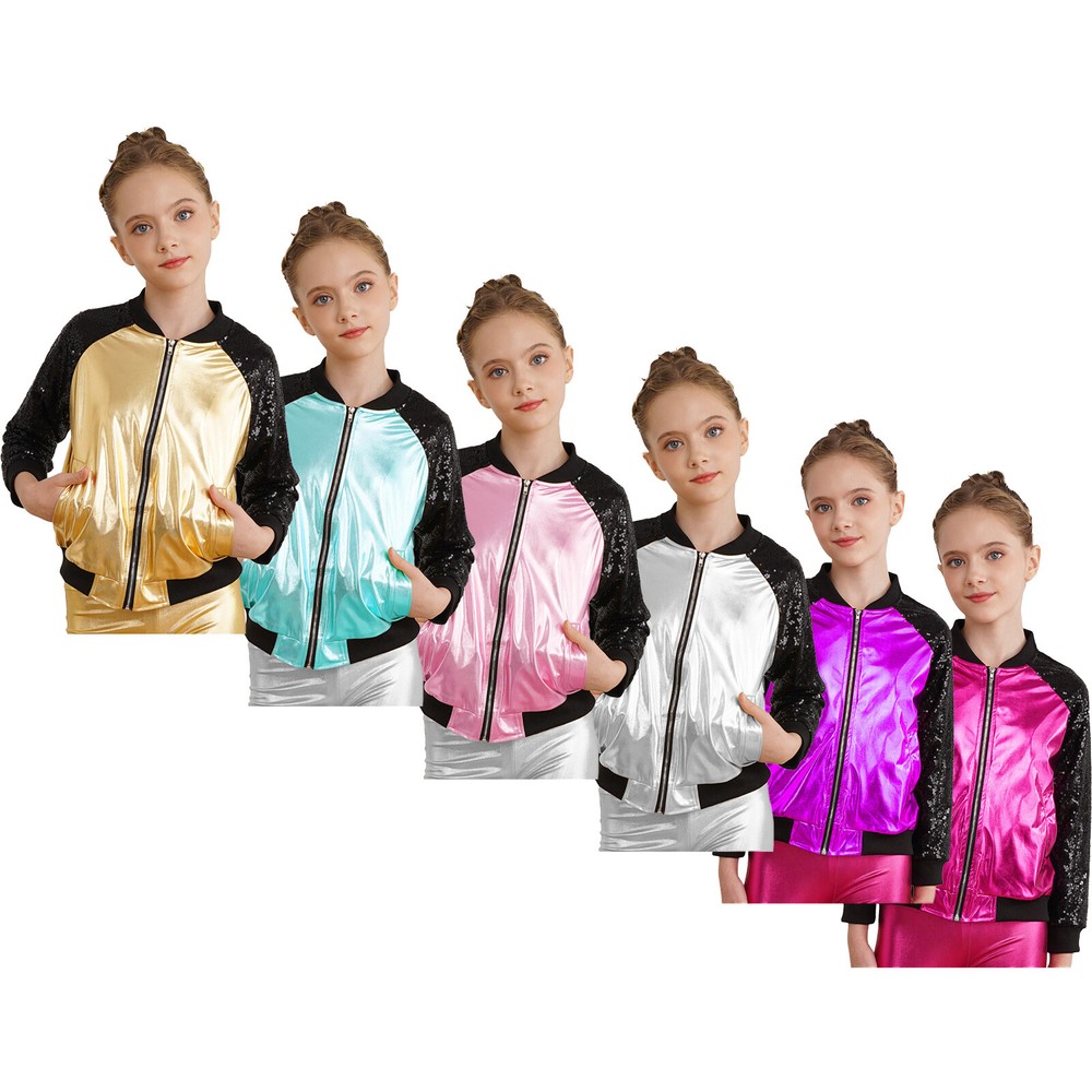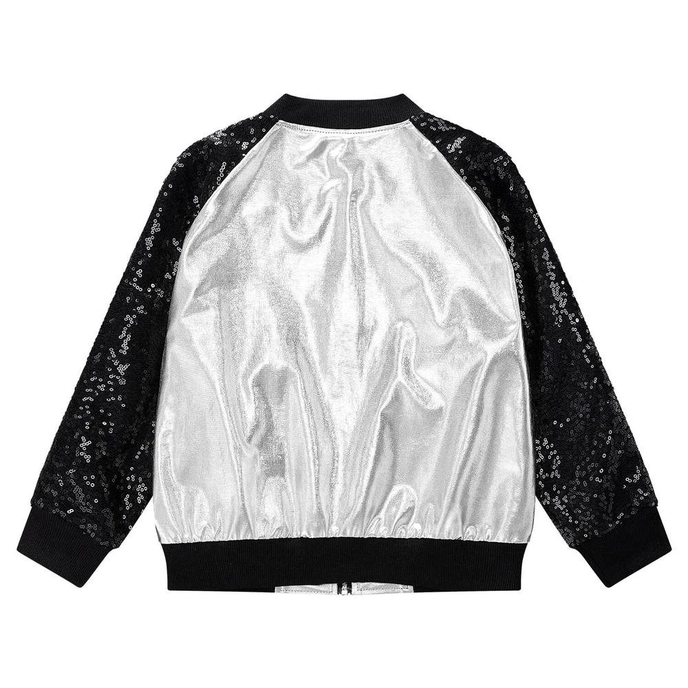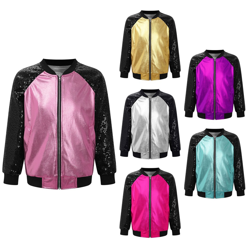 US Girl Boys Sparkly Metallic Bomber Flight Jacket Hip-Hop Jazz Disco Dance Coat