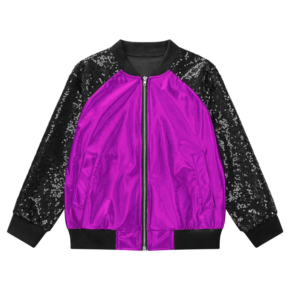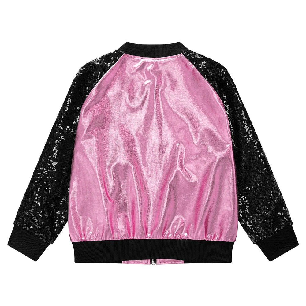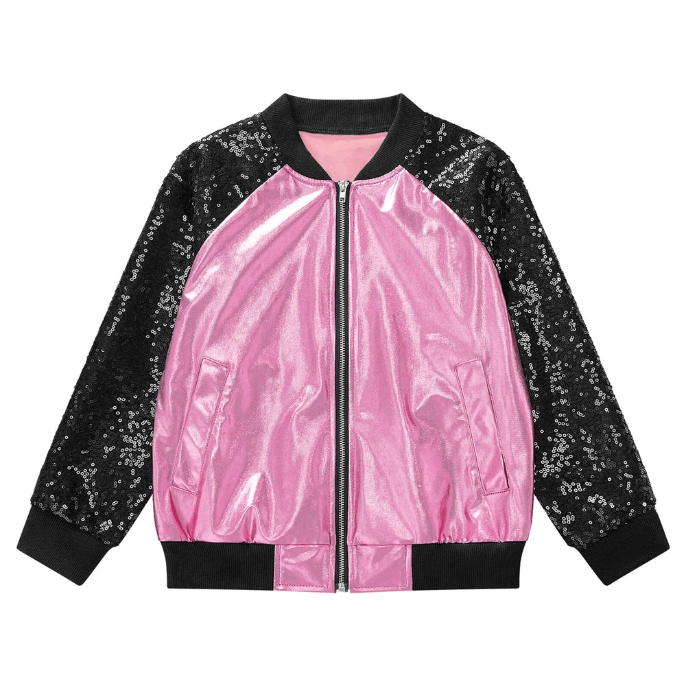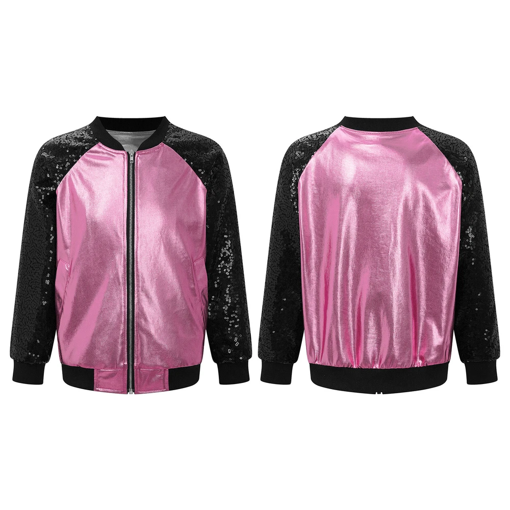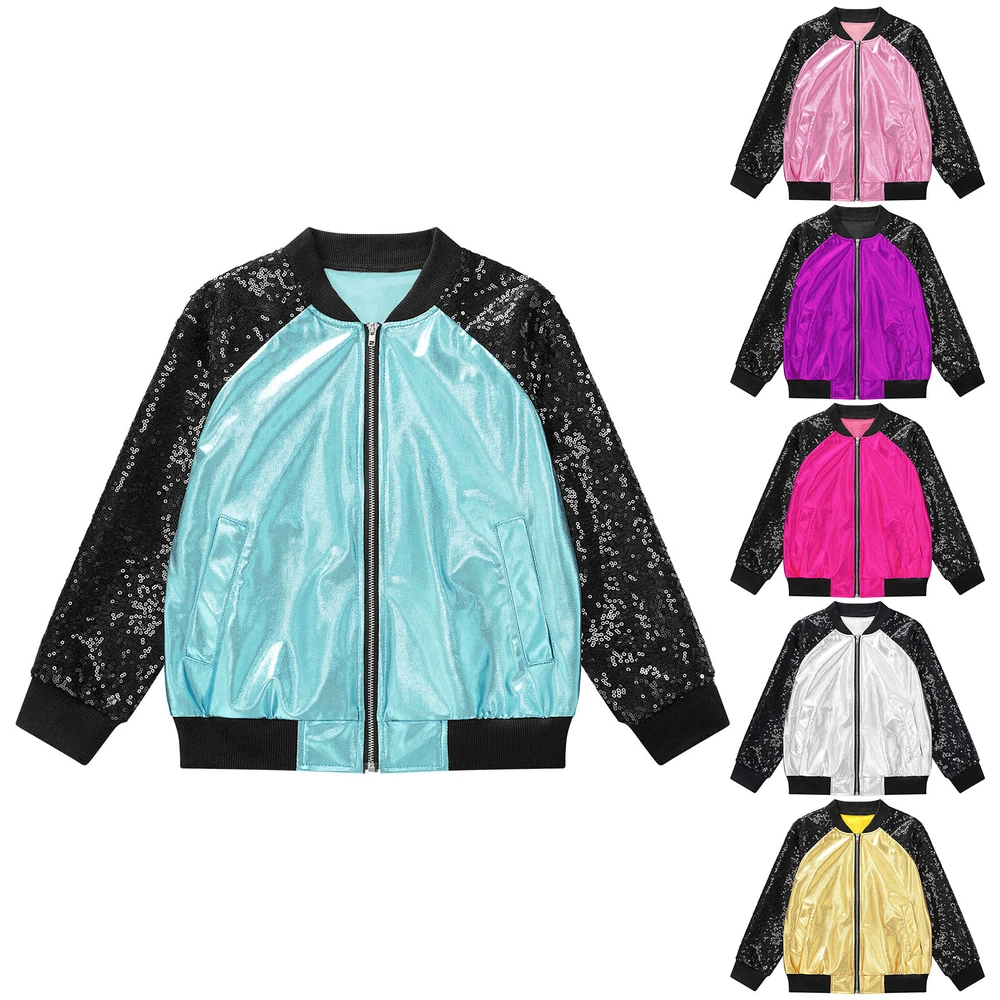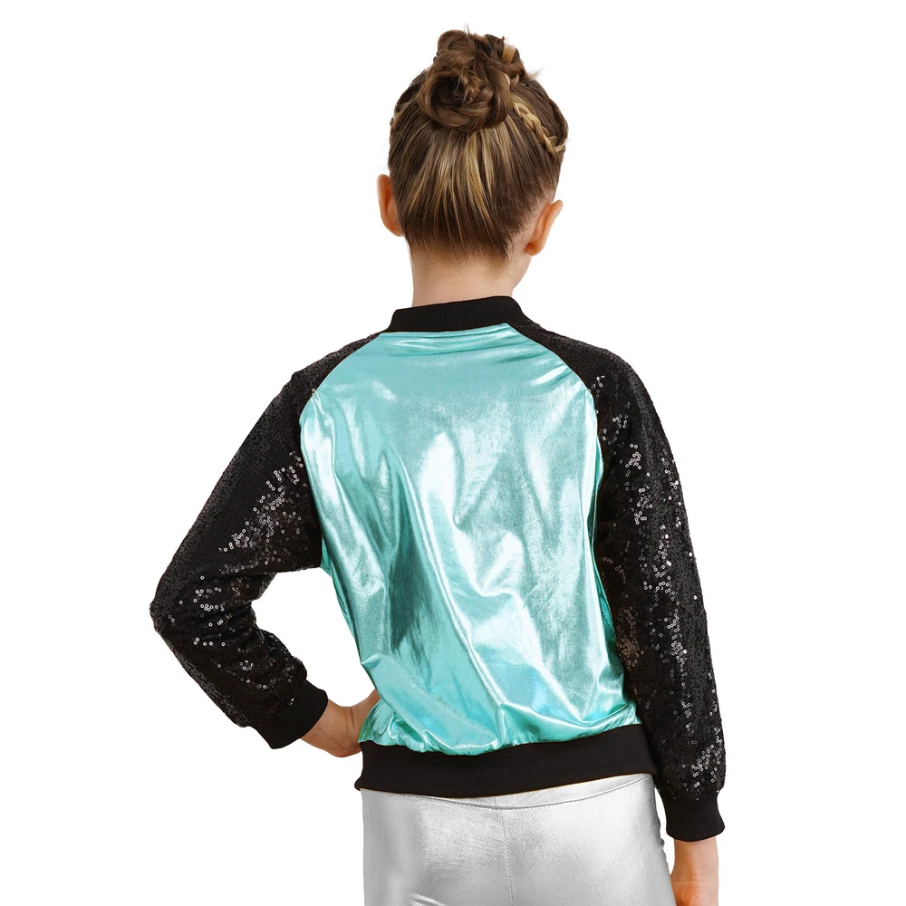 US Girl Boys Sparkly Metallic Bomber Flight Jacket Hip-Hop Jazz Disco Dance Coat
