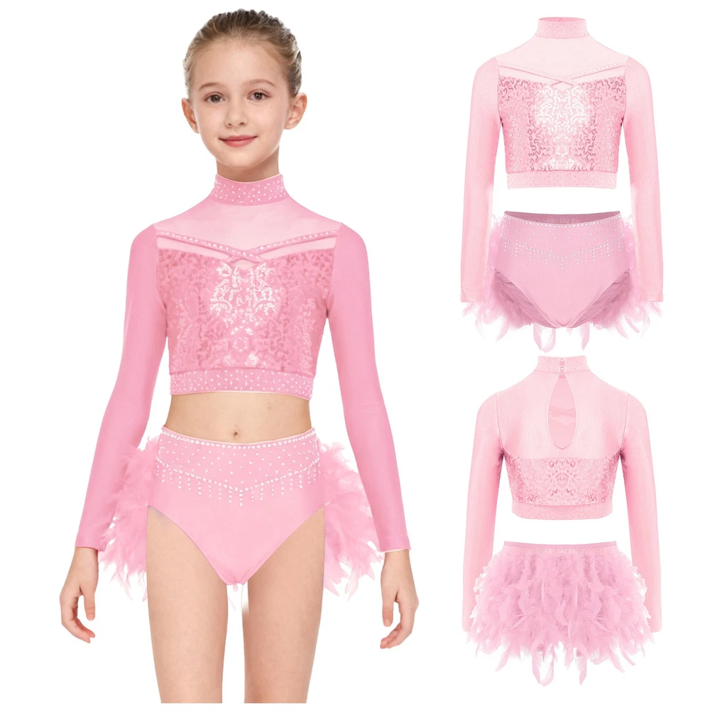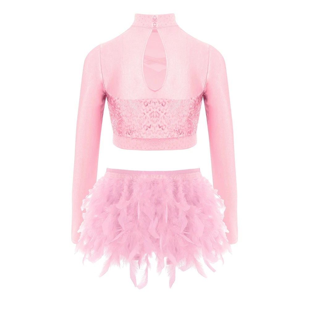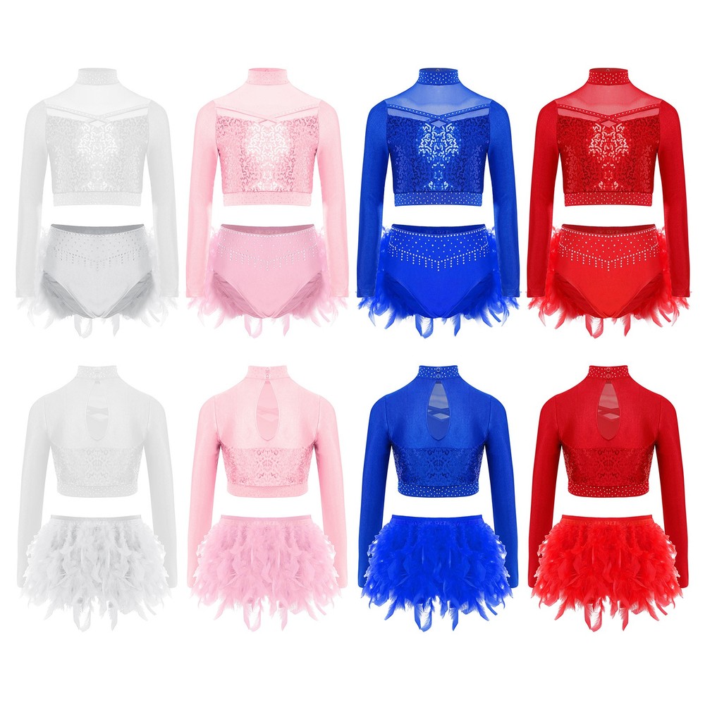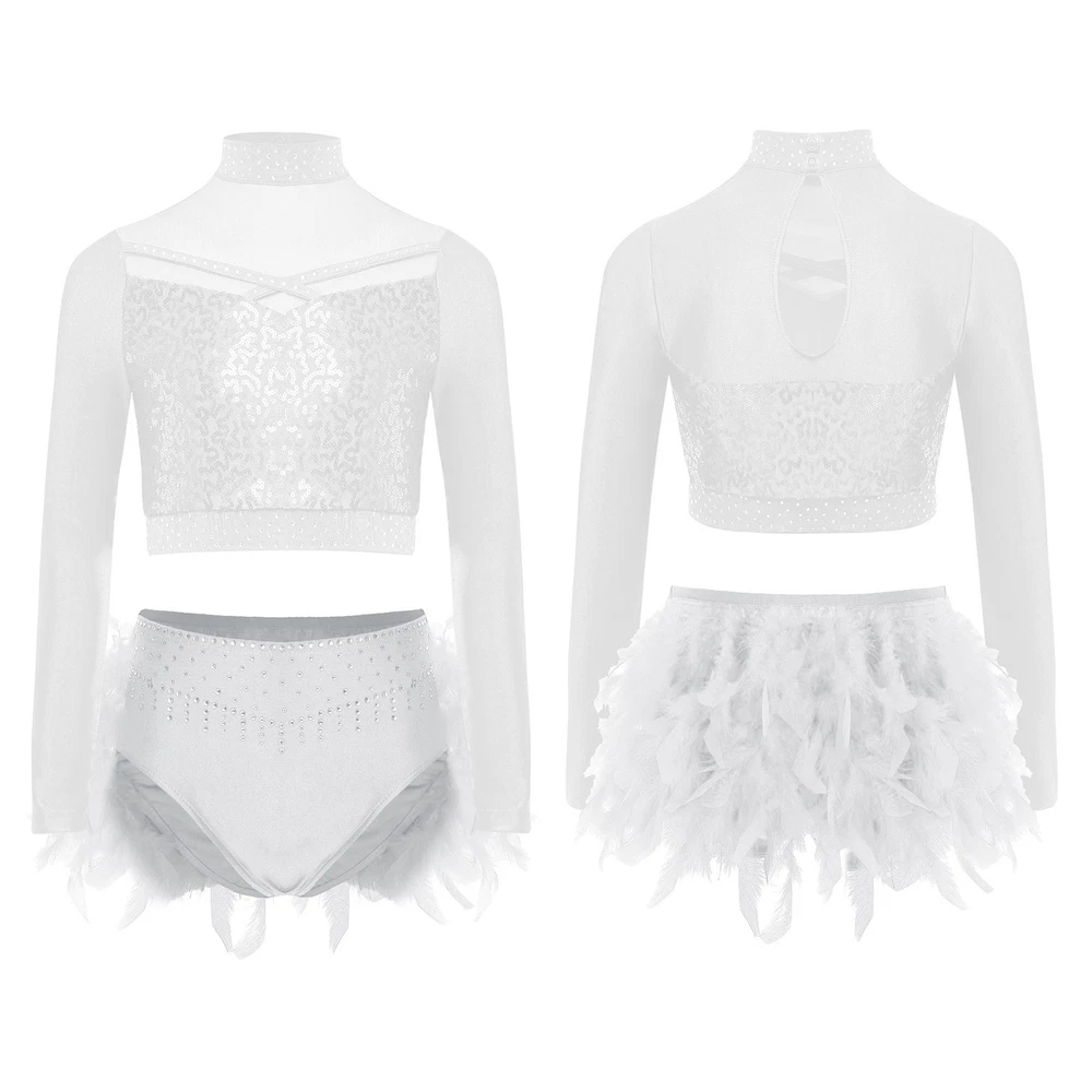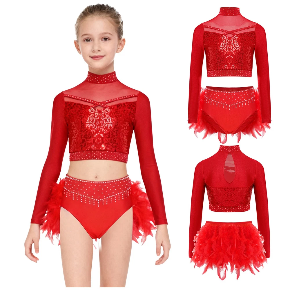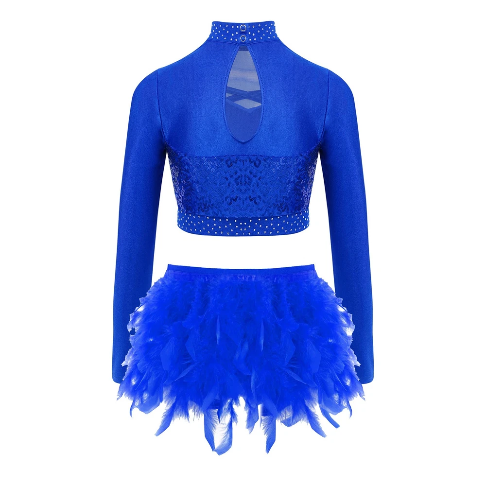 US Kids Girls 2 Piece Dance Outfit Sequin Crop Top with Feather Briefs Skirt Set