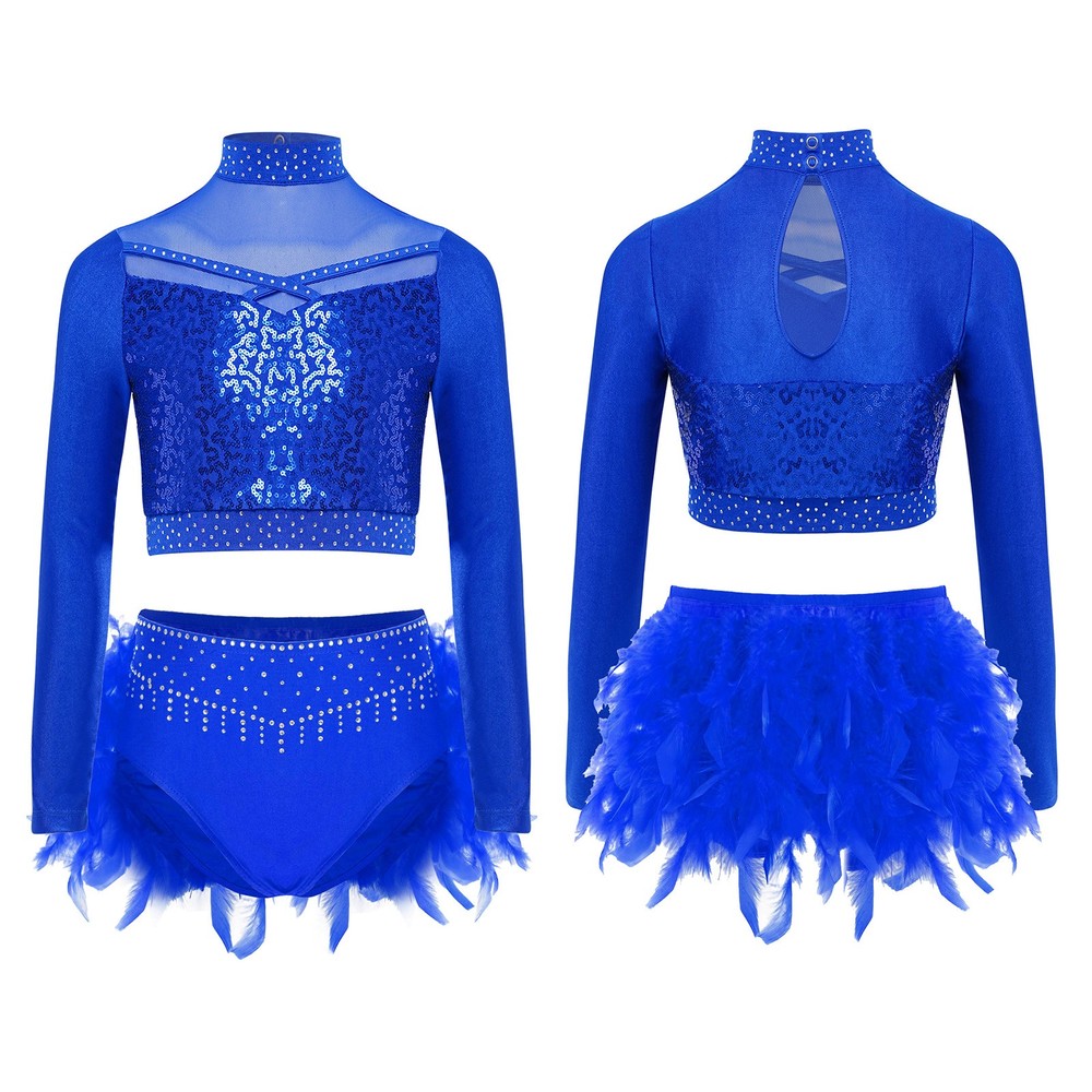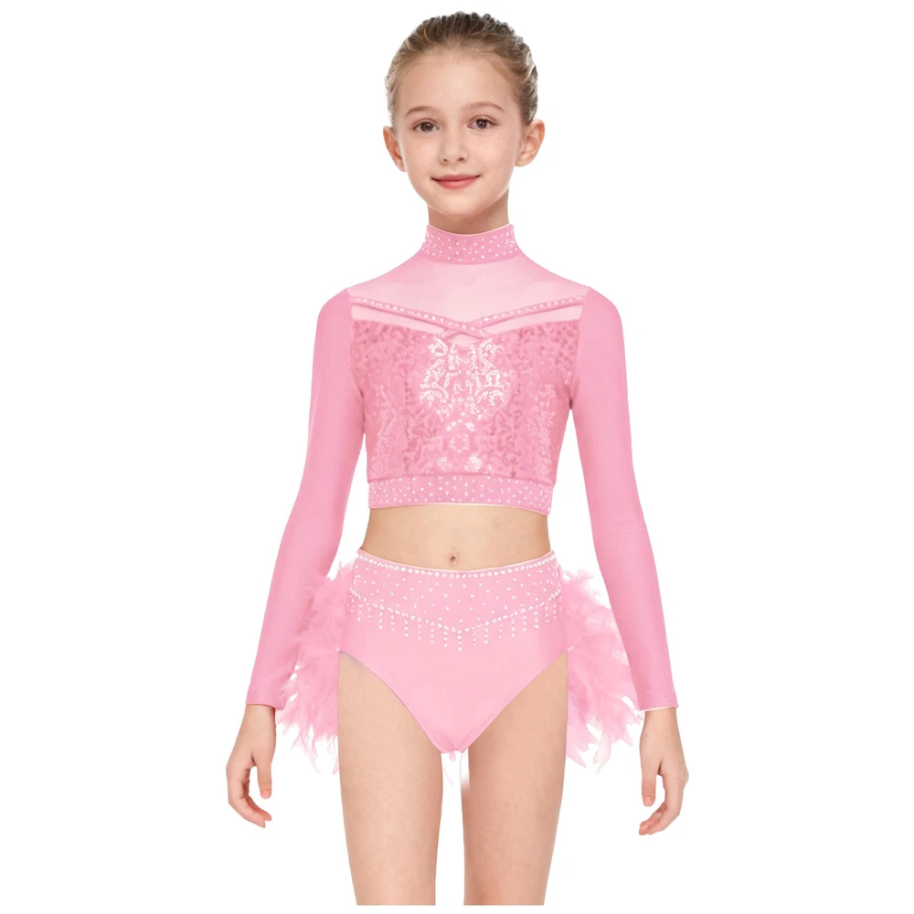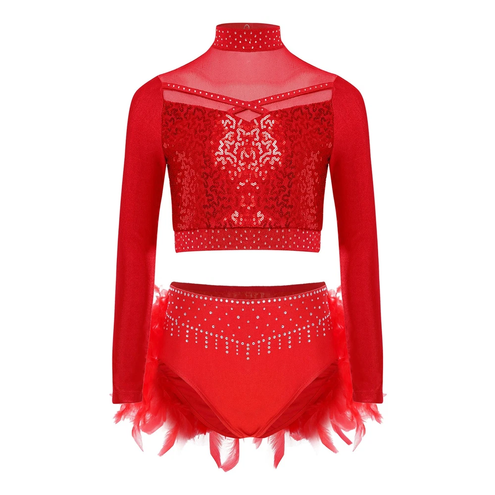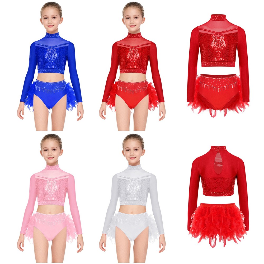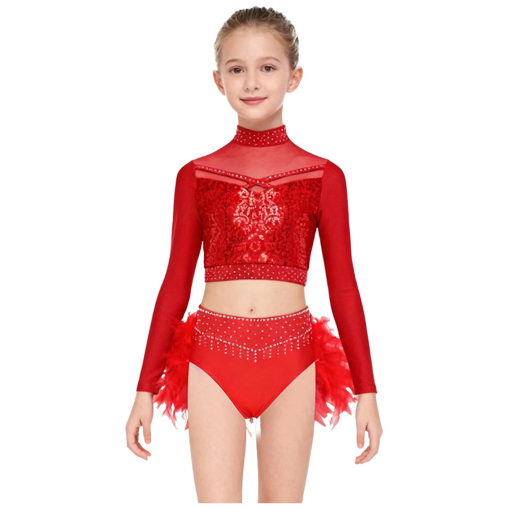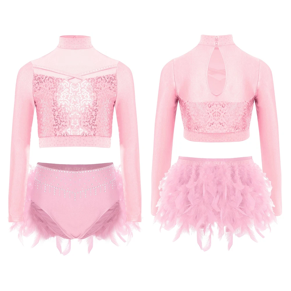 US Kids Girls 2 Piece Dance Outfit Sequin Crop Top with Feather Briefs Skirt Set