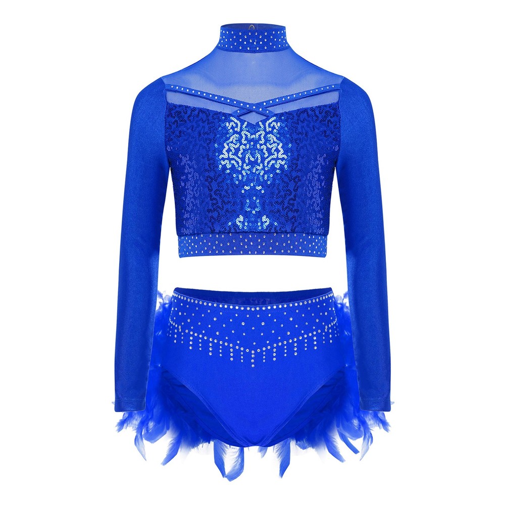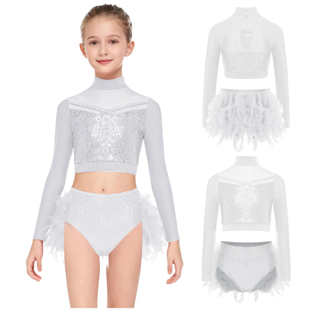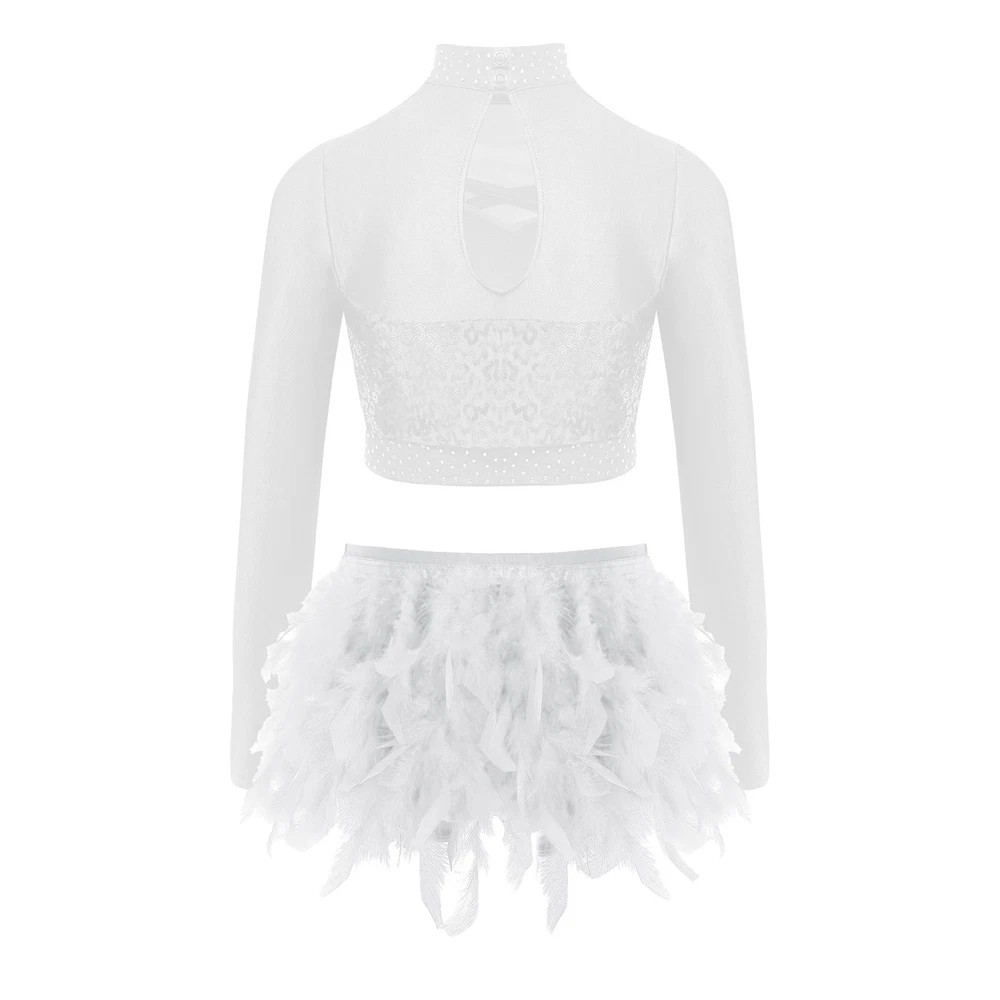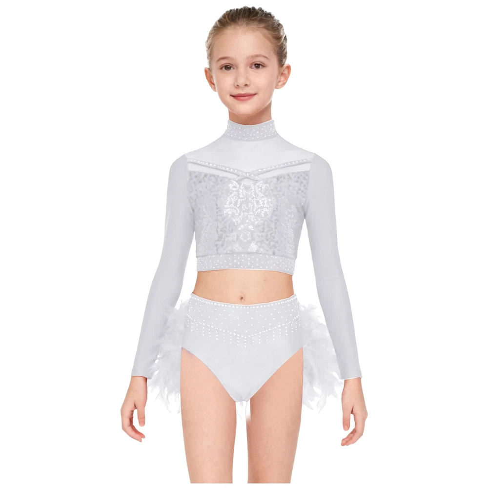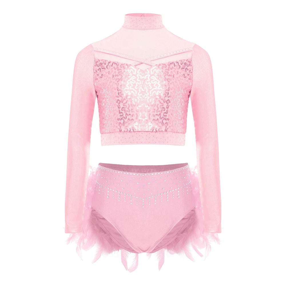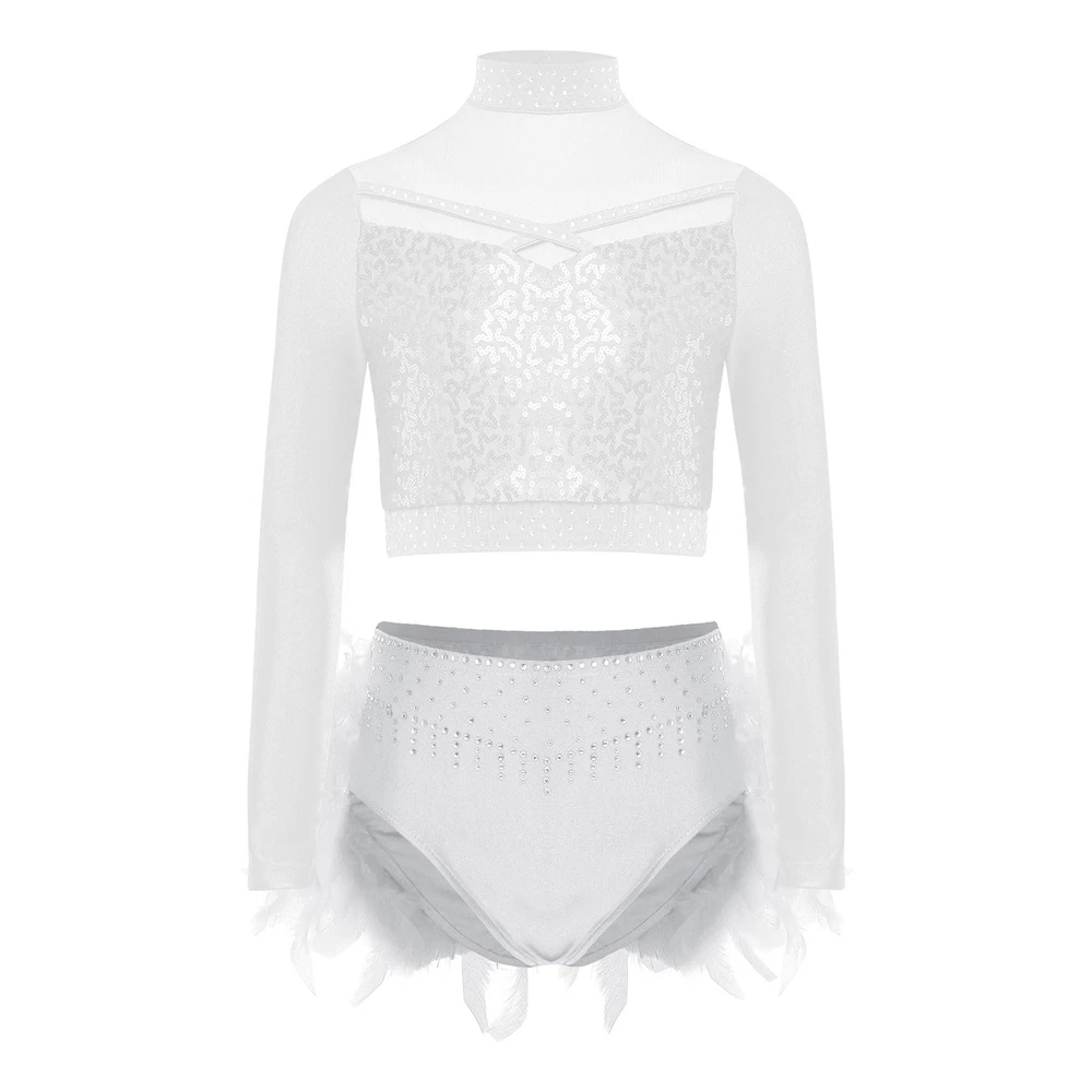US Kids Girls 2 Piece Dance Outfit Sequin Crop Top with Feather Briefs Skirt Set