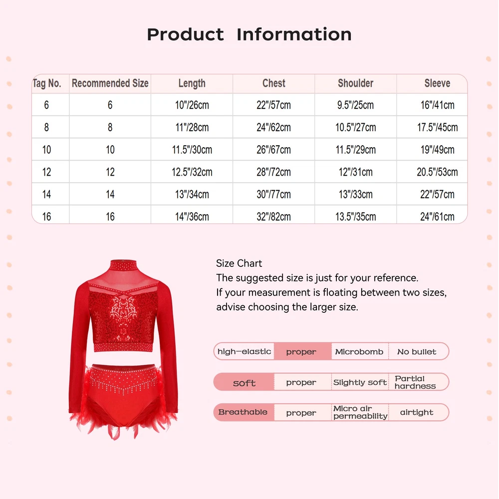 Click Here to New Arrivals More Categories New Arrivals Hot Sales On Sales Baby Clothing Girls Outfit&Sets Girls Dresses Girls Costumes Girls Leggings Girls Swimwears GirlsTop&T-shirts Womens Fashion Sexual Wellness US Kids Girls 2 Piece Dance Outfit Sequin Crop Top with Feather Briefs Skirt Set Set Include : 1Pc Crop Top, 1Pc Dance Bottoms Condition : New with tags Material : 85% Polyester, 15% Spandex Features: Crafted from a blend of polyester and spandex, this outfit offers flexibility and comfort, allowing your little girl to move freely during dance performances. The mock neck long-sleeve crop top with sheer mesh patchwork and shiny sequins, adding a touch of sparkle and a trendy look that’s in line with current fashion. Rhinestones adorn the dance bottoms, enhancing its sparkle and making your child stand out on the stage or in any event. The elastic waistband on the dance bottoms ensures a secure and comfortable fit, while the feather details bring a playful and stylish element. This outfit is perfect for dance performances, stage shows, parties, or any event where your little girl wants to shine and show off her moves. Size Chart : The suggested size is just for your reference. If your measurement is floating between two sizes, advise choosing the larger size. (Measurements shown in the size chart refer to item measurements, not body) Tag No. Recommended Size Length Chest Shoulder Sleeve Length Waist 6 6 10"/26cm 22"/57cm 9.5"/25cm 16"/41cm 8.5"/21.5cm 20.5"-28"/52-71cm 8 8 11"/28cm 24"/62cm 10.5"/27cm 17.5"/45cm 9"/23cm 22"-29.5"/56-75cm 10 10 11.5"/30cm 26"/67cm 11.5"/29cm 19"/49cm 9.5"/24cm 23.5"-31"/60-79cm 12 12 12.5"/32cm 28"/72cm 12"/31cm 20.5"/53cm 9.5"/25cm 25"-32.5"/64-83cm 14 14 13"/34cm 30"/77cm 13"/33cm 22"/57cm 10"/26cm 26.5"-34"/68-87cm 16 16 14"/36cm 32"/82cm 13.5"/35cm 24"/61cm 10.5"/27cm 28"-35.5"/72-91cm Friendly Tips: The size is measured by hands, please allow 1-3cm errors of measurement. Photo color might be a little different from the actual product due to color display of different monitors. Product names are trademarks of the listed manufacturer or other owners, and are not trademarks of Faitrye. The manufacturer does not necessarily endorse use of these products. Payment Methods Terms and Conditions Shipping Combined shipping is limited only to the items listed under this seller account : faitrye All the free shipping item don't offer discount. We REDUCE US$1.00 on shipping cost for each additional item. Please contact us to send you the update invoice once you finish your purchase. Please note that only the item in same currency can be combined.Please note that we do NOT offer shipping discount for bidding orders or item value less than $5.00 International Orders: The buyer is responsible for any applicable import duties and local taxes. Please verify with your customs before making your purchase. Please verify your address during checkout. We are not responsible for any wrong or undeliverable addresses. Your item will be sent to your ebay address. Please make sure your ebay address is correct. Any non- received items caused by invalid address are not in our full refund or replacement policy. All items will be shipped within 1 business day after full payment is received. It takes about 10-20 days to US UK AU DE; about 20-35 days to other countries.Shipping may influenced by holidays, events and other uncertainties. We could not guarantee the arrival time. If you can't accept the shipping time, please check the extra charge with us to ship your item via express. Please check my other products below: Unisex Kids Hip Hop Dance Outfit with Metallic Jacket Shiny Ruched Cargo Pants USD 12.89 Kids Girls Disco Dance Outfits Sequin Crop Top With Metallic Bell Bottom Pants USD 5.99 Kids Girls Long Sleeve Leotard with Vest Leggings&Hairband Sparkly Dance Outfits USD 10.99 Girls Sparkle Clothes Sequins Dance Dress Cheerleading Uniform Disco Outfit USD 9.99 US Kids Leotard Sparkly Ballet Dance Bodysuit and Shorts Leggings Scrunchies Set USD 11.99 US Kids Praise Dance Dress Liturgical Worship Tunic Robe with Wide Leg Pants Set USD 10.39 Kids Sparkly Gymnastics Leotards with Shorts Set Sleeveless Unitards Dancewear USD 7.49 Kids 2Pcs Rhinestone Dance Outfits Strappy Back Crop Tops with Booty Shorts Set USD 6.99 US Girls Sparkly Dance Unitard with Shorts Scrunchie Storage Bag Set Activewear USD 8.99 US Girls Tassel Mini Dress Fringe Dancewear Outfit Crop Top With Shiny Skirt Set USD 7.49 US Girls Ballet Dance Leotard Set Shiny Figure Skating Outfit Ballroom Dancewear USD 8.59 US Girls Praise Dance Outfits Liturgical Worship Dance Dress with Wide Leg Pants USD 5.99 Girls Glam Stage Wear Layered Ruffle Top with Bell Bottom Pants Dancewear Disco USD 8.99 US Girls 2-piece Dance Costume Outfits Sequined Crop Top with Shiny Flared Pants USD 8.99 Kids Dance Costume Sparkle Crisscross Back Crop Top Vest And V-front Shorts Set USD 7.99 US Kids 2 Pieces Latin Dance Outfit Halter Sleeveless Crop Top and Tassel Skirt USD 9.69 US Kids Gymnastics Leotard with Leggings Shorts Hairband for Stage Performance USD 13.99 Kids Girls Tassel 2 Pcs Dance Outfit Sleeveless Fringe Top with Sequins Skirts USD 5.99 US Kids Gymnastics Leotard with Leggings Yoga Crop Top Dance Outfit for Stage USD 8.59 US Kid Girls Long Sleeve Dance Leotards with Tumbing Shorts Hairband&Storage Bag USD 9.29 Kids Girls Set Shiny Dancewear Ballroom Outfits Pants Costume Theme Party Disco USD 8.99 Girls Set Competitions Gymnastics Sports Outfits Stage Performance Leotard Yoga USD 12.69 Kids Girls Set Metallic Outfit Dance Suit Crop Top Streetwear Hip Hop Holiday USD 8.99 Girls Set Festival Gymnastics Dancewear Outfits Show Mock Neck Bodysuit Leotard USD 14.29 Girls Set Competition Outfit Sequins Dancewear Sparkly Round Neck Performance USD 12.49 US Kids Girls Crop Top And Skirt Tassel Metallic Shiny Dance Stage Costume Disco USD 11.99 US Kids Girls Metallic A-Line Skirt Set Flutter Sleeve Crop Top Dance Costume USD