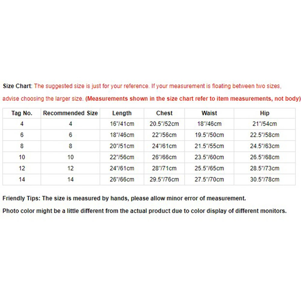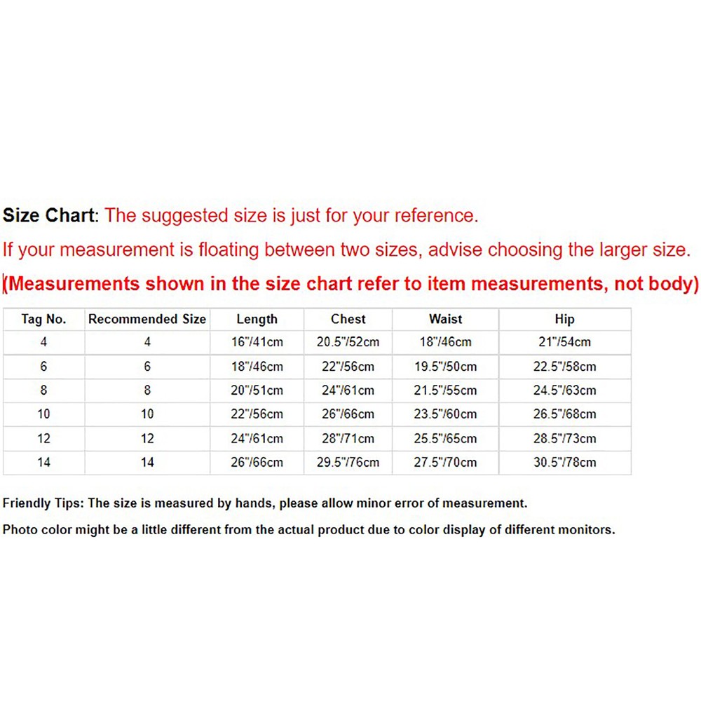 Click Here to New Arrivals New Arrivals Hot Sale Women's Dresses Women's Swimsuit Girls'Dresses Girls'Sleepwear Girls'Swimwear Boys'Clothing Baby Clothing US~ Kids Girls Sequin Tutu Christmas Holiday Santa's Elf Costume Xmas Dress #1 Set Include : 1Pc Dance Dress Condition : New with tag Material : 30% Mesh, 10% Spandex, 20% Sequin, 20% Satin, 10% Nylon, 5% Plush, 5% Plastic Features : Made of high quality material, light weight, soft, breathable and comfortable for baby wearing, super smooth surface of touch feeling. The dress features with sleeveless and crisscross hollow back, striped print ruffle, button and sequins decorated, ruffle hem with plush balls. Design with fashion patchwork style, three layer mesh in outside, briefs style lining, perfect for dance wear, very beautiful for your girls. Size Table means age ranges for girls, but they are for general guidance only, hand wash cold and hang dry recommended. Suitable for any occasion, daily life, dance wear, Christmas, photo shoot, outdoors, birthday party, stage performance, playing and so on. Size Chart : The suggested size is just for your reference. If your measurement is floating between two sizes, advise choosing the larger size. (Measurements shown in the size chart refer to item measurements, not body) Tag No. Recommended Size Length Chest Waist Hip 4 4 16"/41cm 20.5"/52cm 18"/46cm 21"/54cm 6 6 18"/46cm 22"/56cm 19.5"/50cm 22.5"/58cm 8 8 20"/51cm 24"/61cm 21.5"/55cm 24.5"/63cm 10 10 22"/56cm 26"/66cm 23.5"/60cm 26.5"/68cm 12 12 24"/61cm 28"/71cm 25.5"/65cm 28.5"/73cm 14 14 26"/66cm 29.5"/76cm 27.5"/70cm 30.5"/78cm Friendly Tips: The size is measured by hands, please allow 1-3cm errors of measurement. Photo color might be a little different from the actual product due to color display of different monitors. #2 Set Include : 1Pc Jumpsuit Condition : New With Tag Material : 60% Polyester, 30% Tulle, 10% Sequin Features : Made of high quality and skin-friendly fabric, no itchy, breathable and comfortable for wearing. Size Table means age ranges for girls, but they are for general guidance only. Hand wash and do not bleach. Featuring with sleeveless, shiny sequin on front, tulle skirt and integrated briefs for protecting privacy. Jagged layer adorns with pom poms, dressing girl as Christmas elf and bringing more unforgettable memorizes. Suitable for Christmas, Halloween, cosplay, stage performance, dress up party or other activities. Size Chart : The suggested size is just for your reference. If your measurement is floating between two sizes, advise choosing the larger size. (Measurements shown in the size chart refer to item measurements, not body) Tag No. Recommended Size Length Chest Waist 6 6 19"/49cm 22"/56cm 20.5-29"/52-74cm 8 8 20.5"/53cm 24"/61cm 22-30.5"/56-78cm 10 10 22.5"/57cm 26"/66cm 23.5-32"/60-82cm 12 12 24"/61cm 28"/71cm 25-33.5"/64-86cm 14 14 25.5"/65cm 30"/76cm 26.5-35"/68-90cm 16 16 27"/69cm 31.5"/81cm 28-37"/72-94cm Friendly Tips: The size is measured by hands, please allow 1-3cm errors of measurement. Photo color might be a little different from the actual product due to color display of different monitors. #3 Set Include : 1Pc Girl Dress Condition : New with tag Material : 100% Polyester Features Made of skin friendly fabric, this costume is soft, light and comfortable to wear. Square neck, long sleeve, high waist tutu dress with built-in underwear and buttons, is very convenient to wear. Designed with sequins and jingle bells at neck, a belt fixed at waist and stripes print at sleeves and wasit. A Christmas costume dress for girl, making your little one look like a christmas elf or Santa little helper. Suitable for Christmas party, Christmas elf costume, Santa little helper costume, family celebration, performance, etc. Size Chart : The suggested size is just for your reference. If your measurement is floating between two sizes, advise choosing the larger size. (Measurements shown in the size chart refer to item measurements, not body) Tag No. Recommended Size Length Shoulder Chest Waist Sleeve Length 4 4 21"/54cm 9.5"/24cm 21.5"/55cm 19.5"/50cm 13.5"/35cm 6 6 23"/58.5cm 10"/26cm 23.5"/60cm 21"/54cm 15"/39cm 8 8 24.5"/63cm 10.5"/27.5cm 25.5"/65cm 22.5"/58cm 16.5"/43cm 10 10 26.5"/67.5cm 11.5"/29.5cm 27.5"/70cm 24"/62cm 18.5"/47cm 12 12 28.5"/72cm 12"/31cm 29.5"/75cm 26"/66cm 20"/51cm 14 14 30"/76.5cm 13"/33cm 31.5"/80cm 27.5"/70cm 21.5"/55cm 16 16 32"/81cm 13.5"/35cm 33.5"/85cm 29"/74cm 23"/59cm Friendly Tips: The size is measured by hands, please allow 1-3cm errors of measurement. Photo color might be a little different from the actual product due to color display of different monitors. Product names are trademarks of the listed manufacturer or other owners, and are not trademarks of alwaysforbauhinia. The manufacturer does not necessarily endorse use of these products. Payment Methods Terms and Conditions Shipping Combined shipping is limited only to the items listed under this seller account : rakendw All the free shipping item don't offer discount. We REDUCE US$1.00 on shipping cost for each additional item. Please contact us to send you the update invoice once you finish your purchase. Please note that only the item in same currency can be combined.Please note that we do NOT offer shipping discount for bidding orders or item value less than $5.00 International Orders: The buyer is responsible for any applicable import duties and local taxes. Please verify with your customs before making your purchase. Please verify your address during checkout. We are not responsible for any wrong or undeliverable addresses. Your item will be sent to your ebay address. Please make sure your ebay address is correct. Any non- received items caused by invalid address are not in our full refund or replacement policy. All items will be shipped within 1 business day after full payment is received. It takes about 10-20 days to US UK AU DE; about 20-35 days to other countries.Shipping may influenced by holidays, events and 