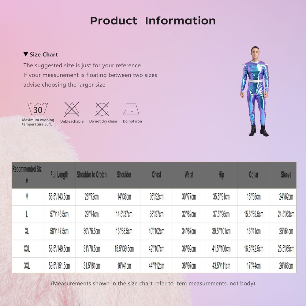 Click Here to New Arrivals More Categories New Arrivals Hot Sales On Sales Baby Clothing Girls Outfit&Sets Girls Dresses Girls Costumes Girls Leggings Girls Swimwears GirlsTop&T-shirts Womens Fashion Sexual Wellness US Men's Space Alien Costume Shiny Metallic Robot Costumes Party Rave Outfits Set Include : 1Pc JumpsuitCondition: New with tagsMaterial: 85% Polyester, 10% PU, 5% SpandexFeatures:Made from a blend of polyester, PU, and spandex, this jumpsuit is stretchy, durable, and comfortable to wear, allowing for easy movement during the event.The long-sleeve and high-waist design is both stylish and on-trend, accentuating the male robust figure and creating a strong and manly silhouette.Alien-themed design, with eye-catching colors like blue, shiny silver, green, and hot pink, makes you stand out at the Halloween party and shows your unique personality.It is suitable as a performance costume, enabling you to fully immerse in the role and bring a more vivid and wonderful performance.Perfect for Halloween parties, cosplay events, themed performances, or just for a fun night out, this jumpsuit will make you the center of attention. Size Chart : The suggested size is just for your reference. If your measurement is floating between two sizes, advise choosing the larger size. (Measurements shown in the size chart refer to item measurements, not body) Tag No. Recommended Size Full Length Shoulder to Crotch Shoulder Chest Waist Hip Collar Sleeve M M 56.5"/143.5cm 28"/72cm 14"/36cm 36"/92cm 30"/77cm 35.5"/91cm 15"/38cm 24"/62cm L L 57"/145.5cm 29"/74cm 14.5"/37cm 38"/97cm 32"/82cm 37.5"/96cm 15.5"/39.5cm 24.5"/63cm XL XL 58"/147.5cm 30"/76.5cm 15"/38.5cm 40"/102cm 34"/87cm 39.5"/101cm 16"/41cm 25"/64cm XXL XXL 58.5"/149.5cm 31"/78.5cm 15.5"/39.5cm 42"/107cm 36"/92cm 41.5"/106cm 16.5"/42.5cm 25.5"/65cm 3XL 3XL 59.5"/151.5cm 31.5"/81cm 16"/41cm 44"/112cm 38"/97cm 43.5"/111cm 17"/44cm 26"/66cm Friendly Tips: The size is measured by hands, please allow 1-3cm errors of measurement. Photo color might be a little different from the actual product due to color display of different monitors. #NO. Set Include : 1Pc Underwear Condition : Brand New Material : 90% Nylon, 10% Spandex Features : Made of skin-friendly nylon with good elasticity, soft and breathable, premium fabric takes good care of your delicate skin. Designed with elastic spaghetti waistband, T-back and buttock showing, bulge mesh pouch, which is a fancy underwear. Low rise thong fall below the natural waistline, and stays hidden underneath pants, making seamless and smooth look for skinny pants. See-through mesh pouch keeps your intimate areas dry, cool and comfy all day. This G-string shows your strong masculine contour. It would be a special gift for your lover, suitable for nightclub, beach and pool party, daily wear, anniversary, carnivals, etc. Size Chart The suggested size is just for your reference. If your measurement is floating between two sizes, advise choosing the larger size. (Measurements shown in the size chart refer to item measurements, not body) Tag No. Recommended Size Waist M M 25.2-39.4’’/64-100cm L L 26.0-40.9’’/66-104cm XL XL 28.3-43.3’’/72-110cm XXL XXL 29.1-48.0’’/74-122cm Friendly Tips: The size is measured by hands, please allow 1-3cm errors of measurement. Photo color might be a little different from the actual product due to color display of different monitors. Product names are trademarks of the listed manufacturer or other owners, and are not trademarks of Faitrye. The manufacturer does not necessarily endorse use of these products. Payment Methods Terms and Conditions Shipping Combined shipping is limited only to the items listed under this seller account : faitrye All the free shipping item don't offer discount. We REDUCE US$1.00 on shipping cost for each additional item. Please contact us to send you the update invoice once you finish your purchase. Please note that only the item in same currency can be combined.Please note that we do NOT offer shipping discount for bidding orders or item value less than $5.00 International Orders: The buyer is responsible for any applicable import duties and local taxes. Please verify with your customs before making your purchase. Please verify your address during checkout. We are not responsible for any wrong or undeliverable addresses. Your item will be sent to your ebay address. Please make sure your ebay address is correct. Any non- received items caused by invalid address are not in our full refund or replacement policy. All items will be shipped within 1 business day after full payment is received. It takes about 10-20 days to US UK AU DE; about 20-35 days to other countries.Shipping may influenced by holidays, events and other uncertainties. We could not guarantee the arrival time. If you can't accept the shipping time, please check the extra charge with us to ship your item via express. Please check my other products below: US Men Gothic Punk Metallic Armor Shrug Wrap Medieval Guards Chest Harness Shrug USD 8.29 US Mens Vintage Cowboy Chaps Tassel Fringe Print Flannel Hollow-out Shorts Raves USD 6.89 Men Adaptive Long Sleeve Anti-Strip Back Design Jumpsuit Dementia Special Needs USD 12.69 US Men Anti-strip Adaptive Jumpsuit Crew Neck Long Sleeve Back Zipper Romper USD 12.49 Mens Skirt Sissy Mermaid Costume Stage Performance Outfits Pants Cosplay Adult USD 8.59 Mens Armor Shiny Top Performance Gothic Faux Leather Shrug Nightclub Vest Rave USD 8.49 Mens Rompers Party Jumpsuit Outfit Disco Costume Bell Bottom Overall Carnival USD 9.99 Mens Outfits Rave Western Cowboy Costume Performance Long Pants Adult Cosplay USD 12.59 Mens Cosplay Adult Vest And Chaps Birthday Cowboy Costume Cardigan Outfit Retro USD 10.99 Mens Jumpsuit Hip Hop Bodysuit Adult Costume Dance Cosplay Metallic Outfits USD 12.99 Men Loungewear Anti-Strip Sleepwear Bedroom Jumpsuit Zipper Clothing Nurseries USD 12.99 Mens Tunic Lace-up Robe Standard Tops Choir Tank Top Trim Praise Loose Da