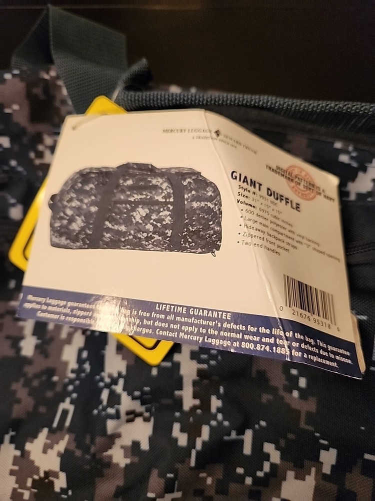 Character: NA Customized: No Size: Large Theme: Army Fabric Type: Polyester Country/Region of Manufacture: China Style: Travel Bag Model: 31x15x15 Vintage: No Pattern: NA Closure: Zip Personalize: No Occasion: Travel Product Line: K-Cliffs Bag Width: 15 in Department: Unisex Adults Material: Polyester Year Manufactured: 2000-2009 Handle/Strap Material: Polyester Handmade: No Lining Material: Polyester Country of Manufacture: China Features: NA Bag Height: 31 Color: Digital camo Type: Duffle Bags Brand: us navy Hardware Material: Metal Handle Style: Double Handles Bag Depth: 5 in