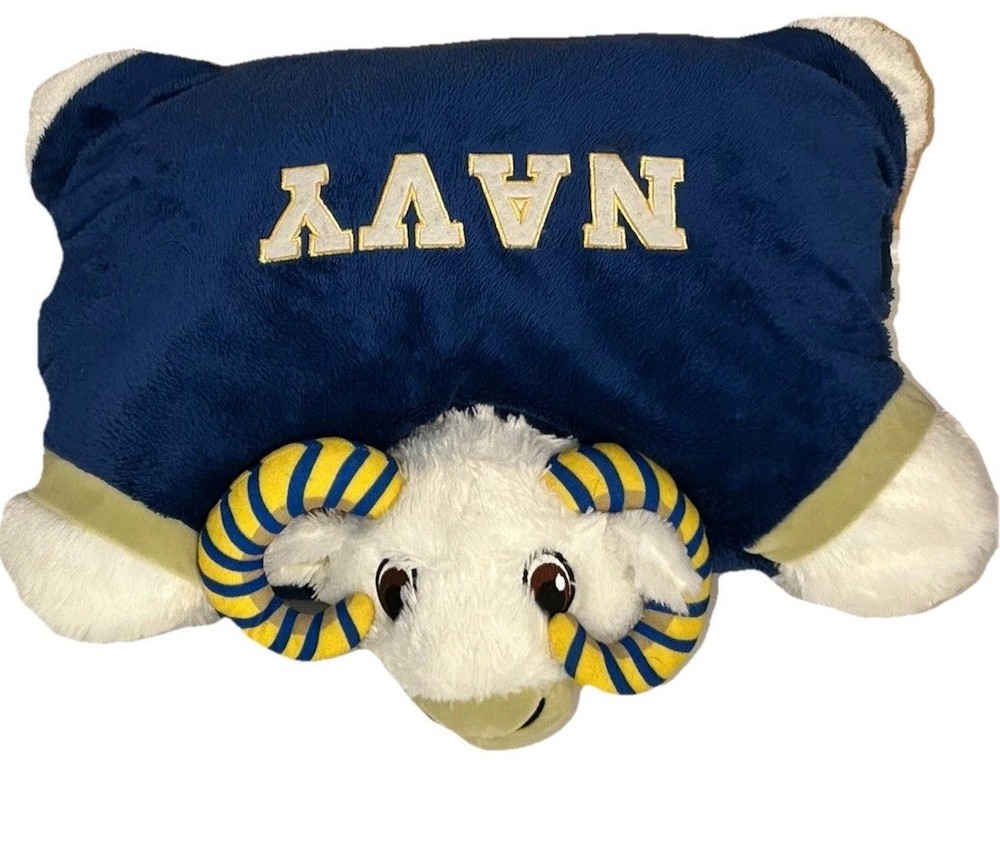 US Navy Midshipmen Pillow Pet Officially Licensed Product IT'S A PILLOW, IT'S A PET....IT'S A PILLOW PET! A super-soft chenille plush folding stuffed animal. So cuddly youll never want to put it down! Starts out as your pal, then un-velcro its belly, and it quickly becomes your pillow. * Super Soft and Cozy-Measures 18"x13"x5" when opened * Quality embroidery * Hook & loop fastener to stand upright