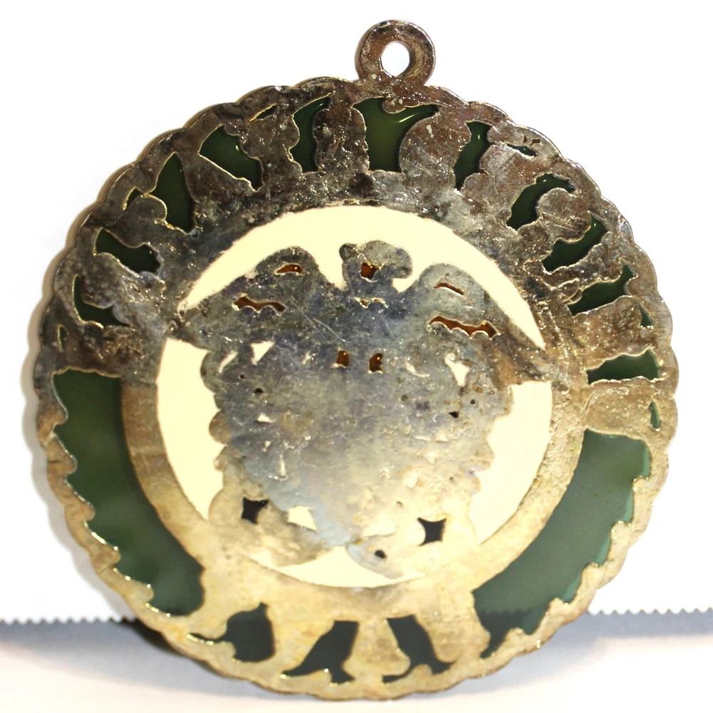 US Navy Stain Glass Vintage Retro Stamped Suncatcher Hanging Pendent Gold Trim Add a touch of vintage charm to your home decor with this beautifully designed US Navy stained glass suncatcher. The intricate design features a Bald Eagle, Anchor & Flag, all crafted in a green color with gold trim. Measuring small in size, this suncatcher is perfect for adding a pop of color to any room in your home. The stained glass material gives it a unique and elegant finish that is sure to impress. Ideal for any US Navy collector or as a gift for a loved one. See Photos