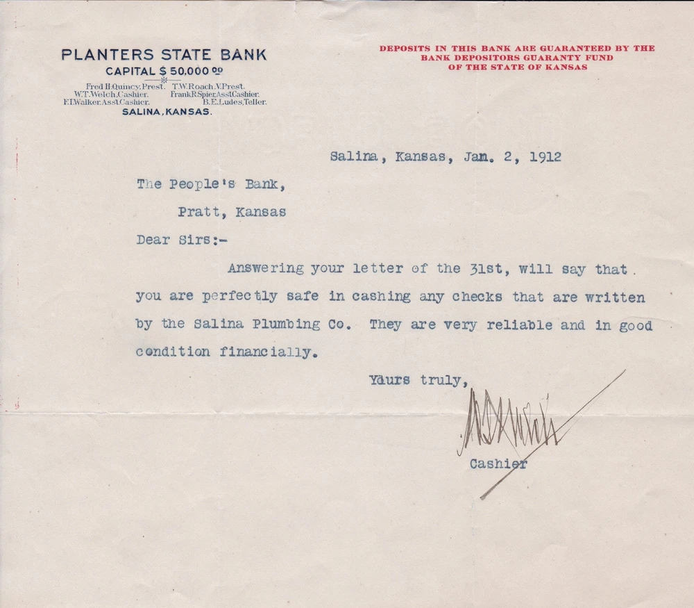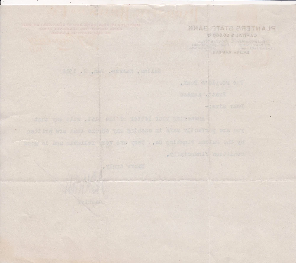 U.S. PLANTERS STATE BANK, Salina,Kan. Headed 1912 Reliable Firm Letter Ref 44519