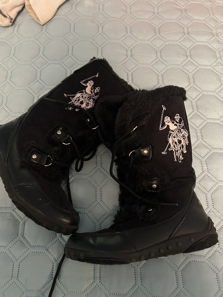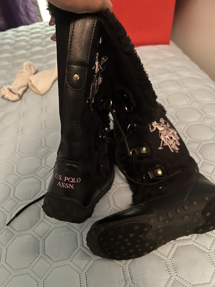 These Size 1 U.S. Polo Assn. boots are designed for young boys and feature a classic black combat style made from leather. With the iconic U.S. Polo Assn. brand, these boots offer a stylish and durable option for young boys. Perfect for everyday wear, these boots provide both comfort and a trendy look for various occasions.