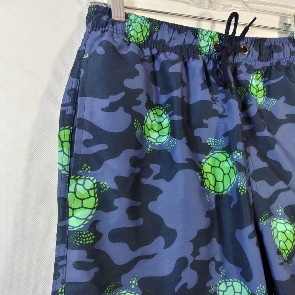 U.S. Polo Assn. Turtle Camo Swim Shorts Classic Navy Size Small Drawstring closure Machine Wash Enjoy beach days in style wearing the U.S. POLO ASSN. Turtle Camo Swim Shorts. Regular fit. Elasticized waist with drawstring. Side hand pockets. Allover camo and turtle print. New with tags approximate measurements waist across 15" rise 12" inseam 8"