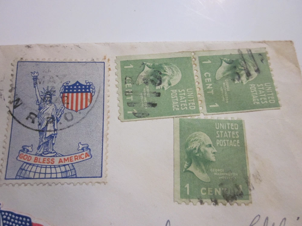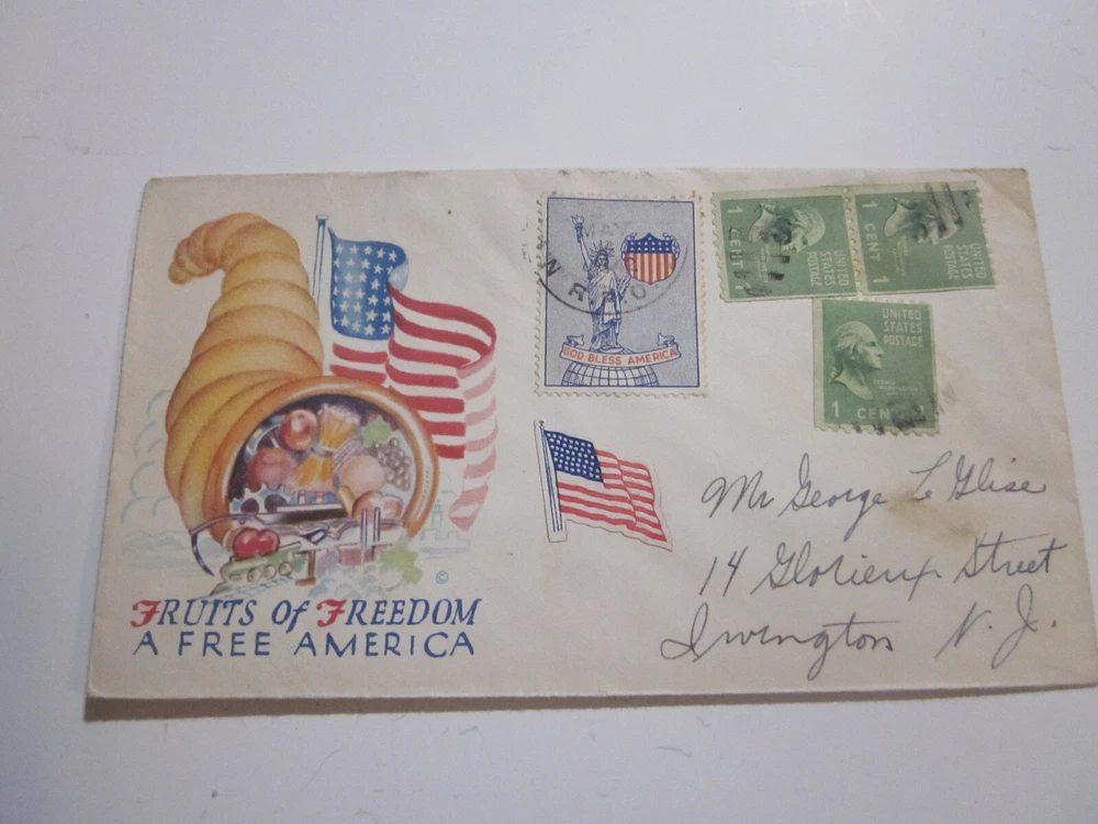 This US Postal History cover features the patriotic design of Fruits of Freedom and was manufactured in the United States during World War II. The cover was canceled with an RPO stamp and is uncertified. The denomination of the cover is 1 cent and it was issued between 1941-1950. The color of the cover is green and it is ungraded. This item is perfect for collectors of postal history and patriotic memorabilia.