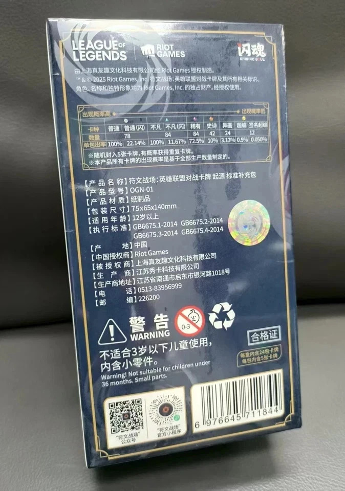 League of Legends: Runeterra TCG - Origin Series Booster Box Product Overview Premium Trading Card Game featuring your favorite League of Legends champions! The League of Legends: Runeterra TCG Origin Series brings the legendary world of Runeterra to life through beautifully crafted trading cards that combine strategic gameplay with collectible excitement. Product Specifications 1 Booster Box = 24 Booster Packs Each Booster Pack = 5 Game Cards Total Cards per Box = 120 Cards Special Card Variants & Collectibles 🌟 Alternative Art Cards Featuring stunning alternative artwork that reimagines your favorite champions in unique artistic styles. ⚡ Ultra Rare Cards Exclusive ultra-rare versions of legendary champions with premium finishes and enhanced visual effects. ✍️ Artist Signature Cards Ultra-rare signed editions featuring authentic signatures from renowned Riot Games artists who created the original champion artwork specifically for Runeterra TCG. Featured Content The Origin Series showcases 12 Legendary Champions , each available in multiple rarities: Standard versions Alternative art variants Ultra-rare premium editions Artist signature editions (extremely limited) Artwork & Design Every card features original artwork commissioned exclusively for Runeterra TCG by acclaimed illustrators from Riot Games' creative team. These aren't recycled game assets - they're brand new artistic interpretations created specifically for the trading card experience. Perfect For: League of Legends fans and collectors TCG enthusiasts seeking strategic gameplay Collectors hunting for rare signature cards Players looking to build competitive decks What Makes This Special: Authentic Riot Games partnership - Official League of Legends merchandise Artist signatures from the actual illustrators who created the artwork Premium card quality with enhanced finishes on rare cards Strategic gameplay balanced for both casual and competitive play High collectible value with multiple rarity tiers Condition: Brand New, Factory Sealed Language: Chinese Manufacturer: Official League of Legends TCG Get ready to enter the Rift with this premium collection of League of Legends trading cards! Important for EU/UK buyers: Import duties, taxes and charges are not included in the item price or shipping charges.even we offer free shipping, it only mean we pay shipping cost for you, but it not include any additional Customs fee once the package arrives your local Customs center. So p lease check with your country's customs office to determine what these additional costs will be prior to bidding/buying. That's the law from your government so that's your responsibility to pay any additional fee.