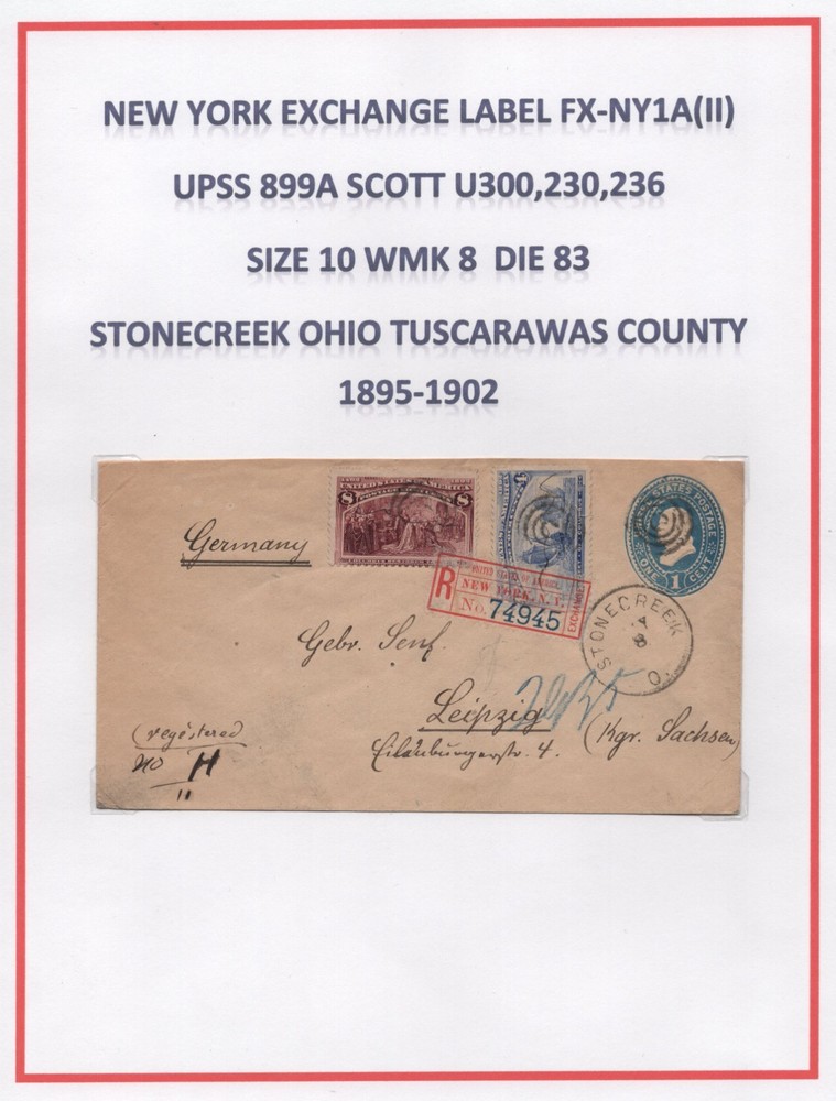 US TO GERMANY 1896 NEW YORK EXCHANGE LABEL UPSS 899A ON SCOTT #U300 UPRATED COLUMBUS ISSUES SCOTT #230, 236 STONE CREEK OHIO TO LEIPZIG SAXONY VERY FINE PLEASE VISIT MY EBAY STORE : Filatco Stamps BUY 5 ITEMS SHIPPING & REGISTRATION IS FREE INTERNATIONAL BUYERS PLEASE NOTE: ALL SHIPMENTS INCLUDE TRACKING Feel free to ask if you have any questions. PAYMENT WITHIN 2 DAYS IS APPRECIATED . FEEDBACK : I APPRECIATE YOUR BUSINESS AND MY TOP CONCERN IS TO MAKE SURE YOU ARE 100% PLEASED WITH ANY ITEM YOU PURCHASE. IF YOU HAVE A CONCERN OR A PROBLEM WITH INVOICE, SHIPPING OR ANY ITEM YOU RECEIVED PLEASE CONTACT ME FIRST BEFORE YOU LEAVE ANY FEEDBACK. I GUARANTEE YOU WILL BE 100% SATISFIED WITH THE TRANSACTION. I WILL CERTAINLY LEAVE YOU A POSITIVE FEEDBACK AS SOON AS I RECEIVE YOURS.