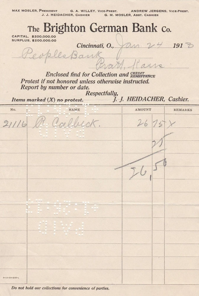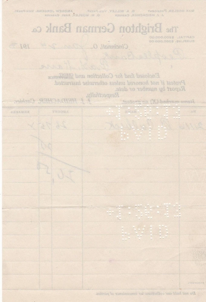 U.S. The Brighton German Bank Co., Cincinnati, O. 1913 Paid Invoice Ref 44388