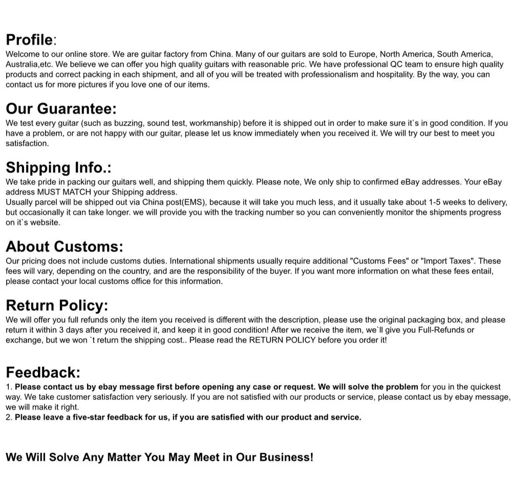 Welcome Here welcome to our shop. We guarantee that you will get what you see and hear, and will be treated professionally and enthusiastically. We are a professional guitar manufacturer and can provide you with the best services and products. If you need more help, please let us know and we will try our best to solve it for you and give you a pleasant shopping experience. If you like one of our products, we will provide you with a detailed answer. Please be assured that we can provide you with high-quality guitars at reasonable prices. ABOUT THE PICTURES The pictures are taken in our factories by ourselves. Each guitar is different from others because of the light in room or some other reasons .So there are maybe some differences between the pictures and the guitar you get. Every guitar cannot be the same in 100%, the pictures of the guitar that you see is just one of them. If you want some details about the guitar, please contact me. OUR GUARANTEE We test every guitar is in good condition before it is shipped out. When you receive the guitar, if you meet some problems (such as buzzing, sound test, workmanship) or you are not happy with our guitar, please let me know immediately and we will try our best to meet you satisfaction. FEEDBACK Communication is the best way to solve problems. If you have any questions or dissatisfied items to buy, please contact us before submit neutral or negative feedback, we will help you solve the problem as soon as possible until you are satisfied. Qualified transactions worthy of positive feedback from each other. When you are satisfied with your purchase, we sincerely hope that you can provide us with positive feedback. After everything is completed, we will immediately leave positive feedback for you. RETURN POLICY What should I do if there is a problem? If your order has a problem, you first have to send a message to your sales engineer. Anyway, he or she will take care of you. Our unique policy is that we will solve all the costs of all costs and let you be satisfied. What should I do if I receive a defective product? When you receive the product damage or defective product, send us the photo to verify, then we will provide you with a full refund, please return them within 3 days, and keep the same state when we send it, After we receive the project, we will provide you with a full refund or reissue. How to return the item? If the product you receive is not up to your expectation, I am sorry, the project must return to the state of receiving it, including all accessories, files, and packaging materials. Please use a traceable delivery method, such as federal express or UPS or USPS We recommend that you buy your own transport label and assure your package when you send us back. Sometimes things will be damaged during the way. If this happens, we hope that you will be protected. ( If you buy a finished product such as guitar, there is no quality problem after you receive the product, we will not pay the return shipping. If you want to replace it, we can send you new, if it is due to the quality of accessories, we can send your parts for free. ) Thank you very much for your coming our store, wish you have a good shopping !
