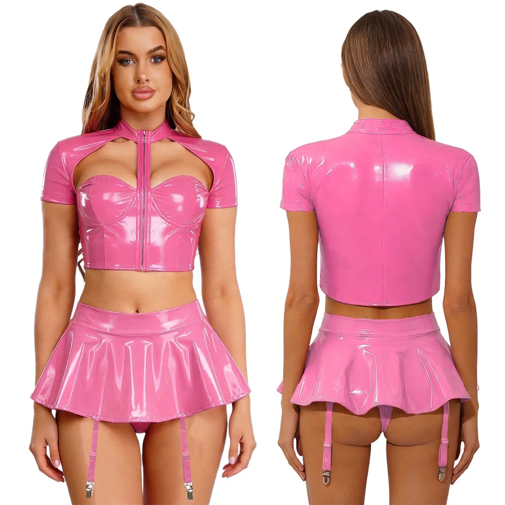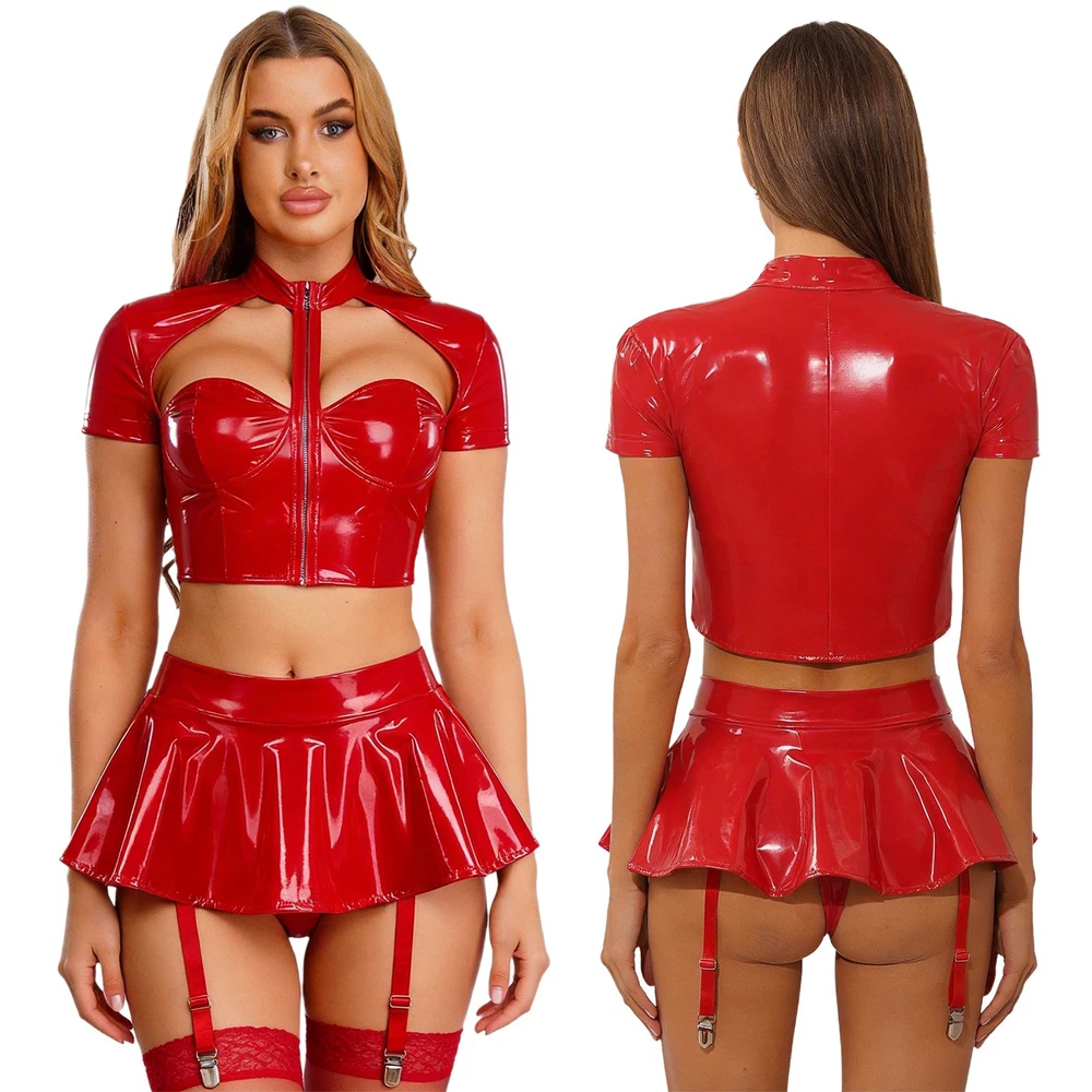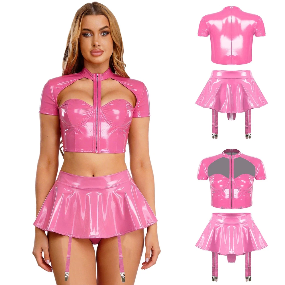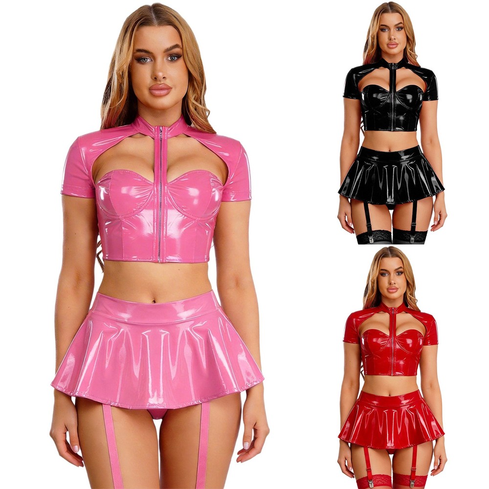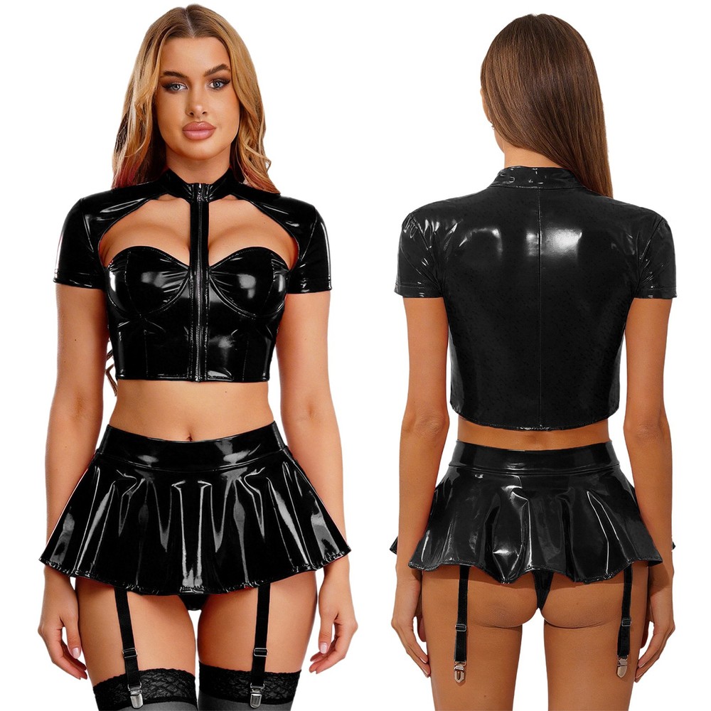 US Women Edgy Gothic Shiny Leather Cutout Bustier Crop Top Mini Skirt Garter Set
