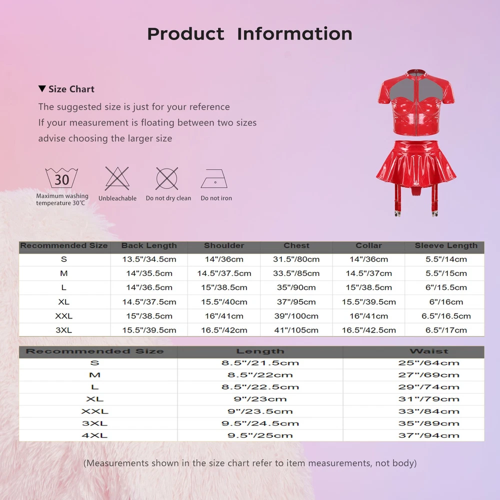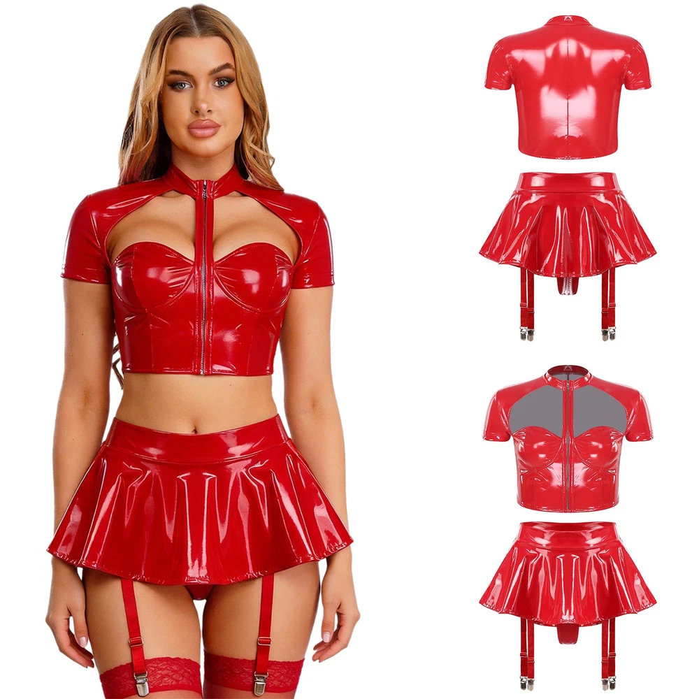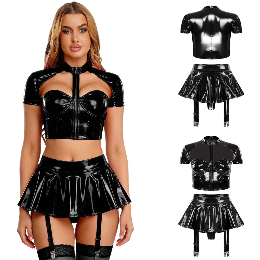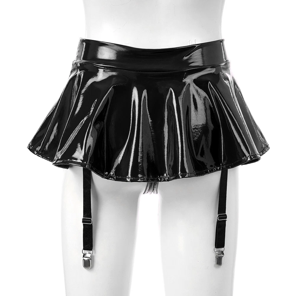 US Women Edgy Gothic Shiny Leather Cutout Bustier Crop Top Mini Skirt Garter Set