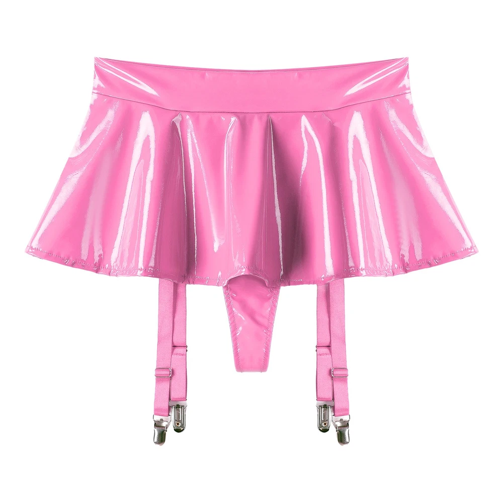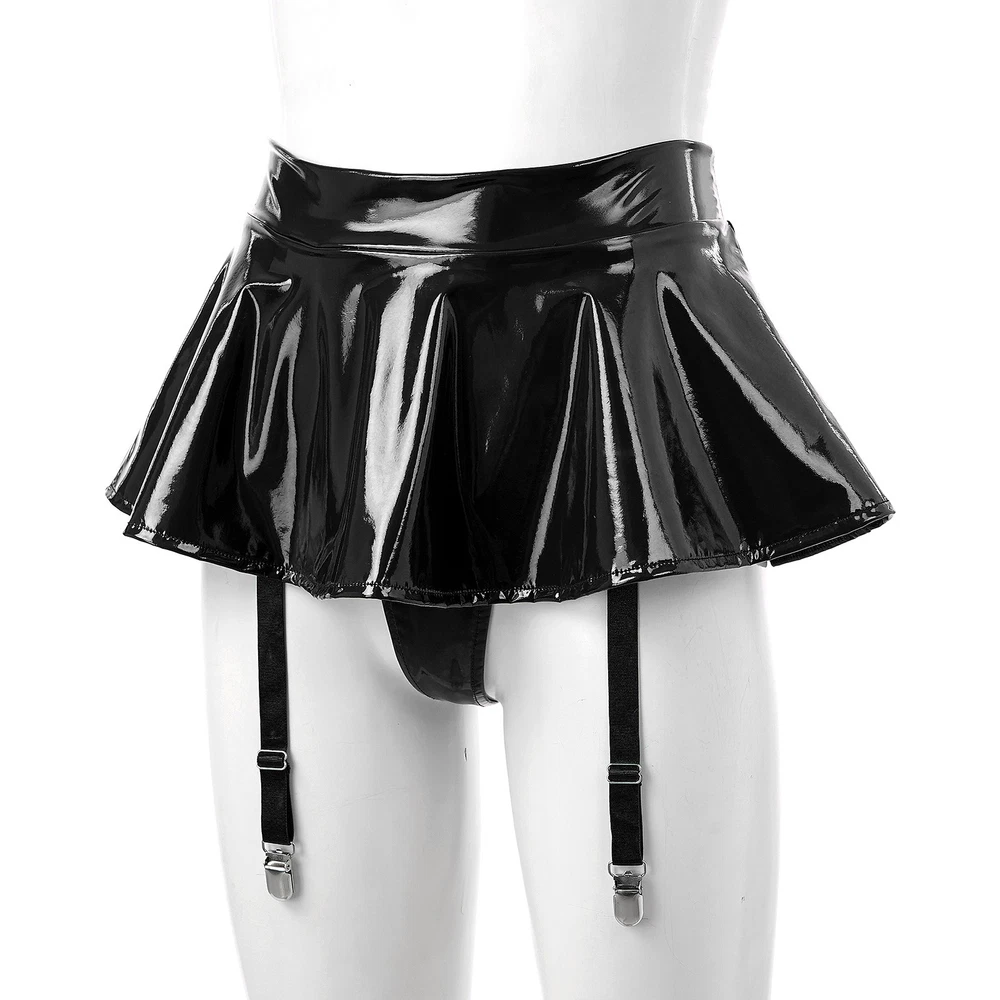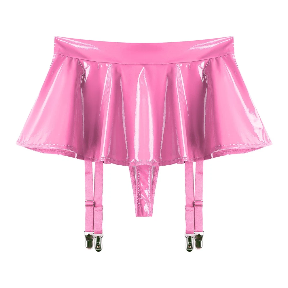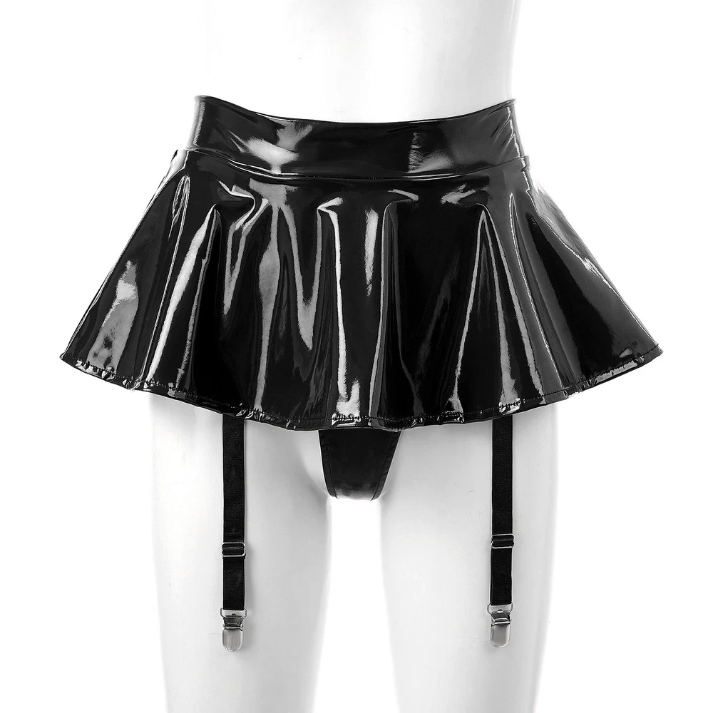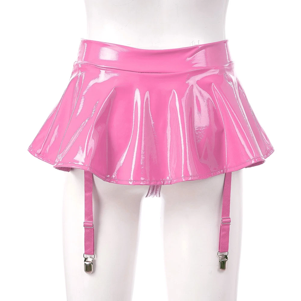 US Women Edgy Gothic Shiny Leather Cutout Bustier Crop Top Mini Skirt Garter Set