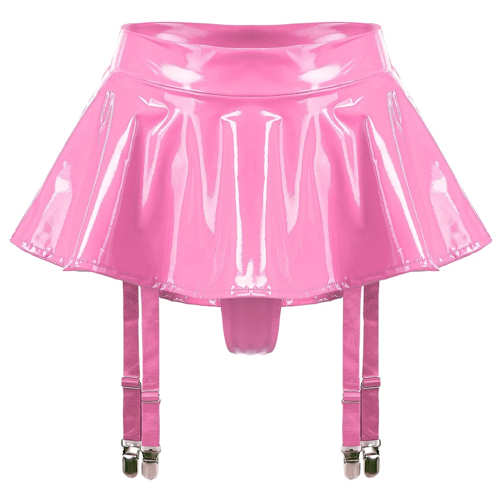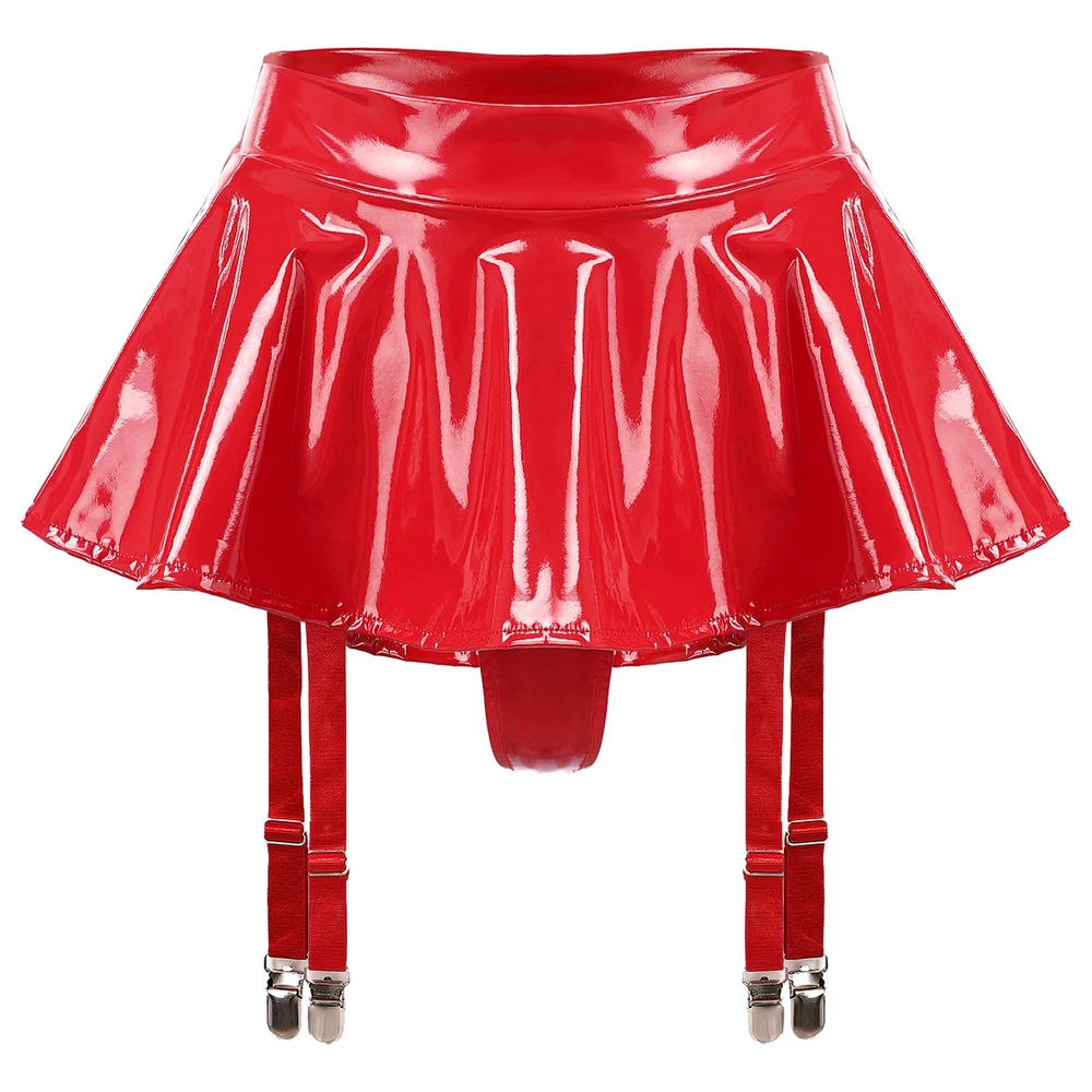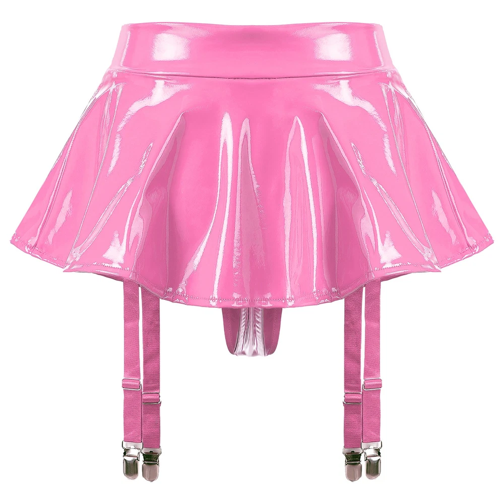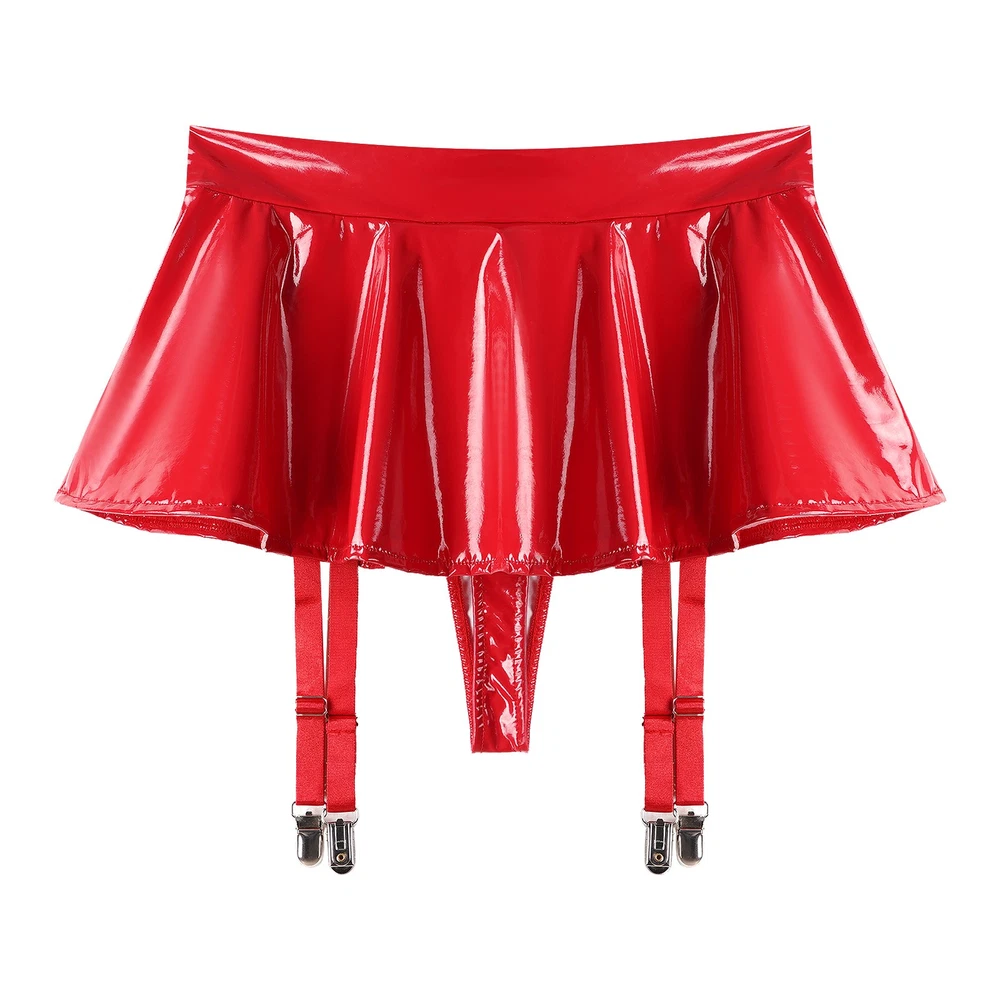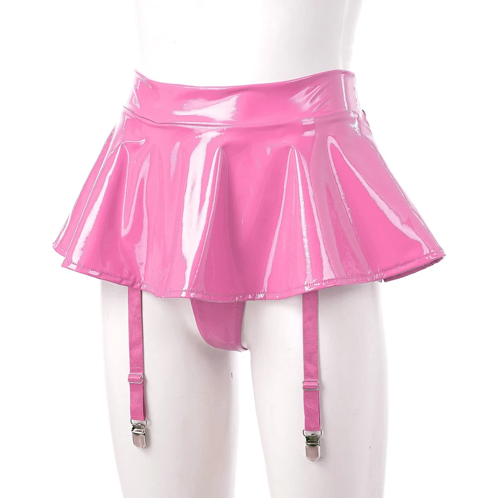 US Women Edgy Gothic Shiny Leather Cutout Bustier Crop Top Mini Skirt Garter Set