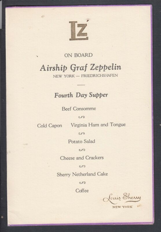 USA 1929 GRAF ZEPPELIN OVER NEW YORK ON BOARD FOURTH DAY SUPPER MENU USA 1929 GRAF ZEPPELIN OVER NEW YORK ON BOARD FOURTH DAY SUPPER MENU . Trivial edge wear; attractive. The purple color of the border & the style of some of the print indicates that this was used on the 1929 World Flight. Since there is no date stamped on it, determination cannot be made if this was on the initial leg of the flight from Lakehurst at the beginning of the flight or the return flight to Germany from Lakehurst at the end of the flight. Please examine lot scan carefully and please send any questions at least 48 hours before the auction closes. Please note that cover condition usually includes normal wear and tear to cover edges, opening tears and some creases and wrinkles. Only exceptional or extreme condition issues will be mentioned. Legend: PS - Postal Stationery FL - Folded Letter SFL - Stampless Folded Letter RPO - Railway Post Office CDS - Circular Date Stamp DPO - Dead Post Office SHIPPING Shipping is by regular mail $1.99 for Canada and USA and $2.99 for rest of the world. This shipping rate is for up to 3 items. For 4-6 lots it is an additional $1 and for every multiple of 3 lots beyond 6 it will be an additional $1. If a buyer has bought multiple lots he/she may elect to have them sent as multiple shipments by regular mail with each shipment not exceeding $100. Please note that in some cases the shipping may be slightly higher due to the fact that the item is oversize. If it has to be mailed in a 8.5 x 11 size envelope the shipping rate is an additional $1 then the quoted rates. All shipments valued over $100 including shipping will be sent by Registered mail for an additional $12 to the regular mail rate total. The maximum amount per shipment is $500 (including shipping). Any purchases higher than this total amount will be invoiced separately and paid for and shipped separately. Any additional items sent separately will be at a shipping cost calculated on the same basis as the first shipment. Any single item valued at over $250 or multiple items shipped together valued over $700 sent outside of the USA or Canada are to be sent by expedited mail (signature option) exact shipping costs to be determined but please expect it to be in excess of $60. These shipping requirements are not negotiable and are based on the current eBay and Paypal policy which provides no seller protection for fraud or theft above these amounts. For the following countries all shipments valued at over $60 may be sent by Registered mail unless you are a repeat customer. These currently include Mexico, Romania, Russia, China, Brazil, Israel, Turkey Thailand and any other country that the seller at his sole discretion determines to be high risk. Please note that for Registered mail we actually charge significantly below our cost for shipping. Please note that in an auction items may start at a very low price and may be sold at prices that may considerably exceed the original starting bid. For the purposes of calculation of shipping costs the final cost of the item will be used to calculate the shipping rate and method of shipping NOT the original shipping cost specified in the listing. INVOICE Buyers please wait until I send an invoice with the correct shipping cost instead of doing self checkout as this will save me time in making a Paypal request for additional shipping or tax costs. SHIPPING TIME All items are sent within 5 business days of receipt of payment. It then takes approximately 1-2 weeks (sometimes longer) for the postal system to make it’s delivery. If you receive a notice from eBay stating that the item has been shipped it may not be correct. Please look at your payment date and add 5 business days and contact us only if your item has not been received 2 weeks from this date. NOTE TO CANADIAN BUYERS Note to all Canadians Buyers: Canadian law requires me to charge GST/HST depending on your Province of residence on the total cost of your purchases including shipping. Ontario residents must pay an additional 13% on the cost of the purchased item. Taxes do not apply if your purchases are shipped to an address outside of Canada. _gsrx_vers_1292 (GS 8.3.6 (1292))