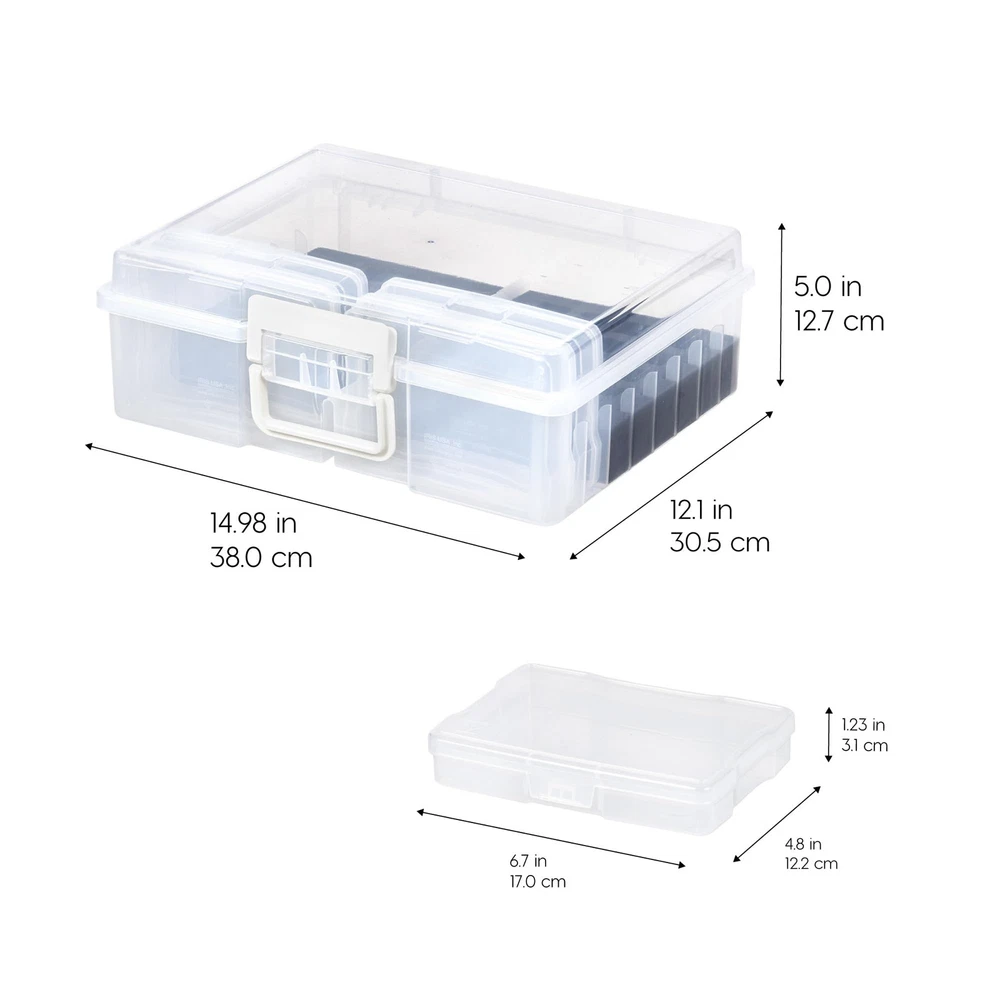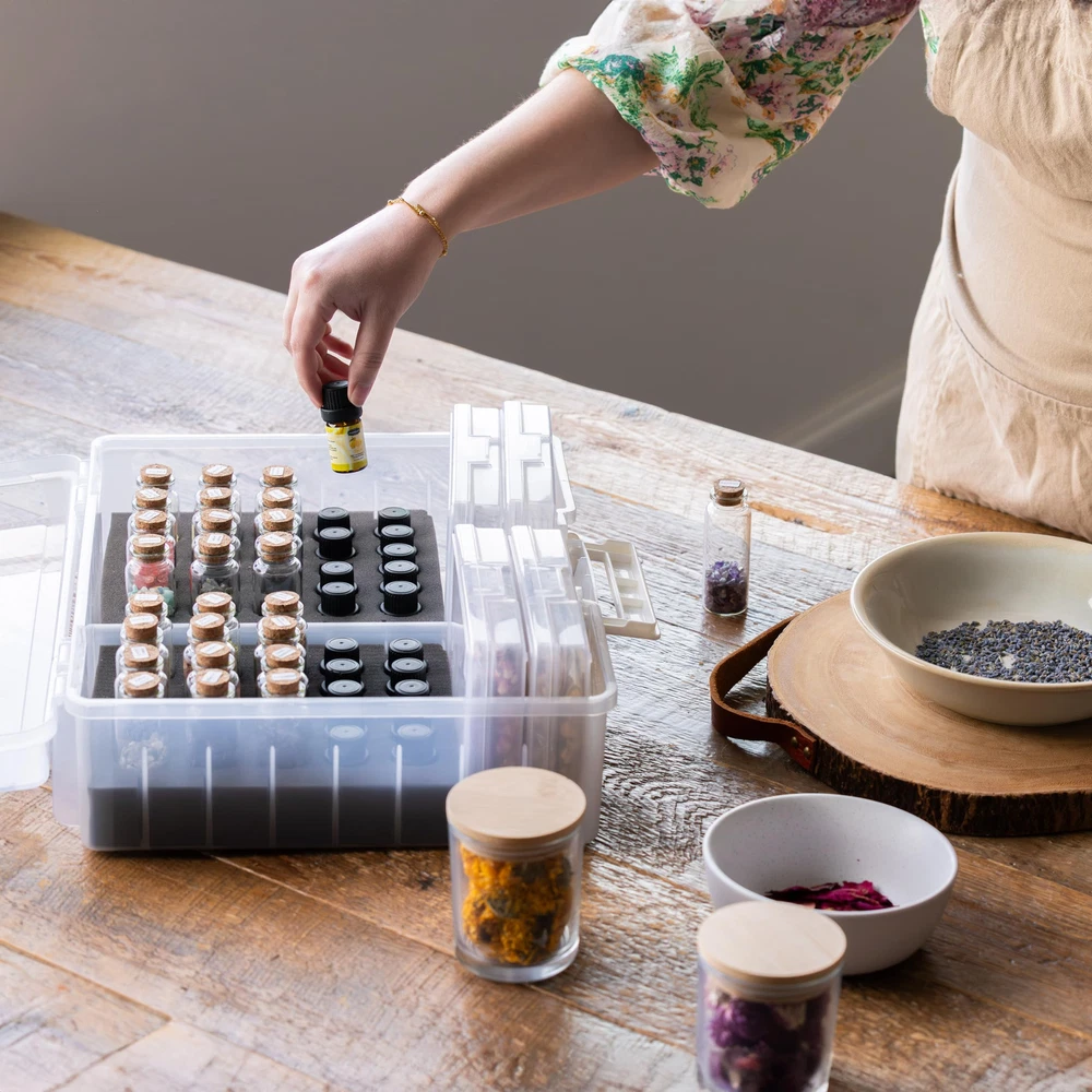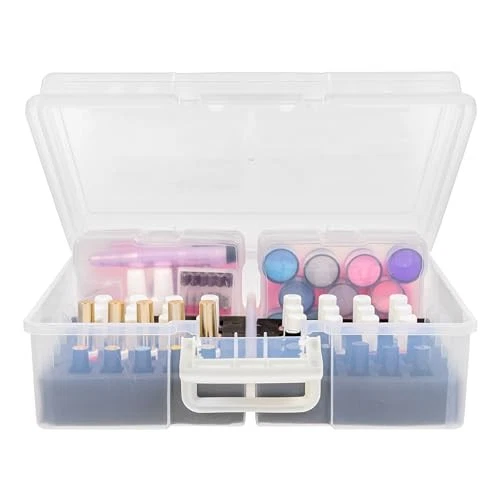 Elevate your organization game with our Portable Plastic Cosmetic Train Case, designed for professionals and enthusiasts alike. This sleek and durable case offers unparalleled convenience and protection for your essential tools, cosmetics, or craft supplies. Built to withstand the rigors of travel and daily use, this case features a robust plastic exterior that guards against impacts and inside, you'll find foam inserts that are perfectly sized to fit your nail polish, essential oils, and makeup bottles securely. Each case features 4 inner cases to keep loose tools, nail tips, small accessories and supplies organized and within reach, giving you a -stop-for all of your beauty needs. Equipped with a comfortable, ergonomic handle and secure latch, this case is easy to carry and ensures your contents remain in place and easy to find. Perfect for makeup artists, hobbyists, technicians, and anyone who needs a reliable storage solution. Whether you're transporting tools, cosmetics, or other essentials, this train case has you covered. The case features a transparent design with clean lines and a glossy finish, making it not only functional but stylish as well. Upgrade your storage with our Portable Plastic Train Case and enjoy the perfect blend of durability, customization, and portability. Ample Storage Capacity: Ingeniously crafted to accommodate a collection of 44 nail polish or essential oil bottles and four dedicated cases for tools and other supplies. Compact with ample storage space inside, keep all of your cosmetology tools on hand and ready to go. Taking your business to friends and clients has never been easier. Advanced Protection System: Designed for delicate items like nail polish, essential oils, and miniatures, it features integrated foam padding for superior safeguarding. With carefully crafted compartments, it prevents spills, breakages, and damage. Plus, it offers an extra layer of defense against sun exposure, keeping your cherished products protected. Thoughtful Case Design: Keep your cotton pads, nail files, gems, and other accessories neatly organized and easily accessible whenever you need them. No digging through cluttered drawers or searching for misplaced items—everything is conveniently at your fingertips and easy to find thanks to the transparent design of the cases. Stackable and Secure Storage: Stack multiple train cases on top of each other to create a customized storage solution that fits your collection and space and makes traveling a breeze. The latching system ensures that your nail polishes and tools remain securely in place through every bump in the road, giving you peace of mind and a clutter-free environment. The Perfect Size: Each nail polish holder organizer case measures 12.08"L x 14.98"W x 5.05"H; Each inner case measures 4.75"L x 6.7"W x 1.2"H; Each foam insert contains 10 spots of 0.8" squares and 12 spots of 1.0" squares.
