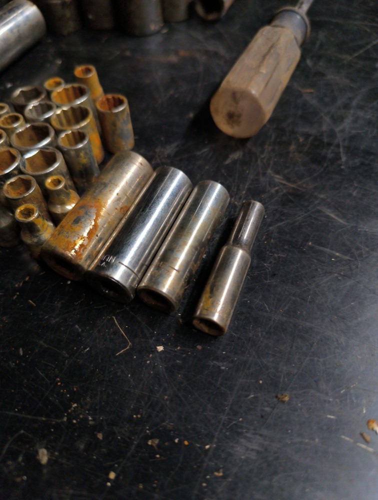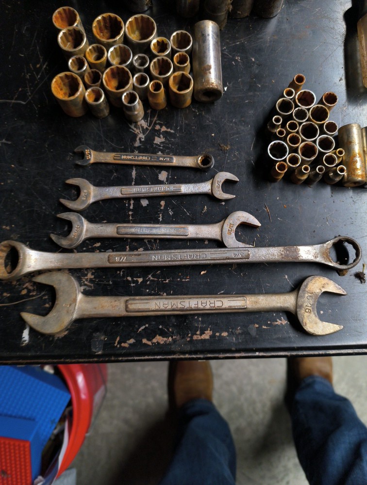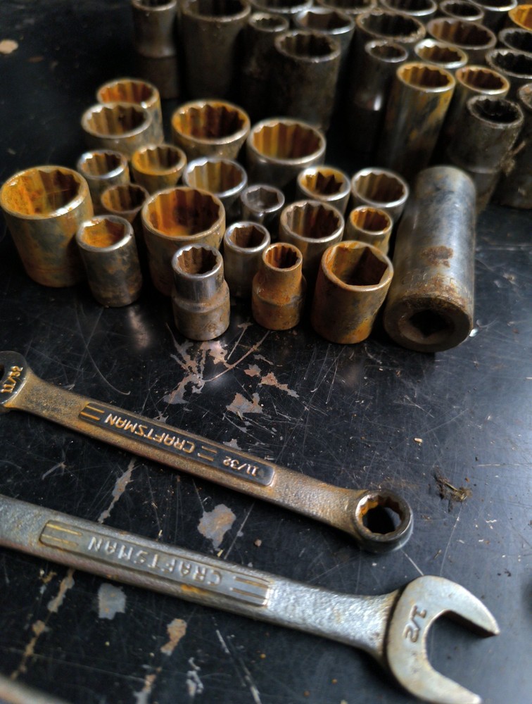 91 pc craftsman lot mostly sockets 1/4-1/2 drive metric and standard all in various states, some have rust and others grease while some remain clean also not 5 standard wrenches and a quarter inch driver