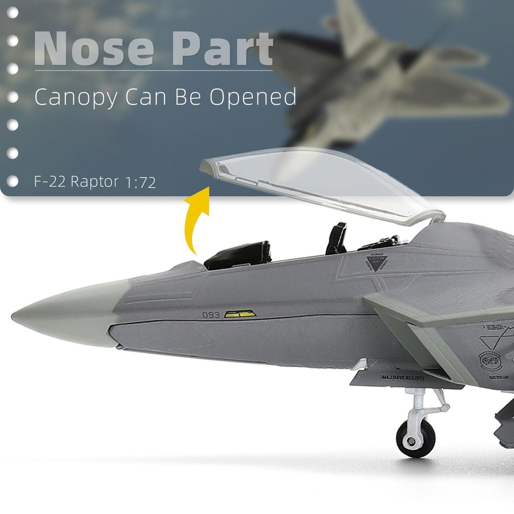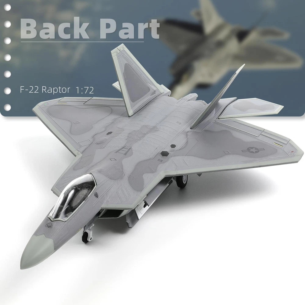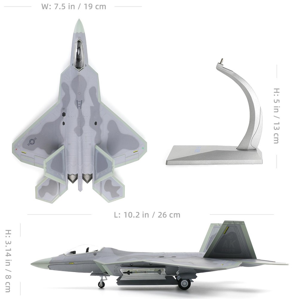 About this item 【Realistic restoration】-F22 Raptor is the United States Air Force fifth-generation stealth fighter, F-22 Raptor model from the shape of the details carried out a very realistic restoration of the prototype fighter. Vertical tail painting has three kinds (AK/TY/FF), the painting for the AK of the F22 aircraft model prototype in Elmendorf AFB service, former subordinate to the Air Combat Command 7 FS, but also painted with 05 093 number, so you have a sense of real experience. 【Material Craft】-The F-22 Raptor Fighter Jet Aircraft Model is a metal die-cast aircraft model kits, 90% made of high quality metal, the model is strong and durable. The surface is baked with baked paint to avoid the problem of cracking or fading paint. This military display airplane model also features fine details such as cockpit, wings, missiles, etc., and clear painting and markings, smooth surface and bright colors, which restore the appearance of the real fighter jet. 【Size and Details】- The 1/72 diecast aircraft model has an awesome scale size. The overall dimension size is 10.24*7.48*7.48 inches, it weighs 2.43 pounds, and the details and craftsmanship of its performance yet gives a visual effect of heavy solidity. The surface is made of baking paint process so that the paint will not fade. Besides, the cockpit of this airplane model can be opened, and the belly of the plane is open, so you can see the missile parts in the bomb bay. 【Fine Packaging】-Package the fighter jet model kit in a nice box to ensure that it will not be damaged during shipping. The package also comes with a model airplane display stand for your display. Whether you are a military enthusiast, a history buff, our F22 Raptor airplane model kit is perfect for you. Not only is it perfect for any military model collection, it also makes a great gift for aviation military enthusiasts. 【Worry-free Purchase】-We adhere to strict production requirements, control the product quality of pre-build plane model kit, and ensure that every customer gets satisfactory high-quality products. Within one year, if you find any defect in 1/72 F22 Raptor aircraft model, we will provide you with warranty service. If you meet any problem, please feel free to contact us, we will solve it within 24 hours.Thank you for your trust in our products!