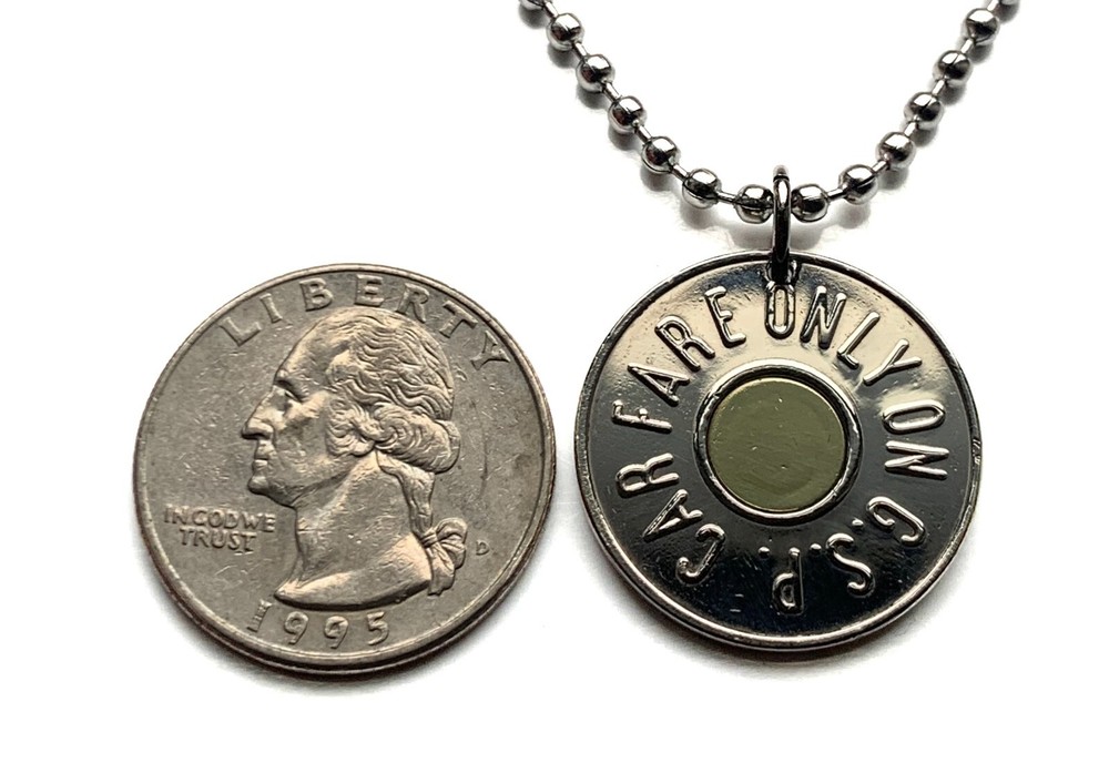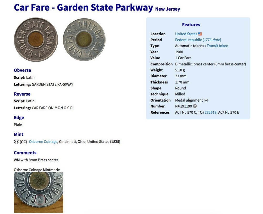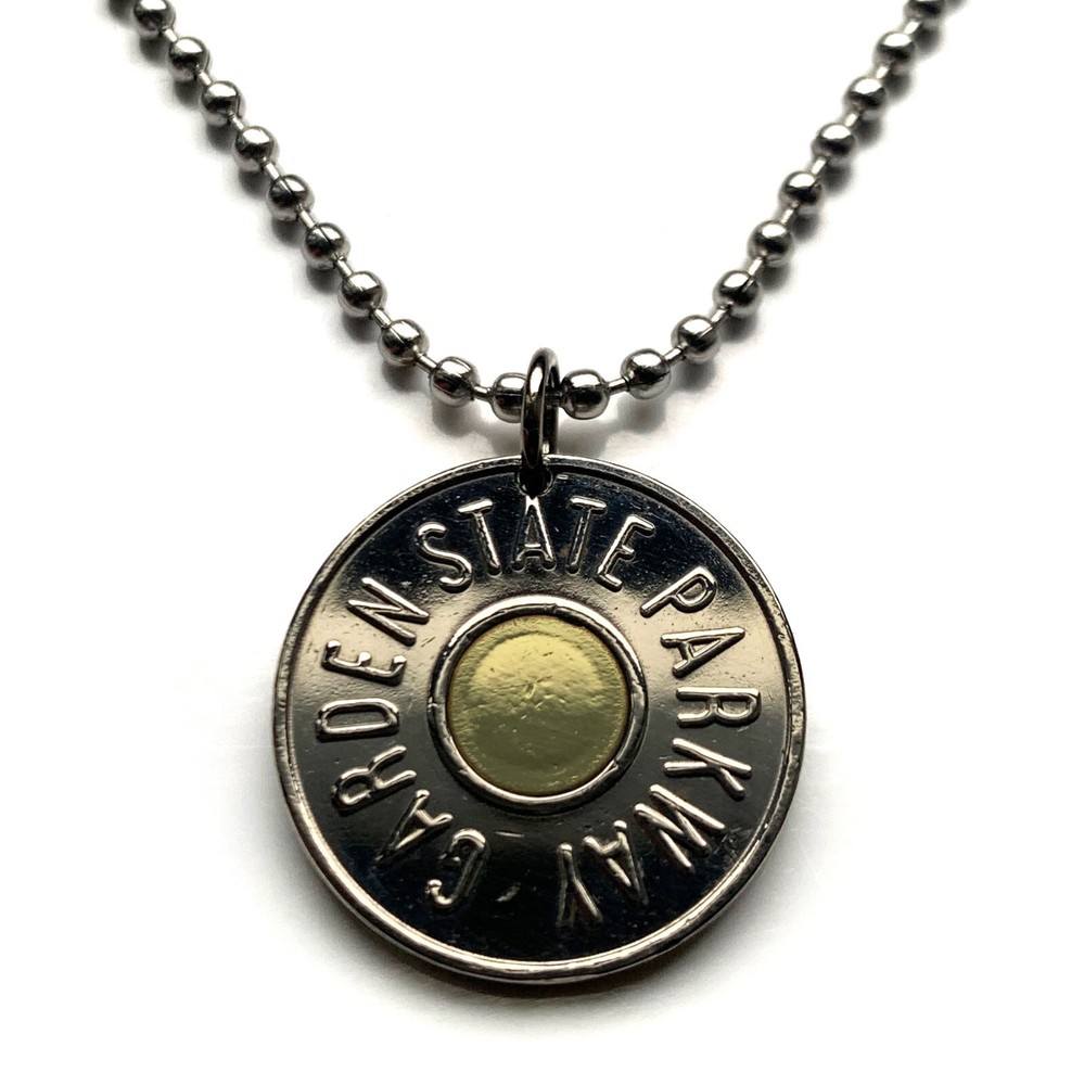 1988 New Jersey Garden State Parkway Car Token {36S} FEATURING front lettering: GARDEN STATE PARKWAY back lettering: CAR FARE ONLY ON G.S.P. • quantity 1 • demonetized {no longer in circulation} polished Bi-metallic coin Copper-nickel with 8 mm brass center • diameter: 23 mm • weight: 5.10 g • comes with a 24" stainless steel ball chain 1988 USA United States of America New Jersey GSP Garden State Parkway Car Token coin pendant necklace jewelry NJ Highway Authority Transit Transportation Bergen Ocean One Fare Cape May Montvale Pine Barrens Byway Lower Township Atlantic County Monmouth Burlington Middlesex Union Essex Passaic