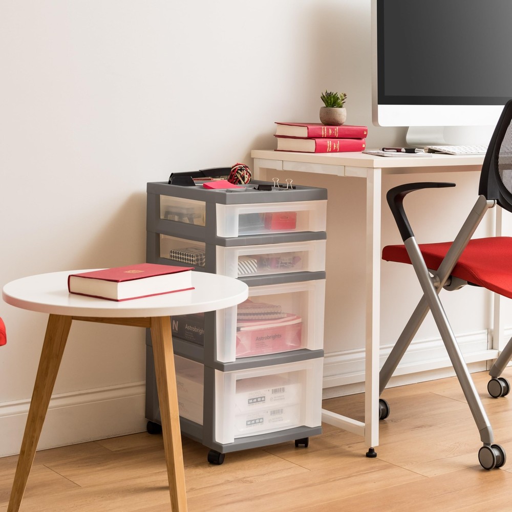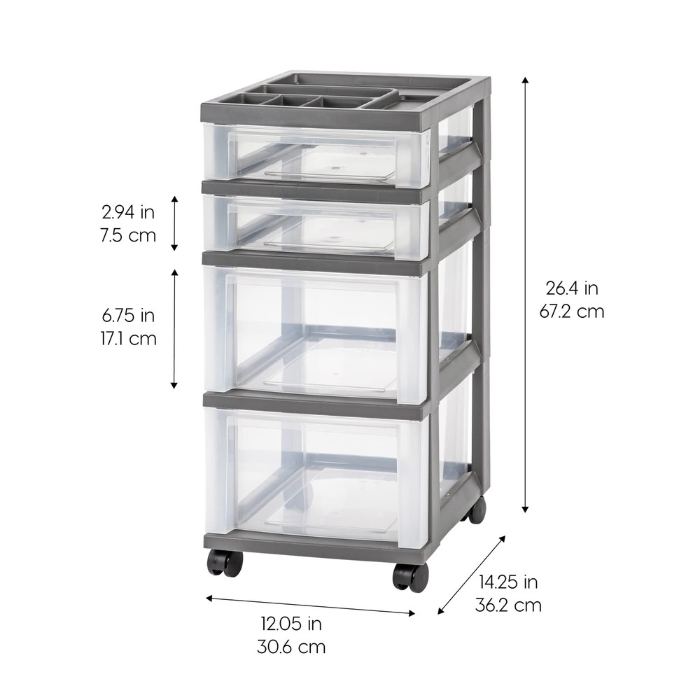 Usa Drawer Cart Offers A Practical Storage Solution For Any Room Of The Home.Organize And Store A Variety Of Household Items That Are Frequently Used In The Bedroom, Kitchen Pantry, Bathroom, Craft Room, Nursery, Or Dorm Room. It Could Be Used To Store Important Documents, Paper, Files, Or Stationaries At The Office.Clear Drawers Allow Contents To Be Easily Identified While Keeping Them Neat And Contained.Drawer Stops Prevent Drawers From Being Removed Accidentally. Use The Included Casters To Create A Rolling Storage Option Allowing You To Easily Transfer The Unit From Room To Room At Your Convenience. This Black Drawer Cart Has A Multi-Purpose Use And Is A Versatile Storage Option For Any Room Of The Home. Ideal For Controlling Clutter And Keeping Living Spaces Neat And Organized.The Cart Top Lid Is Designed To Organize Small Parts For Easier Accessibility. This Could Be Used To Place Pens, Paperclips, Paper And So Much More.Usa Plastic Drawer Carts Are Made In The Usa. All Of Our Products Are Green-Circle Certified. We Can Organize Our Home And Protect Our Earth At The Same Time. Multi-Purpose Oragnizer: Store A Variety Of Household Items That Are Frequently Used In The Office, Closet, Under-Desk, Kid’S Room, Craft Room, Nursery, Or Dorm Room Mobile Storage Solution: Removable Wheels Are Included, Can Be Attached To The Foot Of The Chest So You Can Move It Around Smoothly, Or Remove Them For Secured Placement Made In Usa: High-Quality Materials Are Used For Our Domestically-Manufactured Products. The Sturdy Plastic Makes These Durable, And The Smooth Glide Drawers Give You Easy Access To Contents. We Use Recyclable Material, So Our Products Are Green-Circle Certified Drawers : Drawer stops are attached on both sides of drawers to prevent drawers from falling out. Entire Dimensions: 14.25"D X 12.05"W X 25.94"H, Drawer dimensions: 12.5”D X 9.5”W X 2.94”H (Shallow) / 6.75”H (Deep).