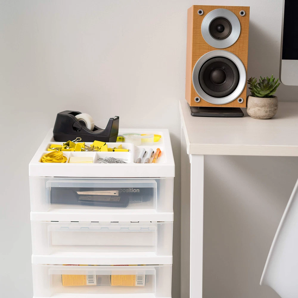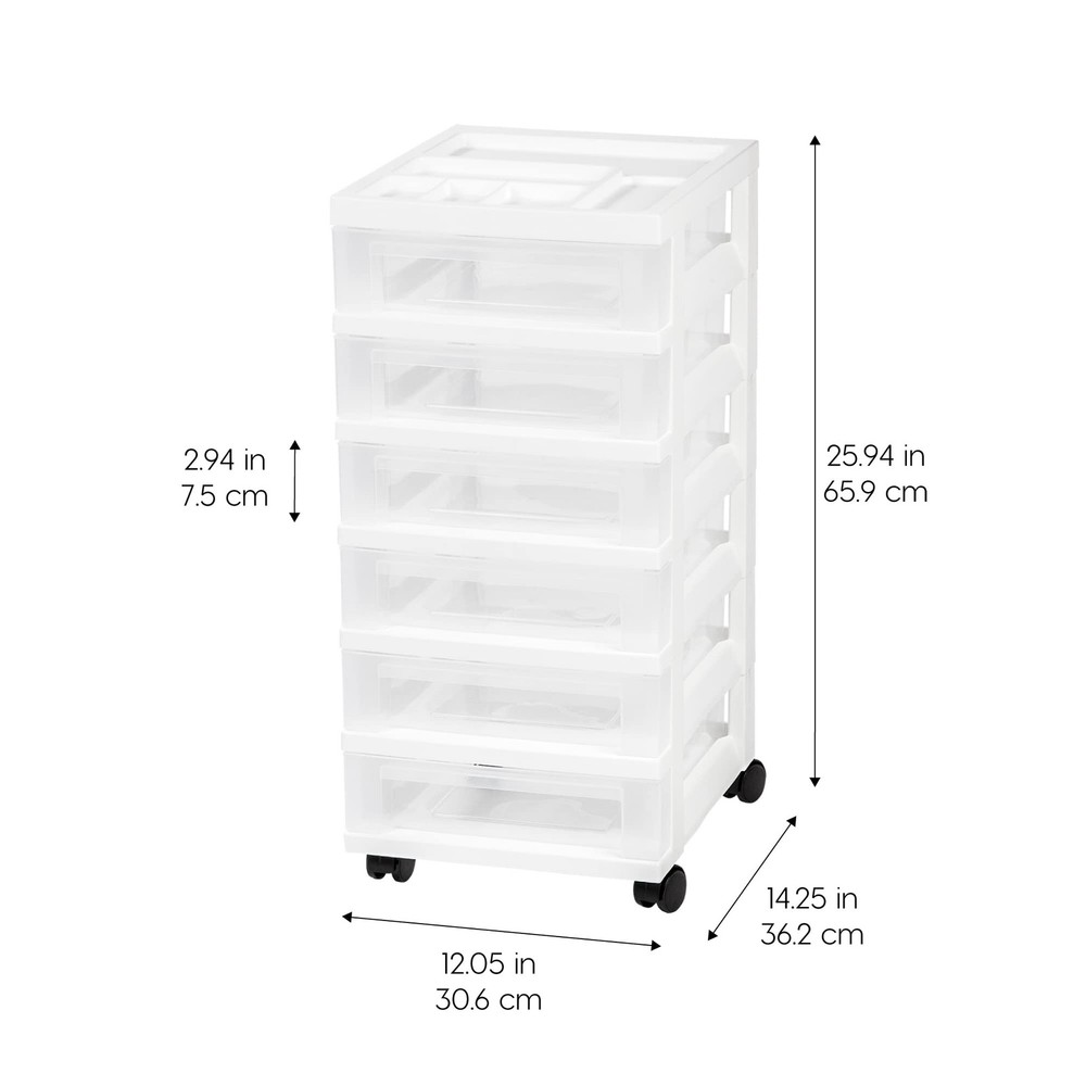 USA Storage Drawer Cart USA Drawer Cart offers a practical storage solution for any room of the home. Organize and store a variety of household items that are frequently used in the bedroom, kitchen pantry, bathroom, craft room, nursery, or dorm room. It could be used to store important documents, paper, files, or stationaries at the office. Clear drawers allow contents to be easily identified while keeping them neat and contained. Drawer stops prevent drawers from being removed accidentally. Use the included casters to create a rolling storage option allowing you to easily transfer the unit from room to room at your convenience. This black drawer cart has a multi-purpose use and is a versatile storage option for any room of the home. It's Ideal for controlling clutter and keeping living spaces neat and organized. The cart’s top lid is designed to organize small parts for easier accessibility. This could be used to place pens, paperclips, paper and so much more. USA Plastic Drawer Carts are made in the USA. All of our products are Green-circle certified. We can organize our home and protect our Earth at the same time! MULTI-PURPOSE ORAGNIZER: Store a variety of household items that are frequently used in the office, closet, under-desk, kid’s room, craft room, nursery, or dorm room MOBILE STORAGE SOLUTION: Removable wheels are included, can be attached to the foot of the chest so you can move it around smoothly, or remove them for secured placement MADE IN USA: High-quality materials are used for our domestically-manufactured products. The sturdy plastic makes these durable, and the smooth glide drawers give you easy access to contents. We use recyclable material, so our products are green-circle certified. DRAWERS: Drawer stops are attached on both sides of drawers to prevent drawers from falling out. Drawer dimension: 12.5”D X 9.5”W X 2.94”H DIMENSION: 14.25"D X 12.05"W X 25.94"H