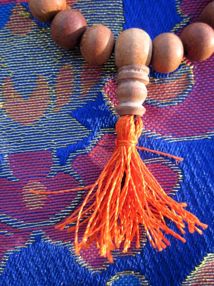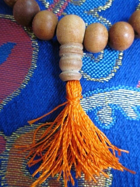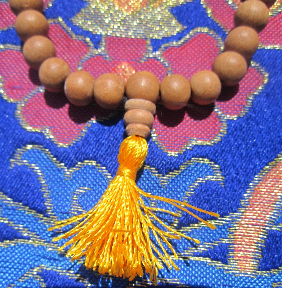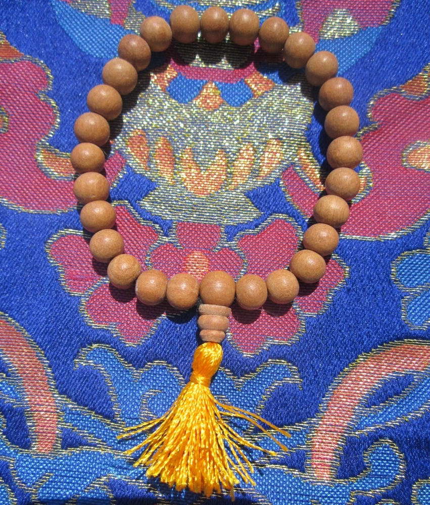 USA Seller LARGER Tibetan Buddhist Traditional 27 Bead Sandalwood 8mm Wrist Mala traditional sandalwood Tibetan Buddhist style wrist mala sized for a larger wrist measures around 8.5" around the outer edge - inner edge will be smaller tassels are a shimmery saffron color 27 beads, plus the guru bead Sandalwood is considered to be of the padma ( lotus) group and attributed to Amitabha Buddha . Sandalwood scent is believed to transform one's desires and maintain a person's alertness while in meditation" suitable for larger wrists sandalwood is protected world-wide; these are from a sandalwood tree farm For more information about genuine sandalwood, please see below *** Buy With Confidence: We are practicing Buddhists We respect the importance of these religious materials We use the same products that we sell USA-based —————————————- *** True sandalwoods Sandalwoods are medium-sized hemiparasitic trees. Notable members of this group are Indian sandalwood ( Santalum album and Australian sandalwood ( Santalum spicatum ). Others in the genus species have fragrant wood. These are found in India, Bangladesh, Sri Lanka, Australia, Indonesia, and the Pacific Islands. In India, Bangladesh and Sri Lanka it is called Chandan. Although sandalwood trees in India and Nepal are government-owned and their harvest is controlled, many trees are illegally cut down. Sandalwood oil prices have risen to $1,000–1,500 per kg recently. Sandalwood leaf Producing commercially valuable sandalwood with high levels of fragrance oils, requires Santalum trees to be a minimum of eight years old, but at least fourteen years is preferred. Australia is the largest producer of Santalum album, the majority grown around Kununurra, Western Australia. View more great items