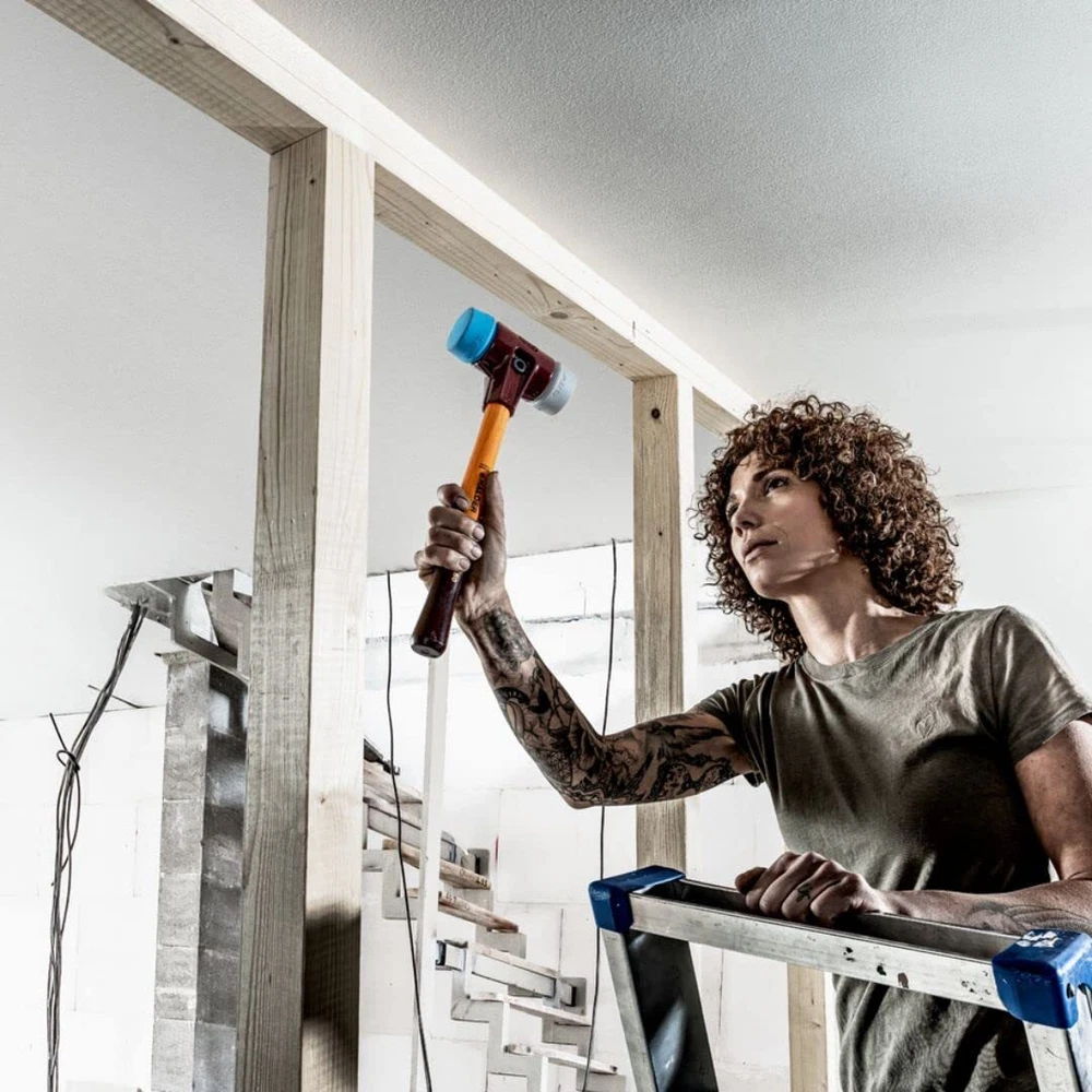"The Simplex Mallet is the signature hammer in the line. This patented hammer has a "split housing' design that is made from heavy duty cast iron. This split housing allows it to be take apart and the components can be replaced when worn or damaged. It solidly locks in the variety of replaceable insert faces. The faces are made of several different durable materials; from soft rubber to medium hard plastic to hard nylon. also offers aluminum and copper faces for hitting very hard surfaces such as hardened steel (copper faces are only with Simplex with reinforced cast iron housing; for details). SIMPLEX soft-face mallet with the insert combination of TPE-soft (blue, soft, no marring) / TPE-mid (grey, medium hard, no marring). Cast iron housing with integrated handle protection sleeve and excellent break resistance. High-quality, vibration-damping, and ergonomically shaped wooden handle; grip area with double coat of varnish (resistant to dirt). All parts can be replaced / retrofitted, resulting in great savings in cost and resources. Available in sizes of D30mm to D60mm.