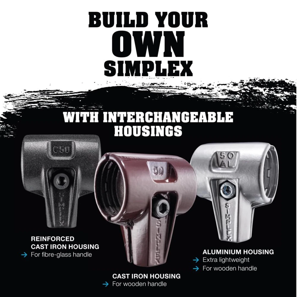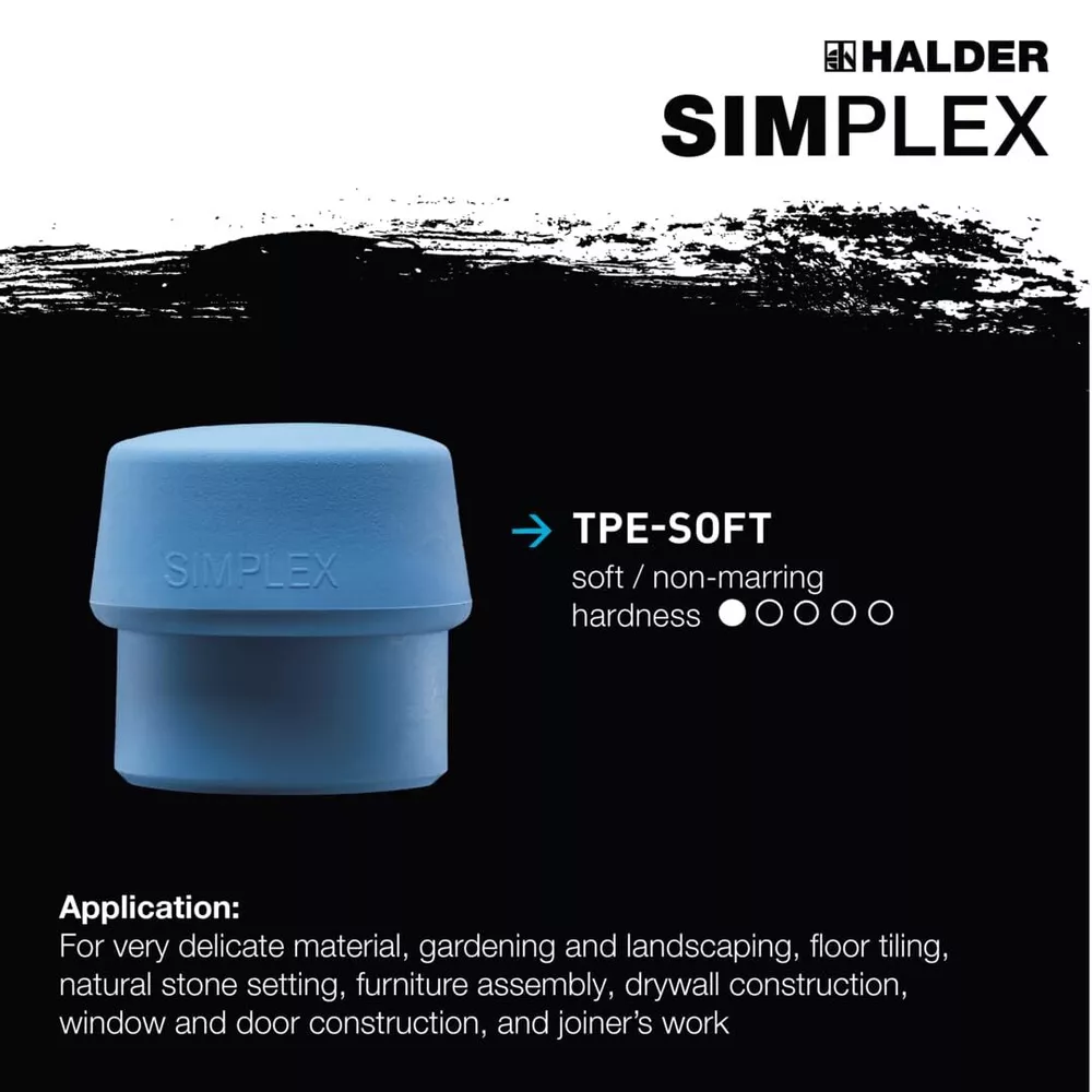 "The Simplex Mallet is the signature hammer in the line. This patented hammer has a "split housing' design that is made from heavy duty cast iron. This split housing allows it to be take apart and the components can be replaced when worn or damaged. It solidly locks in the variety of replaceable insert faces. The faces are made of several different durable materials; from soft rubber to medium hard plastic to hard nylon. also offers aluminum and copper faces for hitting very hard surfaces such as hardened steel (copper faces are only with Simplex with reinforced cast iron housing; for details). SIMPLEX soft-face mallet with the insert combination of TPE-soft (blue, soft, no marring) / TPE-mid (grey, medium hard, no marring). Cast iron housing with integrated handle protection sleeve and excellent break resistance. High-quality, vibration-damping, and ergonomically shaped wooden handle; grip area with double coat of varnish (resistant to dirt). All parts can be replaced / retrofitted, resulting in great savings in cost and resources. Available in sizes of D30mm to D60mm.