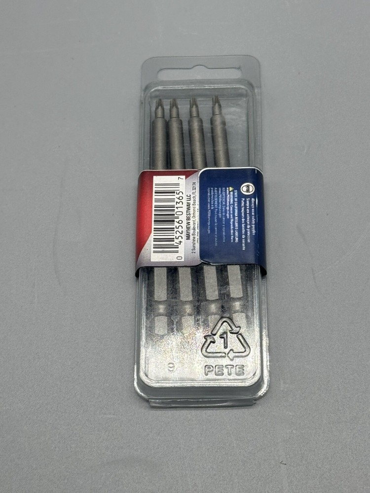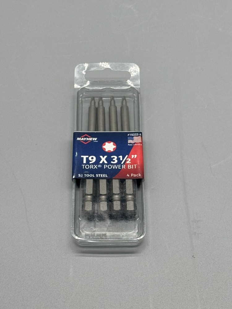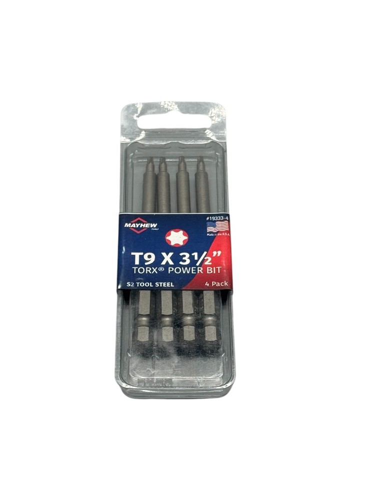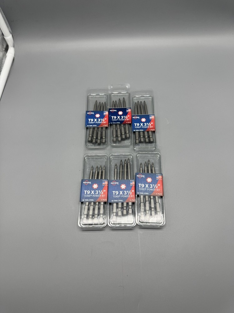 Get a great value on durable Torx power bits. This listing includes six packs, each containing four T9 Torx bits measuring 3.5 inches in length. Proudly made in the USA. Ideal for various fastening applications. Size: T9 Length: 3.5 inches Quantity: 24 bits (6 packs of 4) Made in USA