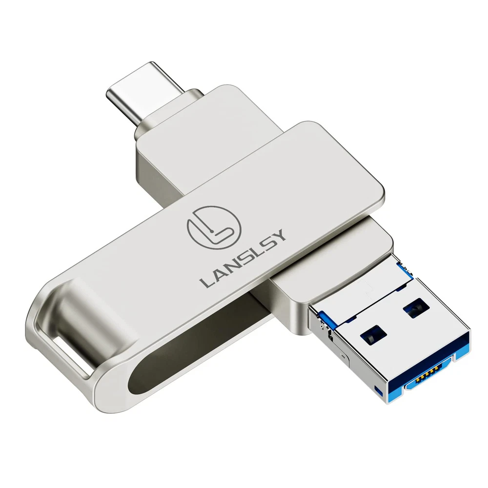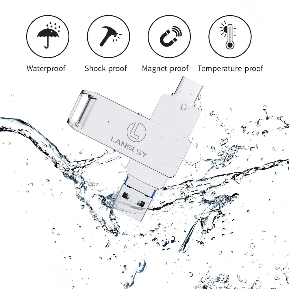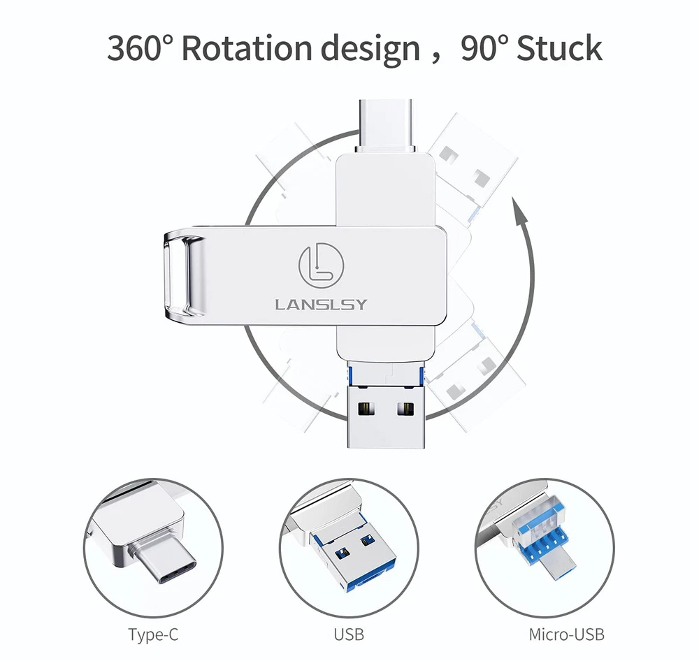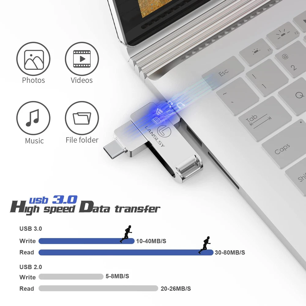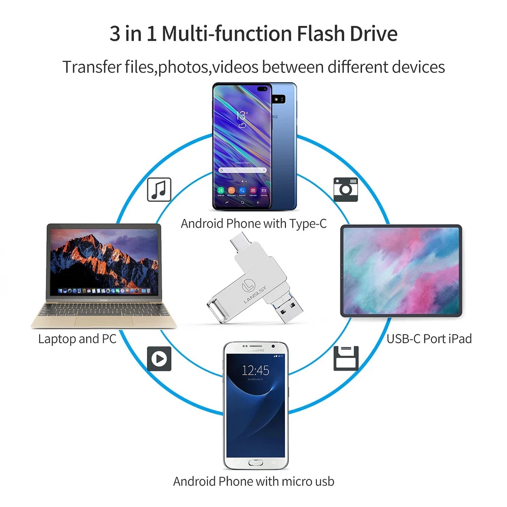 【Multi-function USB C Flash Drive 128GB】Are you sick of your phone running out of storage space?3 in 1 USB C flash drive is a great way to expand more space for your phone,and 128GB flash drive is compatible with USB2.0/3.0 interface,USB C port and micro usb port(Note:the usb c flash drive is not compatible with 1OS devices). therefore you can transfer your data(pictures,videos,files,music)between different devices. 【360°Rotating USB C flash drive,90° Stuck Point Design】Compared with traditional push-pull series USB flash drive,you don't need to hard to press and hold the button,just easy to plug or unplug the USB C drive. 【The USB C Thumb Drive Adopts USB3.0 Port】128GB USB C 3.0 memory stick transfer data much faster than the usb 2.0 port (note:the usb c flash drive is made of metal,due to the fast transmission speed,it is a normal phenomenon if it will generate heat when working).The 128GB usb flash drive will give you great flexibility when using it on either USB A or USB C ports on your laptop. 【The USB C Drive with Protective Cap &Made of Zinc Alloy Material 】the usb type c flash drive is made of metal,which has protective cap,so you can not only easily carry the external storage drive in your pocket, its connector is also protected from being damaged and dirty easily. 【The USB Drive: Your Essential Work Assistant】: Easily back up important documents to the usb c flash drive, providing an additional layer of security. This feature is especially useful for business trips or when internet access is unavailable, allowing you to preemptively save files to the usb c drive and access them anytime, anywhere. During meetings, you can also conveniently open PPT files directly from the USB drive, making it an incredibly efficient tool for your workflow.